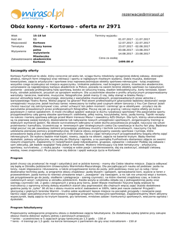 [email protected] Obóz konny - Kortowo - oferta nr 2971 Wiek 15-18 lat Ilość dni 11 01.07.2017 - 11.07.2017 Miejscowość Kortowo 12.07.2017 - 22.07.2017 Tematyka Obozy konne 23.07.2017 - 02.08.2017 Wyżywienie pełne wyżywienie 03.08.2017 - 13.08.2017 Miasteczko Zakwaterowanie akademickie Kortowo Terminy wyjazdu: 14.08.2017 - 23.08.2017 Cena za osobę 1499.00 zł Szczegóły oferty Kortowo FunFestival to obóz, który corocznie od wielu lat, sciąga tłumy młodzieży spragnionej dobrej zabawy, dziesiątki atrakcji, różnych form integracji oraz rekreacji i sportu w najlepszym możlwym wydaniu. Dobra muzyka, doborowe towarzystwo, zajęcia artystyczne i sportowe oraz najnowocześniejsze obiekty sportowo-rekreacyjne - tutaj znajdziesz wszystko czego oczekujesz od miejsca wypoczynku. Unikalnie położone, nad brzegiem jeziora, miasteczko akademickie, uznanawane za najpiękniejszy kampus akademicki w Polsce, posiada na swoim terenie obiekty sportowe na najwyższym poziomie - posiada profesjonalną halę sportową, boisko ze sztuczną trawą, stadion lekkoatletyczny, korty tenisowe, basen kryty, ośrodek jeździecki, przystań ze sprzętem wodnym. Dla uczestników obozów o profilu artystycznym przeporwadzamy warsztaty: taneczne, teatralne, muzyczne, fotograficzne. Jeżeli marzy Ci się, żeby stanąć w blasku fleszy i poczuć atmosferę teatru muzycznego, skorzystaj z warsztatów musicalowych, przeprowadzanych przez aktorów z warszawskiego Teatru Roma. Wolisz pograć na gitarze? Pod okiem profesinoalnych gitarzystów będziesz doskonalić swoje umiejętności muzyczne. Jeżeli kochasz taniec nowoczesny to trafisz pod czujnym okiem tancerzy z You Can Dance! Jeżeli chcesz nauczyć się zatrzymywać czas, umieć uchwycić ten jeden moment i zamknąć go w obiektywie - przyłącz się do warsztatów prowadzonych przez profesjonalnych fotografów. Poczuj się jak za granicą i odczuj realne efekty po kursie językowym z native speakerem. A może chciałbyś spędzić wakacje w duchu rywalizacji sportowej? Dla pasjonatów sportu przygotowaliśmy całą gamę obozów sportowych: siatkówkę, piłkę nożną, koszykówkę, tenis, jazdę konną. Tajniki recepty na sukces i karierę sportową odkryje przed Wami Ireneusz Mazur i zawodnicy AZS Olsztyn. Dla tych, którzy ukierunkowani są na poprawę swojej kondycji, doskonalenie lub nabywanie nowych umiejętności sportowych, zorganizujemy treningi w większym wymiarze godzin. Na obozie survivalowym odkryjesz w sobie ducha poszukiwacza przygód, nauczysz się sztuki przetrwania i kamuflażu. Uczestnicząc w terenowych gier strategicznych czeka Cię rywalizacja w duchu fair play. Będziesz mógł poczuć się jak zawodowy żołnierz przyswajając podstawy musztry i technik survivalowych, nauczymy Cię też udzielania pierwszej pomocy przedmedycznej. W trakcie obozu zorganizujemy zawody sportowe i turnieje, które prowadzone będą przez wykwalifikowanych instruktorów. Oprócz zajęć tematycznych przygotowaliśmy bogatą ofertę zajęć rekreacyjnych. Do wyboru będzie miał kajaki, rowery, zajęcia na siłowni, zajęcia na basenie krytym. Będą również dyskoteki, pokazy artystyczne, wycieczka do Olsztyna i ogniska, a na pamiątkę FunFestivalu dostaniesz zdjęcie ze swoimi nowymi znajomymi. Zapewnimy Ci rozwójTwoich pasji indywidualnie, grupowo, zabawnie i ciekawie! Poddaj się zabawie i sam zdecyduj, jak będzie wyglądał Twój pobyt w Kortowie. Wybierz interesujący Cię blok tematyczny - artystyczny, sportowy, survivalowy , z nauką języka - rozwijaj w sobie pasje i zainteresowania, daj się zaskoczyć, zdobądź ciekawą wiedzę, nowe znajomości. Po prostu baw się dobrze i spędź wakacje życia w Kortowie! Program Jeżeli chcesz się przekonać ile magii i satysfakcji jest w jeździe konnej – mamy dla Ciebie idealne miejsce. Zajęcia odbywać się będą w Ośrodku Jeździeckim Uniwersytetu Warmińsko-Mazurskiego. Dla początkujących nauka od podstaw: jazda na lonży, nauki stępowania i kłusowania, a także przygotowanie konia do jazdy. Jeśli podstawy masz już za sobą i teraz doskonalisz technikę jazdy, w programie obozu znajdziesz: jazdę kłusem i galopem, oprowadzanie koni, wyjście w teren z przewodnikiem. Jazda konna to również utrwalanie więzi i „oswajanie” się nawzajem, a nic tak nie umacnia więzi z koniem, jak przygotowanie go do jazdy, siodłanie i pielęgnacja – szereg czynności, na które również znajdziesz czas, w trakcie codziennych wizyt i szkolenia w ośrodku jeździeckim. Każda wizyta w ośrodku składa się z jednogodzinnej jazdy oraz szeregu czynności (ok. 2 godz.) związanych z pracą przy koniu. Jeżeli Wasze możliwości fizyczne będą większe to instruktorzy z ogromną ochotą dołożą wszelkich starań aby poprowadzić dla chętnych więcej zajęć (każda dodatkowa godzina jazdy to „tylko” 30 zł) bo z obozu musicie wrócić zadowoleni w 100%, takie jest nasze zadanie! Przyjedź i skorzystaj z pięknych terenów Warmii – trudno sobie wyobrazić lepsze miejsce na początek przygody i rozwijanie pasji. Oprócz zajęć specjalistycznych skorzystasz z bogatego programu rekreacyjno-sportowego. Zagwarantujemy Wam aktywny wypoczynek, będą zajęcia na krytym basenie, gry terenowe, mnóstwo zabaw i konkurencji sportowych, wieczorne ogniska i dyskoteki. Program fakultatywny Proponujemy wzbogacenie programu obozu o dodatkowe zajęcia fakultatywne. Za dodatkową opłatą (płatne przy zakupie obozu) można dokonać wyboru jednej z poniższych propozycji: * taniec - uczestnictwo w 5 zajęciach grupy tanecznej po 1,5 godz. – 150 zł * tenis - 4 treningi po 1,5 godz. na korcie tenisowym z partnerem do gry oraz instruktorem – 150 zł * fotografia - uczestnictwo w 5 zajęciach grupy fotograficznej po 1,5 godz. – 150 zł * gotowanie - uczestnictwo w 4 zajęciach grupy Master Cook po 2 godz. – 150 zł Zakwaterowanie Dom studencki, pokoje 2 osobowe z łazienkami. W akademiku znajduje