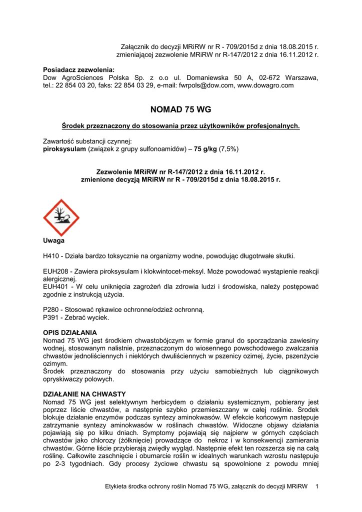 Załącznik do decyzji MRiRW nr R - 709/2015d z dnia 18.08.2015 r. zmieniającej zezwolenie MRiRW nr R-147/2012 z dnia 16.11.2012 r. Posiadacz zezwolenia: Dow AgroSciences Polska Sp. z o.o ul. Domaniewska 50 A, 02-672 Warszawa, tel.: 22 854 03 20, faks: 22 854 03 29, e-mail: [email protected], www.dowagro.com NOMAD 75 WG Środek przeznaczony do stosowania przez użytkowników profesjonalnych. Zawartość substancji czynnej: piroksysulam (związek z grupy sulfonoamidów) – 75 g/kg (7,5%) Zezwolenie MRiRW nr R-147/2012 z dnia 16.11.2012 r. zmienione decyzją MRiRW nr R - 709/2015d z dnia 18.08.2015 r. Uwaga H410 - Działa bardzo toksycznie na organizmy wodne, powodując długotrwałe skutki. EUH208 - Zawiera piroksysulam i klokwintocet-meksyl. Może powodować wystąpienie reakcji alergicznej. EUH401 - W celu uniknięcia zagrożeń dla zdrowia ludzi i środowiska, należy postępować zgodnie z instrukcją użycia. P280 - Stosować rękawice ochronne/odzież ochronną. P391 - Zebrać wyciek. OPIS DZIAŁANIA Nomad 75 WG jest środkiem chwastobójczym w formie granul do sporządzania zawiesiny wodnej, stosowanym nalistnie, przeznaczonym do wiosennego powschodowego zwalczania chwastów jednoliściennych i niektórych dwuliściennych w pszenicy ozimej, życie, pszenżycie ozimym. Środek przeznaczony do stosowania przy użyciu samobieżnych lub ciągnikowych opryskiwaczy polowych. DZIAŁANIE NA CHWASTY Nomad 75 WG jest selektywnym herbicydem o działaniu systemicznym, pobierany jest poprzez liście chwastów, a następnie szybko przemieszczany w całej roślinie. Środek blokuje działanie enzymów podczas syntezy aminokwasów. W efekcie końcowym następuje zatrzymanie syntezy aminokwasów w roślinach chwastów. Widoczne objawy działania pojawiają się po kilku dniach. Symptomy pojawiają się najpierw w górnych częściach chwastów jako chlorozy (żółknięcie) prowadzące do nekroz i w konsekwencji zamierania chwastów. Górne liście przybierają zwiędły wygląd. Następnie efekt ten rozszerza się na całą roślinę. Całkowite zaschnięcie i obumarcie roślin w idealnych warunkach wzrostu następuje po 2-3 tygodniach. Gdy procesy życiowe chwastu są spowolnione z powodu mniej Etykieta środka ochrony roślin Nomad 75 WG, załącznik do decyzji MRiRW 1 sprzyjających warunków np. niższe temperatury powietrza, pełen efekt chwastobójczy może się pojawić dopiero po 6-9 tygodniach. Głównymi widocznymi objawami działania herbicydu na chwasty jest zahamowanie wzrostu, chlorozy, a w konsekwencji nekrozy prowadzące do zamierania chwastów. Środek zwalcza chwasty, gdy minimalna temperatura dobowa w ciągu 6 dni po wykonaniu zabiegu wynosi powyżej 5ºC. Środek najskuteczniej niszczy wrażliwe chwasty dwuliścienne znajdujące się w fazie 2-6 liści (rozety), a miotłę zbożową do końca stadium fazy krzewienia. Chwasty wrażliwe: miotła zbożowa, rumian polny, samosiewy rzepaku, tasznik pospolity, maruna bezwonna, gwiazdnica pospolita, przetacznik bluszczykowy, przetacznik perski. Chwasty średnio wrażliwe: przytulia czepna, bodziszek drobny, jasnota purpurowa, niezapominajka polna, mak polny, fiołek polny. Chwasty odporne: chaber bławatek. W celu zapobiegania wystąpienia odporności miotły zbożowej na herbicyd, w zbożach uprawianych po sobie zalecane jest stosowanie środków z innych grup chemicznych o różnym mechanizmie działania. STOSOWANIE ŚRODKA Pszenica ozima, pszenżyto ozime, żyto Maksymalna dawka dla jednorazowego stosowania: 120 g/ha + Atpolan Bio 80 EC 1 l/ha lub Olstick 90 EC 1 l/ha Zalecana dawka dla jednorazowego stosowania: 100 - 120 g/ha + Atpolan Bio 80 EC 1 l/ha lub Olstick 90 EC 1 l/ha Wyższą dawkę środka stosować na plantacjach silnie zachwaszczonych oraz na chwasty bardziej zaawansowane w rozwoju. Termin stosowania: Opryskiwać wiosną po ruszeniu wegetacji roślin od fazy początku krzewienia do fazy pierwszego kolanka (początek strzelania w źdźbło) na chwasty w trakcie intensywnego wzrostu. Środek stosować wyłącznie z przebadanym i zatwierdzonym adiuwantem (środek wspomagający) np.: Atpolan Bio 80 EC 1 l/ha, Olstick 90 EC 1 l/ha Zalecana ilość wody: 150-300 l/ha Zalecane opryskiwanie: średniokropliste Maksymalna liczba zabiegów w sezonie wegetacyjnym: 1 Uwaga: Środek wnika do rośliny w ciągu 1 godziny od zastosowania. Opady deszczu po tym okresie czasu nie wpływają ujemnie na działanie środka. NASTĘPSTWO ROŚLIN Środek nie stwarza zagrożenia dla roślin uprawianych następczo. Środek Nomad 75 WG rozkłada się w glebie w ciągu okresu wegetacji nie stwarzając zagrożenia dla roślin uprawianych następczo. W przypadku wcześniejszego zaorania plantacji potraktowanej środkiem (w wyniku uszkodzenia roślin przez przymrozki, choroby lub szkodniki) na polu tym można uprawiać zboża lub kukurydzę, jednak nie wcześniej niż 4 tygodnie od zastosowania produktu i po zaoraniu plantacji na głębokość co najmniej 15 cm. Po zbiorze rośliny uprawnej można uprawiać wszystkie rośliny. Etykieta środka ochrony roślin Nomad 75 WG, załącznik do decyzji MRiRW 2 ŚRODKI OSTROŻNOŚCI I ZALECENIA STOSOWANIA ZWIĄZANE Z DOBRĄ PRAKTYKĄ ROLNICZĄ 1. Środka nie stosować: − na rośliny mokre, osłabione lub uszkodzone przez szkodniki, choroby, zalanie lub przymrozki; − w zbożach z wsiewką roślin motylkowatych i/lub traw; − gdy minimalna temperatura w dniu zabiegu oraz przez 6 kolejnych dni wynosi 5ºC lub mniej; − w temperaturze powietrza poniżej 5ºC i powyżej 25ºC; − w czasie nadmiernej suszy; − po nocnych przymrozkach oraz przed spodziewanymi przymrozkami. 2. Podczas stosowania środka nie dopuścić do: − znoszenia cieczy użytkowej na sąsiednie plantacje roślin uprawnych; − nakładania się cieczy użytkowej na stykach pasów zabiegowych i uwrociach. SPORZĄDZANIE CIECZY UŻYTKOWEJ Przed przystąpieniem do sporządzania cieczy użytkowej dokładnie ustalić potrzebną jej ilość. 