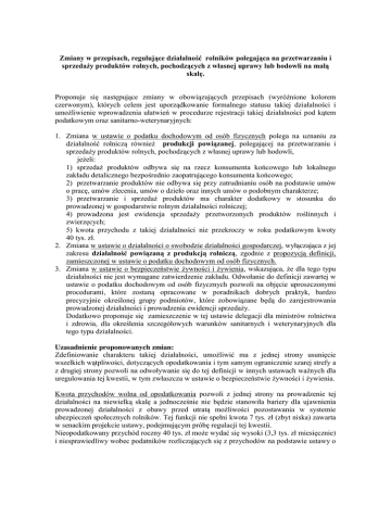 Zmiany w przepisach, regulujące działalność rolników polegająca na przetwarzaniu i sprzedaży produktów rolnych, pochodzących z własnej uprawy lub hodowli na małą skalę. Proponuje się następujące zmiany w obowiązujących przepisach (wyróżnione kolorem czerwonym), których celem jest uporządkowanie formalnego statusu takiej działalności i umożliwienie wprowadzenia ułatwień w procedurze rejestracji takiej działalności pod kątem podatkowym oraz sanitarno-weterynaryjnych: 1. Zmiana w ustawie o podatku dochodowym od osób fizycznych polega na uznaniu za działalność rolniczą również produkcji powiązanej, polegającej na przetwarzaniu i sprzedaży produktów rolnych, pochodzących z własnej uprawy lub hodowli, jeżeli: 1) sprzedaż produktów odbywa się na rzecz konsumenta końcowego lub lokalnego zakładu detalicznego bezpośrednio zaopatrującego konsumenta końcowego;; 2) przetwarzanie produktów nie odbywa się przy zatrudnianiu osób na podstawie umów o pracę, umów zlecenia, umów o dzieło oraz innych umów o podobnym charakterze;; 3) przetwarzanie i sprzedaż produktów ma charakter dodatkowy w stosunku do prowadzonej w gospodarstwie rolnym działalności rolniczej;; 4) prowadzona jest ewidencja sprzedaży przetworzonych produktów roślinnych i zwierzęcych;; 5) kwota przychodu z takiej działalności nie przekroczy w roku podatkowym kwoty 40 tys. zł. 2. Zmiana w ustawie o działalności o swobodzie działalności gospodarczej, wyłączająca z jej zakresu działalność powiązaną z produkcją rolniczą, zgodnie z propozycją definicji, zamieszczonej w ustawie o podatku dochodowym od osób fizycznych. 3. Zmiana w ustawie o bezpieczeństwie żywności i żywienia, wskazująca, że dla tego typu działalności nie jest wymagane zatwierdzenie zakładu. Odwołanie do definicji zawartej w ustawie o podatku dochodowym od osób fizycznych pozwoli na objęcie uproszczonymi procedurami, które zostaną opracowane w poradnikach dobrych praktyk, bardzo precyzyjnie określonej grupy podmiotów, które zobowiązane będą do zarejestrowania prowadzonej działalności i prowadzenia ewidencji sprzedaży. Dodatkowo proponuje się zamieszczenie w tej ustawie delegacji dla ministrów rolnictwa i zdrowia, dla określenia szczegółowych warunków sanitarnych i weterynaryjnych dla tego typu działalności. Uzasadnienie proponowanych zmian: Zdefiniowanie charakteru takiej działalności, umożliwić ma z jednej strony usunięcie wszelkich wątpliwości, dotyczących opodatkowania i tym samym ograniczenie szarej strefy a z drugiej strony pozwoli na odwoływanie się do tej definicji w innych ustawach ważnych dla uregulowania tej kwestii, w tym zwłaszcza w ustawie o bezpieczeństwie żywności i żywienia. Kwota przychodów wolna od opodatkowania pozwoli z jednej strony na prowadzenie tej działalności na niewielką skalę a jednocześnie nie będzie stanowiła bariery dla ujawnienia prowadzonej działalności z obawy przed utratą możliwości pozostawania w systemie ubezpieczeń społecznych rolników. Tej funkcji nie spełni kwota 7 tys. zł (zbyt niska) zawarta w senackim projekcie ustawy, podejmującym próbę regulacji tej kwestii. Nieopodatkowany przychód roczny 40 tys. zł może wydać się wysoki (3,3 tys. zł miesięcznie) i niesprawiedliwy wobec podatników rozliczających się z przychodów na podstawie ustawy o podatku od osób fizycznych. Trzeba jednak wziąć pod uwagę, że w proponowanym systemie nie ma żadnej możliwości zwrotu poniesionych kosztów na produkcję. Jeżeli założona rentowność prowadzonej działalności będzie na poziomie 15%, wówczas proponowana kwota zwiększa dochody rolnika o 500,zł miesięcznie, czyli pozwala uzyskać niewielkie dodatkowe dochody w systemie produkcji powiązanej, które mogą mieć istotne znaczenie dla małych gospodarstw lub zachęcić bardziej energicznych rolników do wdrożenia produkcji na większą skalę, już w standardowym systemie działalności gospodarczej. Rozszerzenie zakresu sprzedaży o jedno ogniwo w stosunku do propozycji senackiego projektu ustawy (lokalny sklep, lokalna restauracja), jest zgodne z celami WPR, w której wspieranie krótkich łańcuchów sprzedaży i bezpośrednich powiązań pomiędzy rolnikami i lokalnymi sprzedawcami detalicznymi jest jednym z priorytetów. Jest to również zgodne z przyjętą przez Rząd „Strategią zrównoważonego rozwoju wsi, rolnictwa i rybactwa”. Ustawa o podatku dochodowym od osób fizycznych zmiany w obowiązujących przepisach wyróżniono kolorem czerwonym Art. 2 [Wyłączenia przedmiotowe] 1. Przepisów ustawy nie stosuje się do: 1) przychodów z działalności rolniczej, z wyjątkiem przychodów z działów specjalnych produkcji rolnej; (…) 2. Działalnością rolniczą, w rozumieniu ust. 1 pkt 1, jest działalność polegająca na wytwarzaniu produktów roślinnych lub zwierzęcych w stanie nieprzetworzonym (naturalnym) z własnych upraw albo hodowli lub chowu, w tym również produkcja materiału siewnego, szkółkarskiego, hodowlanego oraz reprodukcyjnego, produkcja warzywnicza gruntowa, szklarniowa i pod folią, produkcja roślin ozdobnych, grzybów uprawnych i sadownicza, hodowla i produkcja materiału zarodowego zwierząt, ptactwa i owadów użytkowych, produkcja zwierzęca typu przemysłowo-fermowego oraz hodowla ryb, a także działalność, w której minimalne okresy przetrzymywania zakupionych zwierząt i roślin, w trakcie których następuje ich biologiczny wzrost, wynoszą co najmniej: 1) miesiąc - w przypadku roślin, 2) 16 dni - w przypadku wysokointensywnego tuczu specjalizowanego gęsi lub kaczek, 3) 6 tygodni - w przypadku pozostałego drobiu rzeźnego, 4) 2 miesiące - w przypadku pozostałych zwierząt - licząc od dnia nabycia. 2a. Działalnością rolniczą jest również produkcja powiązana, polegająca na przetwarzaniu i sprzedaży produktów rolnych, pochodzących z własnej uprawy lub hodowli, niest