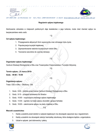 19-300 Ełk ul.Parkowa 12 tel./fax: (087)6101624 e -mail: [email protected] www.cee.elk.pl Regulamin spływu kajakowego Zachowanie człowieka w miejscach publicznych daje świadectwo o jego kulturze, może mieć również wpływ na bezpieczeństwo wielu osób. 1§ Cel spływu kajakowego: 1. Propagowanie aktywnych form wypoczynku oraz zdrowego trybu życia; 2. Popularyzacja turystyki kajakowej; 3. Zaprezentowanie walorów turystycznych okolic Ełku; 4. Tworzenie warunków do czynnej rekreacji. 2§ Organizator spływu kajakowego: Centrum Edukacji Ekologicznej w Ełku oraz Towarzystwo Krajoznawstwa i Turystyki Aktywnej. 3§ Termin spływu : 21 marca 2015r Godz.: 09:00 – 16:00 4§ Organizacja spływu: Trasa: CEE w Ełku – Straduny - Ełk 1. Godz.: 9:00 – zbiórka przed brama Centrum Edukacji Ekologicznej w Ełku 2. Godz.: 9:15 – przejazd autokarem do Stradun 3. Godz.: 10:00 – rozpoczęcie zimowego spływu kajakowego 4. Godz.: 13:30 – ognisko na trasie spływu (kociołek i gorąca herbata) 5. Godz.: 16:00 – zakończenie spływu na plaży miejskiej w Ełku. 5§ Warunki uczestnictwa: 1. Każdy uczestnik przed startem w spływie kajakowym ma obowiązek zapoznać się z regulaminem. 2. Każdy uczestnik ma obowiązek założyć kamizelkę ratunkową, która dostępna będzie u organizatora. 3. Udział w spływie jest dobrowolny i płatny. Miasto Ełk 19-300 Ełk 4. ul.Parkowa 12 tel./fax: (087)6101624 e -mail: [email protected] www.cee.elk.pl Opłatę organizacyjną w kwocie 35,00 zł / os. należy uiścić w Centrum Edukacji Ekologicznej w Ełku, ul. Parkowa 12 do dnia 19 marca 2015 r do godziny 14:00. 5. Zapisy należy dokonywać poprzez: 6. - kontakt telefoniczny pod nr tel. 87 610 16 24 7. - osobiście w CEE w Ełku, ul. Parkowa 12, 19-300 Ełk, w godz. 8.00-16.00 8. - kontakt e-mailowy: [email protected] 9. Zapisy prowadzone są do dnia 19 marca 2015r. do godziny 14:00 10. Przy zapisach decyduje kolejność zgłoszeń. 11. Osoby niepełnoletnie mogą brać udział w spływie pod opieką osoby dorosłej, biorącej na siebie całkowitą odpowiedzialność za ich bezpieczeństwo lub za pisemną zgodą rodzica bądź opiekuna prawnego. 6§ Zasady zachowania uczestników spływu kajakowego: Każdy uczestnik powinien: 1. Przestrzegać regulaminu spływu oraz poleceń prowadzących i organizatora. 2. Przed wyruszeniem prowadzący spływ omówi trasę spływu z uwzględnieniem miejsc niebezpiecznych, stwarzających zagrożenie. 3. Zabrania się płynięcia na wierzchu kajaka, wyprzedzania otwierającego spływ oraz pozostawania za zamykającym spływ. 4. Uczestnicy spływu są zobowiązani do przestrzegania przepisów prawa wodnego, ochrony przyrody oraz karty turysty. 5. Uczestnicy spływu przed wypłynięciem mają obowiązek sprawdzić stan sprzętu pływającego. 6. Wszyscy uczestnicy spływu zobowiązani są do płynięcia w zapiętej kamizelce. 7§ Na trasie zabrania się: 1. Zaśmiecania rzeki oraz miejsc przyległych; 2. Głośnego zachowywania się; 3. Zbaczania z trasy spływu bez zgody organizatora. 8§ Odpowiedzialność organizatora: Miasto Ełk 19-300 Ełk ul.Parkowa 12 tel./fax: (087)6101624 e -mail: [email protected] www.cee.elk.pl 1. Organizatorzy spływu kajakowego nie przyjmują odpowiedzialności za wypadki i szkody wynikłe w czasie spływu zarówno wobec uczestników spływu jak i osób trzecich. 2. Udział w spływie kajakowym jest dobrowolny . 3. Organizator nie ponosi odpowiedzialności za rzeczy zgubione podczas imprezy i za szkody wyrządzone przez uczestników. 4. Organizator nie zapewnia miejsca do przechowywania rzeczy uczestników. Organizatorzy zapewniają: ubezpieczenie uczestników; apteczkę pierwszej pomocy; ciepły posiłek na trasie spływu (ognisko z kociołkiem i gorącą herbatą) wypożyczenie kajaków; transport kajaków transport uczestników busem do Stradun. 9§ Postanowienia końcowe: 1. Wszyscy uczestnicy startując w spływie kajakowym wyrażają zgodę na publikację ich wizerunków w relacjach w przebiegu spływu, zamieszczonych w mediach. 2. Udział w spływie jest równoznaczny z zapoznaniem się i akceptacją niniejszego regulaminu. 3. Ostateczna interpretacja regulaminu należy do organizatora. W sprawach spornych decyzja organizatora jest decyzją ostateczną. Miasto Ełk