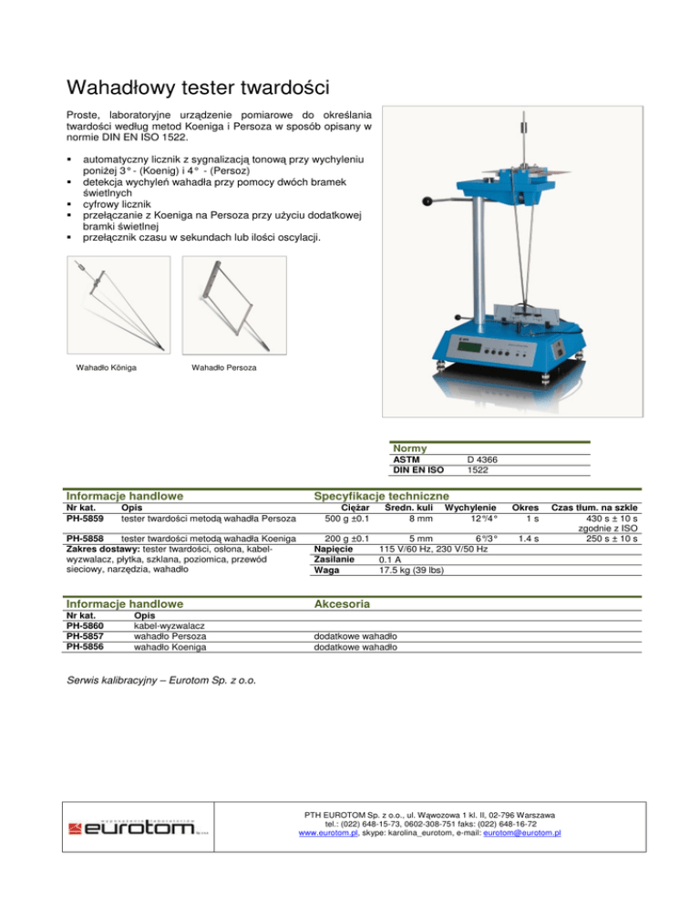 Wahadłowy tester twardości Proste, laboratoryjne urządzenie pomiarowe do określania twardości według metod Koeniga i Persoza w sposób opisany w normie DIN EN ISO 1522. automatyczny licznik z sygnalizacją tonową przy wychyleniu poniżej 3° - (Koenig) i 4° - (Persoz) detekcja wychyleń wahadła przy pomocy dwóch bramek świetlnych cyfrowy licznik przełączanie z Koeniga na Persoza przy użyciu dodatkowej bramki świetlnej przełącznik czasu w sekundach lub ilości oscylacji. Wahadło Königa Wahadło Persoza Normy ASTM DIN EN ISO Informacje handlowe Nr kat. PH-5859 Opis tester twardości metodą wahadła Persoza D 4366 1522 Specyfikacje techniczne Wychylenie 12°/4° Okres 1s PH-5858 tester twardości metodą wahadła Koeniga Zakres dostawy: tester twardości, osłona, kabelwyzwalacz, płytka, szklana, poziomica, przewód sieciowy, narzędzia, wahadło 200 g ±0.1 5 mm 6°/3° Napięcie 115 V/60 Hz, 230 V/50 Hz Zasilanie 0.1 A Waga 17.5 kg (39 lbs) 1.4 s Informacje handlowe Akcesoria Nr kat. PH-5860 PH-5857 PH-5856 dodatkowe wahadło dodatkowe wahadło Opis kabel-wyzwalacz wahadło Persoza wahadło Koeniga Ciężar 500 g ±0.1 Średn. kuli 8 mm Czas tłum. na szkle 430 s ± 10 s zgodnie z ISO 250 s ± 10 s Serwis kalibracyjny – Eurotom Sp. z o.o. PTH EUROTOM Sp. z o.o., ul. Wąwozowa 1 kl. II, 02-796 Warszawa tel.: (022) 648-15-73, 0602-308-751 faks: (022) 648-16-72 www.eurotom.pl, skype: karolina_eurotom, e-mail: [email protected]