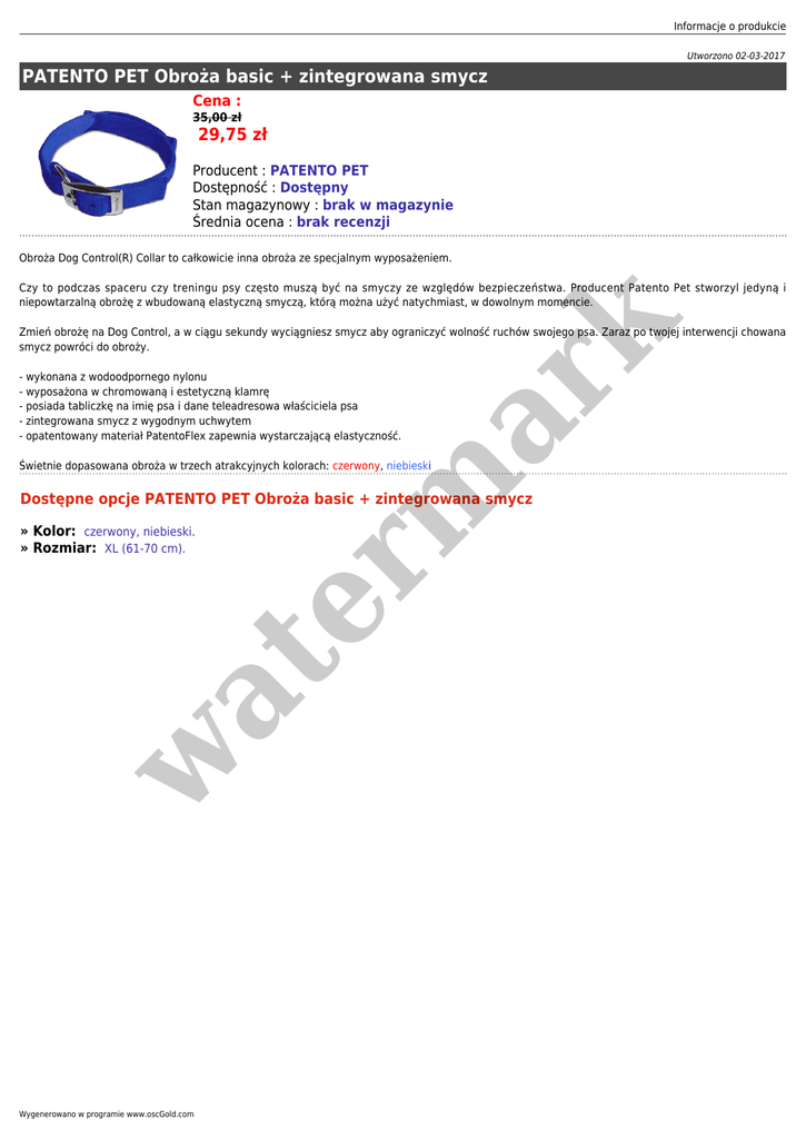 Informacje o produkcie Utworzono 02-03-2017 PATENTO PET Obroża basic + zintegrowana smycz Cena : 35,00 zł 29,75 zł Producent : PATENTO PET Dostępność : Dostępny Stan magazynowy : brak w magazynie Średnia ocena : brak recenzji Obroża Dog Control(R) Collar to całkowicie inna obroża ze specjalnym wyposażeniem. er m ar k Czy to podczas spaceru czy treningu psy często muszą być na smyczy ze względów bezpieczeństwa. Producent Patento Pet stworzyl jedyną i niepowtarzalną obrożę z wbudowaną elastyczną smyczą, którą można użyć natychmiast, w dowolnym momencie. Zmień obrożę na Dog Control, a w ciągu sekundy wyciągniesz smycz aby ograniczyć wolność ruchów swojego psa. Zaraz po twojej interwencji chowana smycz powróci do obroży. - wykonana z wodoodpornego nylonu - wyposażona w chromowaną i estetyczną klamrę - posiada tabliczkę na imię psa i dane teleadresowa właściciela psa - zintegrowana smycz z wygodnym uchwytem - opatentowany materiał PatentoFlex zapewnia wystarczającą elastyczność. Świetnie dopasowana obroża w trzech atrakcyjnych kolorach: czerwony, niebieski Dostępne opcje PATENTO PET Obroża basic + zintegrowana smycz w at » Kolor: czerwony, niebieski. » Rozmiar: XL (61-70 cm). Wygenerowano w programie www.oscGold.com