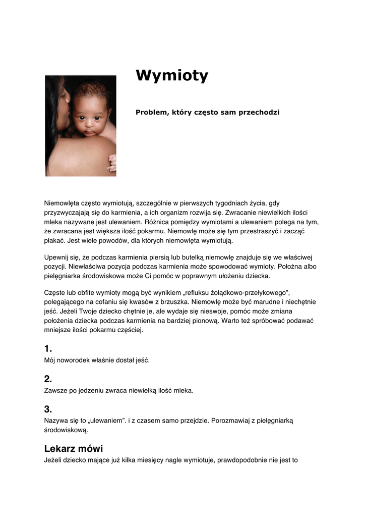 Wymioty Problem, który często sam przechodzi Niemowlęta często wymiotują, szczególnie w pierwszych tygodniach życia, gdy przyzwyczajają się do karmienia, a ich organizm rozwija się. Zwracanie niewielkich ilości mleka nazywane jest ulewaniem. Różnica pomiędzy wymiotami a ulewaniem polega na tym, że zwracana jest większa ilość pokarmu. Niemowlę może się tym przestraszyć i zacząć płakać. Jest wiele powodów, dla których niemowlęta wymiotują. Upewnij się, że podczas karmienia piersią lub butelką niemowlę znajduje się we właściwej pozycji. Niewłaściwa pozycja podczas karmienia może spowodować wymioty. Położna albo pielęgniarka środowiskowa może Ci pomóc w poprawnym ułożeniu dziecka. Częste lub obfite wymioty mogą być wynikiem „refluksu żołądkowo-przełykowego”, polegającego na cofaniu się kwasów z brzuszka. Niemowlę może być marudne i niechętnie jeść. Jeżeli Twoje dziecko chętnie je, ale wydaje się nieswoje, pomóc może zmiana położenia dziecka podczas karmienia na bardziej pionową. Warto też spróbować podawać mniejsze ilości pokarmu częściej. 1. Mój noworodek właśnie dostał jeść. 2. Zawsze po jedzeniu zwraca niewielką ilość mleka. 3. Nazywa się to „ulewaniem”. i z czasem samo przejdzie. Porozmawiaj z pielęgniarką środowiskową. Lekarz mówi Jeżeli dziecko mające już kilka miesięcy nagle wymiotuje, prawdopodobnie nie jest to ulewanie, ale grypa żołądkowa. Jest to wirusowe zakażenie przewodu pokarmowego, któremu może towarzyszyć rozwolnienie (biegunka). U niemowląt choroba ta jest poważniejsza niż u starszych dzieci, ponieważ szybciej się odwadniają. Odwodnione dziecko może za mało siusiać, stracić apetyt i mieć zimne dłonie i stopy. Jeżeli dziecko sprawia wrażenie chorego, wymiotują żółcią zabarwioną na zielono albo wymioty trwają dłużej niż jeden dzień, od razu skonsultuj się z lekarzem pierwszego kontaktu. Pielęgniarka środowiskowa mówiUlewanie podczas karmienia lub po nim jest normalne. Jeżeli ma miejsce pomiędzy karmieniami, przyczyną może być wirusowe zakażenie przewodu pokarmowego. Niemowlętom trzeba podawać dużo płynów, żeby nie dopuścić do odwodnienia.