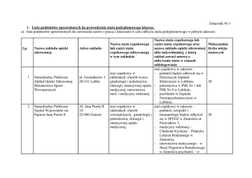 Załącznik Nr 1 1. Lista podmiotów uprawnionych do prowadzenia stażu podyplomowego lekarza: a) lista podmiotów uprawnionych do zawierania umów o pracę z lekarzami w celu odbycia stażu podyplomowego w pełnym zakresie: Lp. 1 2 Nazwa zakładu opieki zdrowotnej Adres zakładu Samodzielny Publiczny Zakład Opieki Zdrowotnej Ministerstwa Spraw Wewnętrznych ul. Grenadierów 3 20-331 Lublin Samodzielny Publiczny Szpital Wojewódzki im. Papieża Jana Pawła II Al. Jana Pawła II 10 22-400 Zamość Nazwa stażu cząstkowego lub części stażu cząstkowego oraz nazwa zakładu opieki zdrowotnej albo indywidualnej, z którą zakład zawarł umowę o odbywanie stażu w ramach oddelegowania staż cząstkowy w zakresie: staż cząstkowy w - pediatrii będzie odbywał się w oddziałach: chorób wewn., Dziecięcym Szpitalu ginekologii i położnictwa, Klinicznym w Lublinie, chirurgii, intensywnej opieki - położnictwa w PSK Nr 1 lub medycznej, ratownictwa PSK Nr 4 w Lublinie, med. i medycyny rodzinnej - psychiatrii w Szpitalu Neuropsychiatrycznym w Lublinie, staż cząstkowy w staż cząstkowy w zakresie: oddziałach: chorób - pediatrii, ortopedii i wewnętrznych, ginekologii i traumatologii będzie odbywał położnictwa, chirurgii i się w SPZOZ w Zamościu ul. intensywnej opieki Peowiaków 1, medycznej, - medycyny rodzinnej – Chudziak Krystyna – Praktyka Lekarza Rodzinnego w Zamościu, - ratownictwa medycznego – w Stacji Pogotowia Ratunkowego w Zamościu psychiatrii – w Nazwa stażu cząstkowego lub części stażu cząstkowego odbywanego w tym zakładzie Maksymalna liczba miejsc stażowych 30 20 3 Wojewódzki Szpital Specjalistyczny ul. Terebelska 57/65 21-500 Biała Podlaska 4 Samodzielny Publiczny Szpital Kliniczny Nr 1 ul. Staszica 16 20-081 Lublin 5 Samodzielny Publiczny Szpital Kliniczny Nr 4 ul. Jaczewskiego 8 20-954 Lublin Szpitalu Psychiatrycznym w Radecznicy staż cząstkowy w zakresie: - psychiatrii – w Oddziale staż cząstkowy w Psychiatrycznym SPZOZ w 16 oddziałach: chorób Radzyniu Podlaskim, wewnętrznych, ginekologii i - medycyny rodzinnej – w położnictwa, chirurgii, Niepublicznym ZOZ – intensywnej opieki Przychodnia Rejonowa Nr 3 w medycznej, pediatrii Białej Podl., - ratownictwa medycznego – Stacji Pogotowia Ratunkowego w Białej Podlaskiej staż cząstkowy w zakresie: - pediatrii będzie odbywał się w staż cząstkowy w Dziecięcym Szpitalu oddziałach: chorób Klinicznym w Lublinie, wewnętrznych, ginekologii i - medycyny rodzinnej – w ZOZ 22 położnictwa, chirurgii, Lublin intensywnej opieki medycznej i psychiatrii staż cząstkowy w staż cząstkowy w zakresie: oddziałach: chorób - pediatrii będzie odbywał się w wewnętrznych, ginekologii i Dziecięcym Szpitalu położnictwa, chirurgii i Klinicznym w Lublinie, 37 intensywnej opieki - psychiatrii – w Szpitalu medycznej Neuropsychiatrycznym w Lublinie - medycyny rodzinnej – w Niepublicznym ZOZ w Lublinie ul. Jagiełły 20, Załącznik nr 1 do Zarządzenia Marszałka Województwa Lubelskiego w sprawie ustalenia listy zakładów opieki zdrowotnej uprawnionych do prowadzenia staży podyplomowych lekarzy i lekarzy dentystów Strona 2 z 19 6 7 I Wojskowy Szpital Kliniczny z Polikliniką staż cząstkowy w oddziałach: chorób Al. Racławickie 23 wewnętrznych, chirurgii, 20-904 Lublin intensywnej opieki medycznej, medycyny rodzinnej Samodzielny Publiczny Szpital Wojewódzki im. Jana Bożego ul. Biernackiego 9 20-089 Lublin staż cząstkowy w zakresie: - pediatrii będzie odbywał się w Dziecięcym Szpitalu Klinicznym w Lublinie, - psychiatrii – w Szpitalu Neuropsychiatrycznym w Lublinie - ginekologii i położnictwa – w PSK Nr 4 w Lublinie staż cząstkowy z zakresu: staż cząstkowy w zakresie: - chorób wewnętrznych – - psychiatrii – w Samodzielnym Oddział Internistyczny, ul. Publicznym Szpitalu Biernackiego 9, Klinicznym Nr 1 w Lublinie - medycyny ratunkowej w pediatrii – Oddział Wojewódzkim Szpitalu Chorób Zakaźnych Specjalistycznym im. Stefana Dziecięcych, ul. Kardynała Wyszyńskiego Biernackiego 9, SPZOZ w Lublinie, Al. neonatologii – Kraśnicka 100 Oddział Noworodków i Wcześniaków, ul. Lubartowska 81 ginekologii i położnictwa – Oddział Ginekologii, Oddział Położniczy z Oddziałem Patologii Ciąży, ul. Lubartowska 81, 39 20 Załącznik nr 1 do Zarządzenia Marszałka Województwa Lubelskiego w sprawie ustalenia listy zakładów opieki zdrowotnej uprawnionych do prowadzenia staży podyplomowych lekarzy i lekarzy dentystów Strona 3 z 19 8 9 Samodzielny Publiczny Wojewódzki Szpital Specjalistyczny Samodzielny Publiczny Zespół Opieki Zdrowotnej - chirurgii – Oddział Chirurgii z Pododdziałem Laryngologii, ul. Kruczkowskiego 21 anestezjologii i intensywnej terapii – Oddział Anestezjologii i Intensywnej Terapii, ul. Kruczkowskiego 21, anestezjologii – w Oddziale Anestezjologii, ul. Lubartowska 81, medycyny rodzinnej – Przychodnia POZ, ul. Kruczkowskiego 21 ul. Ceramiczna 1 staż cząstkowy w 22-100 Chełm oddziałach: chorób wewnętrznych, ginekologii i położnictwa, chirurgii, intensywnej opieki medycznej, pediatrii, psychiatrii, ratownictwa med. ul.Sobieskiego 4B staż cząstkowy w 22-300 Krasnystaw oddziałach: chorób wewnętrznych, ginekologii i staż cząstkowy w zakresie medycyny rodzinnej będzie odbywał się w Miejskim Publicznym Zakładzie Opieki Zdrowotnej w Chełmie staż cząstkowy w zakresie psychiatrii będzie odbywał się w Oddziale Psychiatrycznym w SP 8 5 Załącznik nr 1 do Zarządzenia Marszałka Województwa Lubelskiego w sprawie ustalenia listy zakładów opieki zdrowotnej uprawnionych do prowadzenia staży podyplomowych lekarzy i lekarzy dentystów Strona 4 z 19 10 Samodzielny Publiczny Zakład Opieki Zdrowotnej 11 Samodzielny Publiczny Zakład Opieki Zdrowotnej 12 Samodzielny Publiczny Zakład Opieki Zdrowotnej Samodzielny Publiczny 13 Zakład Opieki Zdrowotnej ul. Chopina 13 23-200 Kraśnik ul. Cicha 14 21-100 Luba