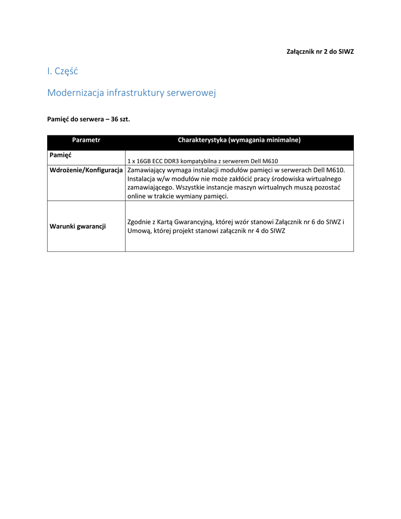 Załącznik nr 2 do SIWZ I. Część Modernizacja infrastruktury serwerowej Pamięć do serwera – 36 szt. Parametr Pamięć Charakterystyka (wymagania minimalne) 1 x 16GB ECC DDR3 kompatybilna z serwerem Dell M610 Wdrożenie/Konfiguracja Zamawiający wymaga instalacji modułów pamięci w serwerach Dell M610. Instalacja w/w modułów nie może zakłócić pracy środowiska wirtualnego zamawiającego. Wszystkie instancje maszyn wirtualnych muszą pozostać online w trakcie wymiany pamięci. Warunki gwarancji Zgodnie z Kartą Gwarancyjną, której wzór stanowi Załącznik nr 6 do SIWZ i Umową, której projekt stanowi załącznik nr 4 do SIWZ Zintegrowany pakiet oprogramowania do tworzenia i zarządzania środowiskami wirtualnymi z oprogramowaniem systemowym wraz z wdrożeniem– 3 szt. Parametr Charakterystyka (wymagania minimalne) Oprogramowanie Zintegrowany pakiet oprogramowania do tworzenia i zarządzania środowiskami wirtualnymi Licencja oprogramowania zarządzania środowiskami serwerowymi musi być przypisana do każdego procesora fizycznego na serwerze zarządzanym. Oprogramowanie musi być licencjonowane na minimum 2 fizyczne procesory serwera zarządzanego. Liczba rdzeni procesorów i ilość pamięci nie mogą mieć wpływu na liczbę wymaganych licencji. Każda licencja na 2 fizyczne procesory serwera musi uprawniać do zarządzania nielimitowaną ilością środowisk systemu operacyjnego na tym serwerze. Zarządzanie serwerem musi obejmować wszystkie funkcje zawarte w opisanych poniżej modułach: System zarządzania infrastrukturą i oprogramowaniem System zarządzania komponentami System zarządzania środowiskami wirtualnym System tworzenia kopii zapasowych System automatyzacji zarządzania środowisk IT System zarządzania incydentami i problemami Ochrona antymalware System zarządzania infrastrukturą i oprogramowaniem System zarządzania infrastrukturą i oprogramowaniem musi spełniać następujące wymagania poprzez wbudowane mechanizmy, bez użycia dodatkowych aplikacji. 1. 2. Inwentaryzacja i zarządzanie zasobami: a. Inwentaryzacja zasobów serwera powinna się odbywać w określonych przez administratora systemu interwałach czasowych. System powinien mieć możliwość odrębnego planowania inwentaryzacji sprzętu i oprogramowania b. Inwentaryzacja sprzętu powinna się odbywać przez pobieranie informacji z interfejsu WMI, komponent inwentaryzacyjny powinien mieć możliwość konfiguracji w celu ustalenia informacji, o jakich podzespołach będą przekazywane do systemu c. Inwentaryzacja oprogramowania powinna skanować zasoby dyskowe przekazując dane o znalezionych plikach do systemu w celu identyfikacji oprogramowania oraz celów wyszukiwania i gromadzenia informacji o szczególnych typach plików (np. pliki multimedialne: wav, mp3, avi, xvid, itp…) d. System powinien posiadać własną bazę dostępnego na rynku komercyjnego oprogramowania, pozwalającą na identyfikację zainstalowanego i użytkowanego oprogramowania. System powinien dawać możliwość aktualizacji tej bazy przy pomocy konsoli administratora oraz automatycznie przez aktualizacje ze stron producenta e. Informacje inwentaryzacyjne powinny być przesyłane przy pomocy plików różnicowych w celu ograniczenia ruchu z agenta do serwera Użytkowane oprogramowanie – pomiar wykorzystania a. 3. 4. 5. 6. System powinien mieć możliwość zliczania uruchomionego oprogramowania w celu śledzenia wykorzystania b. Reguły dotyczące monitorowanego oprogramowania powinny być tworzone automatycznie przez skanowanie oprogramowania uruchamianego. System powinien dostarczać funkcje dystrybucji oprogramowania, dystrybucja i zarządzania aktualizacjami, instalacja/aktualizacja systemów operacyjnych. Definiowanie i sprawdzanie standardu serwera: a. System powinien posiadać komponenty umożliwiające zdefiniowanie i okresowe sprawdzanie standardu serwera, standard ten powinien być określony zestawem reguł sprawdzających definiowanych z poziomu konsoli administracyjnej, b. Reguły powinny sprawdzać następujące elementy systemy komputerowego: - stan usługi (Windows Service) - obecność poprawek (Hotfix) - WMI - rejestr systemowy - system plików - Active Directory - SQL (query) - Metabase Raportowanie, prezentacja danych: a. System powinien posiadać komponent raportujący oparty o technologie webową (wydzielony portal z raportami) i/lub b. Wykorzystujący mechanizmy raportujące dostarczane wraz z silnikami bazodanowymi, np. SQL Reporting Services c. System powinien posiadać predefiniowane raport w następujących kategoriach: - Sprzęt (inwentaryzacja) - Oprogramowanie (inwentaryzacja) - Oprogramowanie (wykorzystanie) - Oprogramowanie (aktualizacje, w tym system operacyjny) d. System powinien umożliwiać budowanie stron z raportami w postaci tablic (dashboard), na których może znajdować się więcej niż jeden raport e. System powinien posiadać konsolę administratora, w postaci programu do zainstalowania na stacjach roboczych, obsługującą wszystkie funkcje systemu Analiza działania systemu, logi, komponenty a. Konsola systemu powinna dawać dostęp do podstawowych logów obrazujących pracę poszczególnych komponentów, wraz z oznaczaniem stanu (OK, Warning, Error) w przypadku znalezienia zdarzeń wskazujących na problemy b. Konsola systemu powinna umożliwiać podgląd na stan poszczególnych usług wraz z podstawowymi informacjami o stanie usługi, np. ilość wykorzystywanego miejsca na dysku twardym. System zarządzania komponentami System zarządzania komponentami musi udostępniać funkcje pozwalające na budowę bezpiecznych i skalowalnych mechanizmów zarządzania komponentami IT spełniając następujące wymagania: 1. Architektura a. Serwery zarządzające muszą mieć możliwość publikowania informacji o uruchomionych komponentach w usługach katalogowych, informacje te powinny być odstępne dla klientów systemu w celu automatycznej konfiguracji. b. Możliwoś