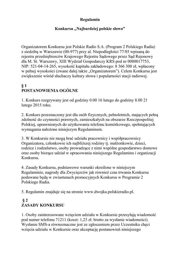 Regulamin Konkursu „Najbardziej polskie słowo” Organizatorem Konkursu jest Polskie Radio S.A. (Program 2 Polskiego Radia) z siedzibą w Warszawie (00-977) przy al. Niepodległości 77/85 wpisaną do rejestru przedsiębiorców Krajowego Rejestru Sądowego przez Sąd Rejonowy dla M. St. Warszawy, XIII Wydział Gospodarczy KRS pod nr 0000017753, NIP: 521-04-14-265, wysokość kapitału zakładowego: 8 366 300 zł, wpłacony w pełnej wysokości (zwane dalej także „Organizatorem”). Celem Konkursu jest zwiększenie wśród słuchaczy kultury słowa i popularności stacji radiowej. §1 POSTANOWIENIA OGÓLNE 1. Konkurs rozgrywany jest od godziny 0.00 16 lutego do godziny 8.00 21 lutego 2015 roku. 2. Konkurs przeznaczony jest dla osób fizycznych, pełnoletnich, mających pełną zdolność do czynności prawnych, zamieszkałych na obszarze Rzeczpospolitej Polskiej, uprawnionych do użytkowania telefonu komórkowego, spełniających wymagania nałożone niniejszym Regulaminem. 3. W Konkursie nie mogą brać udziału pracownicy i współpracownicy Organizatora, członkowie ich najbliższej rodziny tj. małżonkowie, dzieci, rodzice i rodzeństwo, osoby prowadzące z nimi wspólne gospodarstwo domowe oraz osoby biorące udział w opracowaniu niniejszego Regulaminu i organizacji Konkursu. 4. Zasady Konkursu, podstawowe warunki określone w niniejszym Regulaminie, nagrody dla Zwycięzców jak również czas trwania Konkursu podawane będą w zwiastunach promocyjnych Konkursu w Programie 2 Polskiego Radia. 5. Regulamin znajduje się na stronie www.dwojka.polskieradio.pl. §2 ZASADY KONKURSU 1. Osoby zainteresowane wzięciem udziału w Konkursie przesyłają wiadomość pod numer telefonu 71211 (koszt: 1,23 zł. brutto za wysłanie wiadomości). Wysłanie SMS-a równoznaczne jest ze zgłoszeniem przez Uczestnika chęci wzięcia udziału w Konkursie oraz akceptację postanowień niniejszego Regulaminu. 2. W Konkursie nie są brane pod uwagę SMS-y wysyłane przez Internet. 3. Jeden SMS traktowany jest jako jedno zgłoszenie do Konkursu. Uczestnicy Konkursu mogą wysłać więcej niż jeden SMS. §3 NAGRODY 1. Nagrodami w konkursie jest 6 miniwież Philips MCB2305. Cena jednego zestawu wynosi 549,00 PLN brutto. Każdy Zwycięzca otrzyma jeden zestaw. 2. Nagroda będzie wymieniona na antenie Programu 2. 3. Nagrody, o których mowa w ust. 1, przesłane będą w terminie 20 dni od dnia zakończenia Konkursu. §4 PRZEBIEG KONKURSU 1. Słuchacze przesyłają smsem najbardziej polskie, według nich, słowo. 2. Codziennie w audycji „Poranek Dwójki” (6.00-9.00) trzyosobowe jury złożone z dziennikarzy 2 Programu wybierze najciekawsze, według jury, słowo przysłane poprzedniego dnia (tj. we wtorkowym „Poranku Dwójki” wybiera słowo przysłane w poniedziałek do północy). W ostatnim kwadransie audycji prowadzący podaje imię Zwycięzcy oraz przysłane przez niego słowo. 3. Ostatniego dnia trwania konkursu, 21 lutego, w Międzynarodowym Dniu Języka Ojczystego, wybierane jest najciekawsze słowo wysłane w piątek oraz dodatkowo najciekawsze słowo wysłane w trakcie całego trwania konkursu. 4. Prowadzący sobotnie wydanie audycji „Poranek Dwójki” połączy się z autorem najciekawszego słowa przysłanego podczas całego trwania konkursu. Dopiero po uzyskaniu połączenia i potwierdzeniu przez Autora, że wysłał SMSa oraz powtórzeniu słowa, które przysłał, Autor SMS-a otrzyma nagrodę. 5. Próba uzyskania połączenia z Uczestnikiem, o których mowa w ust. 4 podejmowana jest dwukrotnie, przy czym za każdym razem oczekiwanie na połączenie nie może przekroczyć sześciu sygnałów przy sygnale braku odpowiedzi ze strony uczestnika połączenia i czterech sekund przy sygnale zajętości. W przypadku niewystąpienia któregokolwiek z wyżej wymienionych sygnałów w ciągu pięciu sekund od chwili, gdy zakończono wybieranie numeru, próbę tę ponawia się. W przypadku rozłączenia w trakcie rozmowy próba ponownego połączenia podejmowana jest jednokrotnie. 6. W przypadku nieuzyskania połączenia lub niespełnienia przez Autora warunków, o których mowa w ust. 4, Organizator kontaktuje się z kolejną osobą wybraną przez jury. §5 DANE OSOBOWE Administratorem danych osobowych przetwarzanych w związku z realizacją Konkursu jest Organizator. Dane osobowe przekazane Organizatorowi przez Uczestników Konkursu będą przetwarzane przez Organizatora wyłącznie w celu realizacji Konkursu i doręczenia nagród. Dane osobowe zbierane będą doraźnie, a po zakończeniu Konkursu zostaną usunięte. Podanie danych osobowych jest dobrowolne, jednak ich niepodanie uniemożliwia otrzymanie nagrody w Konkursie. Każdy Uczestnik Konkursu posiada prawo wglądu do swoich danych osobowych, do ich poprawiania oraz żądania ich usunięcia. Dane osobowe będą przetwarzane zgodnie z przepisami ustawy z dnia 29 sierpnia 1997 r. o ochronie danych osobowych (t.j.: Dz.U. z 2002r. Nr 101, poz. 926 z późn. zm.), na co każdy Uczestnik Konkursu wyraża zgodę. §6 REKLAMACJE 1. Wszelkie reklamacje należy kierować do powołanej przez Polskie Radio Komisji Reklamacyjnej, na adres Program 2 Polskiego Radia S.A. 00-977 Warszawa, Al. Niepodległości 77/85. 2. Złożone przez Uczestników reklamacje będą rozpatrywane w terminie 14 dni od dnia wpływu do Komisji Reklamacyjnej. O rozpatrzeniu reklamacji Uczestnik zostanie powiadomiony pisemnie.