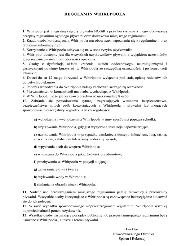 REGULAMIN WHIRLPOOLA 1. Whirlpool jest integralną częścią pływalni NOSiR i przy korzystaniu z niego obowiązują przepisy regulaminu ogólnego pływalni oraz dodatkowo niniejszego regulaminu. 2. Każda osoba korzystająca z Whirlpoola ma obowiązek zapoznania się z regulaminem oraz tablicami informacyjnymi. 3. Korzystanie z Whirlpoola odbywa się na własne ryzyko użytkownika. 4. Whirlpool dostępny jest dla wszystkich użytkowników pływalni z wyjątkiem uczestników grup zorganizowanych bez obecności opiekuna. 5. Osoby z dysfunkcją układu krążenia, układu oddechowego, neurologicznymi i gastrycznymi powinny korzystać w Whirlpoola ze szczególną ostrożnością i po konsultacji lekarskiej. 6. Dzieci do lat 12 mogą korzystać w Whirlpoola wyłącznie pod stałą opieką rodziców lub dorosłych opiekunów. 7. Podczas wchodzenia do Whirlpoola należy zachować szczególną ostrożność. 8. Pierwszeństwo w komunikacji ma osoba wychodząca z Whirlpoola. 9. W Whirlpoolu może jednorazowo przebywać maksymalnie 8 osób. 10. Zabrania się powodowania sytuacji zagrażających własnemu bezpieczeństwu, bezpieczeństwu innych osób korzystających z Whirlpoola i pływalni lub mogących spowodować nieszczęśliwy wypadek, a w szczególności: a) wchodzenia i wychodzenia z Whirlpoola w inny sposób niż poprzez schodki; b) użytkowania Whirlpoola, gdy jest wyłączona instalacja napowietrzająca; c) użytkowania Whirlpoola w przypadku zamknięcia dostępu łańcuchem, liną, taśmą, znacznikiem, szlabanem lub w inny widoczny sposób; d) wpychania osób do wnętrza Whirlpoola; e) wnoszenia do Whirlpoola jakichkolwiek przedmiotów; f) przebywania w Whirpoolu w pozycji stojącej; g) zanurzania głowy i twarzy; h) wylewania wody w Whirpoola; i) siadania na obrzeżu niecki Whirpoola. 11. Nadzór nad przestrzeganiem niniejszego regulaminu pełnią ratownicy i pracownicy pływalni. Wszystkie osoby korzystające z Whirlpoola są zobowiązane bezwzględnie stosować się do ich poleceń. 12. W razie wypadku spowodowanego nieprzestrzeganiem regulaminu Whirlpoola wszelką odpowiedzialność ponosi użytkownik. 13. Wszelkie osoby naruszające porządek publiczny lub przepisy niniejszego regulaminu będą usuwane z Whirlpoola , a także z terenu pływalni. Dyrektor Nowodworskiego Ośrodka Sportu i Rekreacji