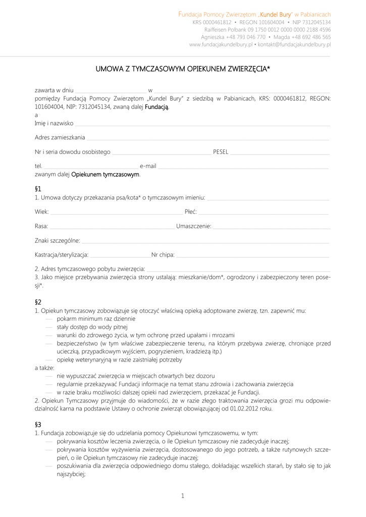 Fundacja Pomocy Zwierzętom „Kundel Bury” w Pabianicach KRS 0000461812 • REGON 101604004 • NIP 7312045134 Raiffeisen Polbank 09 1750 0012 0000 0000 2188 4596 Agnieszka +48 793 046 770 • Magda +48 692 486 565 www.fundacjakundelbury.pl • [email protected] UMOWA Z TYMCZASOWYM OPIEKUNEM ZWIERZĘCIA* zawarta w dniu ____________________________ w _____________________________________________________________________ pomiędzy Fundacją Pomocy Zwierzętom „Kundel Bury” z siedzibą w Pabianicach, KRS: 0000461812, REGON: 101604004, NIP: 7312045134, zwaną dalej Fundacją, a Imię i nazwisko ____________________________________________________________________________________________________ Adres zamieszkania _______________________________________________________________________________________________ Nr i seria dowodu osobistego _______________________________________ PESEL _______________________________________ tel. _____________________________________ e-mail ___________________________________________________________________ zwanym dalej Opiekunem tymczasowym. §1 1. Umowa dotyczy przekazania psa/kota* o tymczasowym imieniu: ________________________________________________ Wiek: ____________________________________________________ Płeć: ___________________________________________________ Rasa: _________________________________________________ Umaszczenie: ______________________________________________ Znaki szczególne: _________________________________________________________________________________________________ Kastracja/sterylizacja: ________________________Nr chipa: ____________________________________________________________ 2. Adres tymczasowego pobytu zwierzęcia: ________________________________________________________________________ 3. Jako miejsce przebywania zwierzęcia strony ustalają: mieszkanie/dom*, ogrodzony i zabezpieczony teren posesji*. §2 1. Opiekun tymczasowy zobowiązuje się otoczyć właściwą opieką adoptowane zwierzę, tzn. zapewnić mu: pokarm minimum raz dziennie stały dostęp do wody pitnej warunki do zdrowego życia, w tym ochronę przed upałami i mrozami bezpieczeństwo (w tym właściwe zabezpieczenie terenu, na którym przebywa zwierzę, chroniące przed ucieczką, przypadkowym wyjściem, pogryzieniem, kradzieżą itp.) opiekę weterynaryjną w razie zaistniałej potrzeby a także: nie wypuszczać zwierzęcia w miejscach otwartych bez dozoru regularnie przekazywać Fundacji informacje na temat stanu zdrowia i zachowania zwierzęcia w razie braku możliwości dalszej opieki nad zwierzęciem, przekazać je Fundacji. 2. Opiekun Tymczasowy przyjmuje do wiadomości, że w razie złego traktowania zwierzęcia grozi mu odpowiedzialność karna na podstawie Ustawy o ochronie zwierząt obowiązującej od 01.02.2012 roku. §3 1. Fundacja zobowiązuje się do udzielania pomocy Opiekunowi tymczasowemu, w tym: pokrywania kosztów leczenia zwierzęcia, o ile Opiekun tymczasowy nie zadecyduje inaczej; pokrywania kosztów wyżywienia zwierzęcia, dostosowanego do jego potrzeb, a także rutynowych szczepień, o ile Opiekun tymczasowy nie zadecyduje inaczej; poszukiwania dla zwierzęcia odpowiedniego domu stałego, dokładając wszelkich starań, by stało się to jak najszybciej; 1 Fundacja Pomocy Zwierzętom „Kundel Bury” w Pabianicach KRS 0000461812 • REGON 101604004 • NIP 7312045134 Raiffeisen Polbank 09 1750 0012 0000 0000 2188 4596 Agnieszka +48 793 046 770 • Magda +48 692 486 565 www.fundacjakundelbury.pl • [email protected] brania pod uwagę opinii Opiekuna tymczasowego przy podejmowaniu decyzji dotyczących zdrowia i adopcji zwierzęcia, udzielania wszelkich rad związanych z wychowaniem czy zdrowiem zwierzęcia. §4 1. Opiekun tymczasowy zobowiązuje się, że nie pozbędzie się psa, nie sprzeda, nie porzuci, nie odda do schroniska ani osobom trzecim. 2. Opiekun tymczasowy zobowiązuje się, że nie przekaże psa/kota innemu Opiekunowi (tymczasowemu lub stałemu) bez zgody Fundacji. 3. Jeśli Opiekun tymczasowy zechce adoptować zwierzę, podpisze z Fundacją właściwą umowę adopcyjną. §5 1. W razie zaginięcia zwierzęcia, Opiekun tymczasowy zobowiązany jest powiadomić o tym Fundację w terminie do 12 godzin, jednocześnie zobowiązuje się do czynnego szukania go: zawiadomienia najbliższego schroniska, dania ogłoszeń do gazet, umieszczenia ogłoszeń w Internecie oraz w miejscach publicznych. §6 1. W przypadku poważnego zachorowania zwierzęcia, wypadku, śmierci, Opiekun tymczasowy zobowiązuje się niezwłocznie (w ciągu 24 godzin) zawiadomić Fundację podając szczegóły. 2. Jeżeli zaistniałaby jakakolwiek przyczyna do poddania zwierzęcia eutanazji, Opiekun tymczasowy może to uczynić wyłącznie po okazaniu/przesłaniu do Fundacji zaświadczenia od weterynarza o wskazaniach do wykonania takiego zabiegu oraz uzyskaniu pisemnej zgody Fundacji. 3. Jeśli zwierzę ulegnie wypadkowi i zabieg eutanazji jest konieczny w trybie przyspieszonym (by uniknąć niepotrzebnego cierpienia zwierzęcia), Opiekun tymczasowy może to uczynić, po czym przedłoży Fundacji zaświadczenie od weterynarza o wskazaniach do wykonania tego zabiegu, w terminie do 3 dni. §7 1. Opiekun tymczasowy wyraża zgodę na przetwarzanie swoich danych osobowych niezbędnych do realizacji umowy, zgodnie z ustawą z dnia 29.08.97r. o ochronie danych osobowych. §8 1. W przypadku stwierdzenia następujących okoliczności: porzucenie zwierzęcia, oddanie do schroniska lub osobom trzecim, dopuszczenie do rozrodu zwierzęcia, stwierdzenie łamania Ustawy o ochronie zwierząt, a w szczególności: utrzymywanie zwierzęcia w rażącym niechlujstwie lub na uwięzi, znęcanie się, bicie, świadome niepodjęcie leczenia zwierzęcia, Opiekun tymczasowy zobowiązuje się do uiszczenia kary umownej w wysokości 500zł na rzecz Fundacji, płatną w terminie 7 dni na pierwsze wezwanie Fundacji. 2. W razie stwierdzenia nieodpowiednich warunków (niezgodn