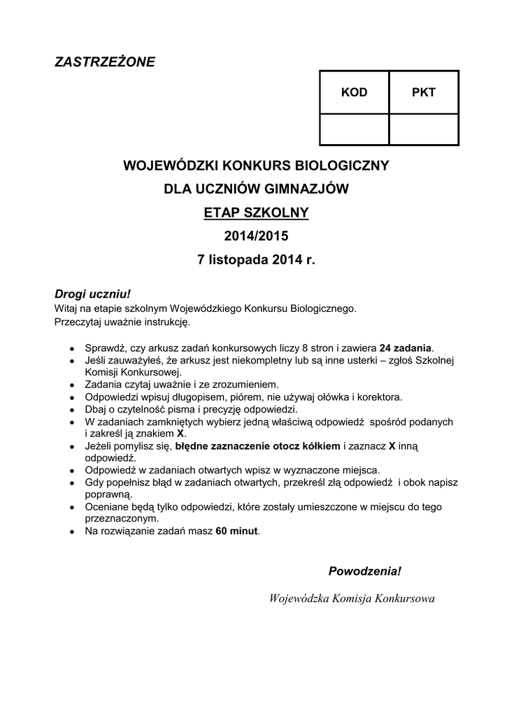 ZASTRZEŻONE KOD PKT WOJEWÓDZKI KONKURS BIOLOGICZNY DLA UCZNIÓW GIMNAZJÓW ETAP SZKOLNY 2014/2015 7 listopada 2014 r. Drogi uczniu! Witaj na etapie szkolnym Wojewódzkiego Konkursu Biologicznego. Przeczytaj uważnie instrukcję. Sprawdź, czy arkusz zadań konkursowych liczy 8 stron i zawiera 24 zadania. Jeśli zauważyłeś, że arkusz jest niekompletny lub są inne usterki – zgłoś Szkolnej Komisji Konkursowej. Zadania czytaj uważnie i ze zrozumieniem. Odpowiedzi wpisuj długopisem, piórem, nie używaj ołówka i korektora. Dbaj o czytelność pisma i precyzję odpowiedzi. W zadaniach zamkniętych wybierz jedną właściwą odpowiedź spośród podanych i zakreśl ją znakiem X. Jeżeli pomylisz się, błędne zaznaczenie otocz kółkiem i zaznacz X inną odpowiedź. Odpowiedź w zadaniach otwartych wpisz w wyznaczone miejsca. Gdy popełnisz błąd w zadaniach otwartych, przekreśl złą odpowiedź i obok napisz poprawną. Oceniane będą tylko odpowiedzi, które zostały umieszczone w miejscu do tego przeznaczonym. Na rozwiązanie zadań masz 60 minut. Powodzenia! Wojewódzka Komisja Konkursowa Wojewódzki Konkurs Biologiczny 2014/2015 Zadanie 1. (0-6pkt) a) Czaszka człowieka składa się z wielu kości, które można podzielić na dwie grupy, tworzące dwie części czaszki, z których pierwsza ochrania mózg. Nazwij te części. Czaszka części czaszki: A_________________ B_________________ b) Z podanych w ramce nazw kości wybierz te, które zaliczamy do czaszki i przyporządkuj je do odpowiedniej części A lub B z zadania 1a. ciemieniowa, szczękowa, potyliczna, obrotnik, żuchwa, czołowa, nosowa, skroniowa, jarzmowa, dźwigacz, skokowa część czaszki - A część czaszki - B Zadanie 2. (0-1pkt) Prawidłowy wynik ciśnienia krwi u dorosłego człowieka w tętnicy ramiennej wynosi: a) b) c) d) 100/95 mm Hg 70/120 mm Hg 120/80 mm Hg 130/95 mm Hg Zadanie 3. (0-1pkt) W spożywanych przez człowieka pokarmach znajdują się związki chemiczne, które można pogrupować na związki organiczne i nieorganiczne. Wskaż odpowiedź, która zawiera wyłącznie związki nieorganiczne: a) b) c) d) Białka, sole mineralne, woda. Tłuszcze, sole mineralne, cukry. Cukry, tłuszcze, witaminy, woda. Sole mineralne, woda. Zadanie 4. (0-1pkt) Do lewego przedsionka serca ssaka naczyniami wpływa krew: a) b) c) d) Odtleniona z płuc. Bogata w tlen z płuc. Odtleniona z tkanek dolnej części ciała. Bogata w tlen z tkanek dolnej i górnej części ciała. 2 Wojewódzki Konkurs Biologiczny 2014/2015 Zadanie 5. (0-1pkt) Po zjedzeniu niedogotowanego mięsa wołowego człowiek może zarazić się: a) b) c) d) Tasiemcem nieuzbrojonym. Tasiemcem uzbrojonym. Włośniem krętym. Glistą ludzką. Zadanie 6. (0-2pkt) Nerki są najbardziej złożonymi narządami układu wydalniczego. W jednej nerce znajduje się około miliona nefronów, w których odbywa się oczyszczanie krwi i wytwarzanie moczu. Podaj, z jakich dwóch podstawowych elementów składa się nefron. Uzupełnij schemat korzystając z niektórych określeń z poniższej ramki. ciałko nerkowe, piramida, miedniczka, moczowód, kanalik nerkowy, cewka moczowa Nefron = + Zadanie 7. (0-1pkt) Łukiem odruchowym nazywamy: a) b) c) d) Bodziec powodujący odwodzenie ręki. Drogę impulsu nerwowego od efektora do receptora. Drogę impulsu nerwowego od receptora do efektora. Przekazywanie impulsu przez synapsę. Zadanie 8. (0-3pkt) Uzupełnij tabelkę dotyczącą enzymów trawiennych: Nazwa enzymu Miejsce działania amylaza ślinowa Trawiony związek skrobia żołądek białko dwunastnica tłuszcze 3 Wojewódzki Konkurs Biologiczny 2014/2015 Zadanie 9. (0-1pkt) Skala porostowa to termin stosowany w ekologii. Za jej pomocą, poprzez obserwację plech różnych porostów można ocenić poziom zanieczyszczenia powietrza na danym terenie, bowiem różnią się one stopniem wrażliwości na obecność tlenku siarki (IV) w atmosferze. Wskaż zdanie prawdziwe: a) Najmniej wrażliwe na zanieczyszczenia są porosty skorupiaste, a bardzo wrażliwe porosty krzaczkowate. b) Najmniej wrażliwe na zanieczyszczenia są porosty krzaczkowate, a bardzo wrażliwe porosty skorupiaste. c) Najmniej wrażliwe na zanieczyszczenia są porosty skorupiaste, a bardzo wrażliwe porosty listkowate. d) Najmniej wrażliwe na zanieczyszczenia są porosty krzaczkowate i skorupiaste, a bardzo wrażliwe porosty listkowate. Zadanie 10. (0-5pkt) Skreśl błędne wyrazy tak, aby powstały zdania prawdziwe: Za tęczówką i źrenicą jest położona soczewka / siatkówka załamująca promienie świetlne. Siatkówka zbudowana jest z komórek światłoczułych. Pręciki / czopki są wrażliwe na ruch i natężenie światła, a pręciki / czopki reagują na barwę światła. Miejsce na siatkówce, z którego wychodzi nerw wzrokowy jest pozbawione receptorów wzroku i zwane jest plamką żółtą / tarczą nerwu wzrokowego (plamką ślepą), natomiast miejsce najlepszego widzenia nazwano plamką żółtą / naczyniówką. Zadanie 11. (0-1pkt) Jedną z cech populacji jest tzw. struktura przestrzenna, która określa sposób rozmieszczenia osobników na danym terenie. Jakim sposobem rozmieszczenia charakteryzują się populacje pasących się krów, watahy wilków, czy społeczności mrówek lub pszczół? a) b) c) d) Rozmieszczenie równomierne. Rozmieszczenie przypadkowe (losowe). Rozmieszczenie skupiskowe. Nie cechuje ich struktura przestrzenna. Zadanie 12. (0-1pkt) Człowiek zapada na wiele chorób wywoływanych przez różne czynniki. Wybierz zestaw, w którym są wymienione wyłącznie choroby bakteryjne: a) b) c) d) Świnka, gruźlica, grzybica, tężec. Grypa, błonica, ospa wietrzna, cholera. Angina, gruźlica, borelioza, tężec. Różyczka, grypa, AIDS, cholera. 4 Wojewódzki Konkurs Biologiczny 2014/2015 Zadanie 13. (0-5pkt) Uzupełnij tabelkę, wpisując znak X w odpowiednich miejscach. Czynność życiowa protisty mszaki grzyby paprotniki ssaki Oddychanie tlenowe Oddychanie beztl