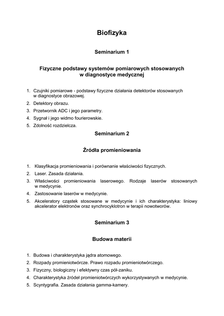 Biofizyka Seminarium 1 Fizyczne podstawy systemów pomiarowych stosowanych w diagnostyce medycznej 1. Czujniki pomiarowe - podstawy fizyczne działania detektorów stosowanych w diagnostyce obrazowej. 2. Detektory obrazu. 3. Przetwornik ADC i jego parametry. 4. Sygnał i jego widmo fourierowskie. 5. Zdolność rozdzielcza. Seminarium 2 Źródła promieniowania 1. Klasyfikacja promieniowania i porównanie właściwości fizycznych. 2. Laser. Zasada działania. 3. Właściwości promieniowania w medycynie. laserowego. Rodzaje laserów stosowanych 4. Zastosowanie laserów w medycynie. 5. Akceleratory cząstek stosowane w medycynie i ich charakterystyka: liniowy akcelerator elektronów oraz synchrocyklotron w terapii nowotworów. Seminarium 3 Budowa materii 1. Budowa i charakterystyka jądra atomowego. 2. Rozpady promieniotwórcze. Prawo rozpadu promieniotwórczego. 3. Fizyczny, biologiczny i efektywny czas pół-zaniku. 4. Charakterystyka źródeł promieniotwórczych wykorzystywanych w medycynie. 5. Scyntygrafia. Zasada działania gamma-kamery. 6. Obrazowanie kośćca i badanie tarczycy w scyntygrafii. 7. Tomografia emisyjna pojedynczych fotonów (SPECT). 8. Zastosowanie tomografii SPECT w kardiologii. 9. Pozytonowa tomografia emisyjna (PET). Zjawisko anihilacji. Charakterystyka radiofarmaceutyków stosowanych w PET. 10. Wykorzystanie PET w diagnostyce nowotworów. Seminarium 4 Właściwości elektryczne i magnetyczne substancji 1. Właściwości elektryczne substancji. 2. Przewodnictwo elektryczne tkanek i narządów. Elektryczny model tkanki. Pomiary bioimpedancyjne. 3. Działanie prądu elektrycznego na organizm człowieka. Porażenia prądem. 4. Wybrane zastosowania prądu elektrycznego w medycynie: rozrusznik serca i defibrylator. 5. Pola magnetyczne i ich właściwości. Mechanizm powstawania i źródła naturalne. 6. Właściwości magnetyczne i ferromagnetyki. substancji: diamagnetyki, paramagnetyki 7. Wytwarzanie stałych i zmiennych pól magnetycznych stosowanych w medycynie. Seminarium 5 Oddziaływanie promieniowania z materią 1. Prawo absorpcji promieniowania elektromagnetycznego. 2. Oddziaływanie promieniowania jonizującego z materią. 3. Brachyterapia i zastosowania. 4. Wielkości stosowane w ochronie radiologicznej oraz normy bezpieczeństwa. 5. Charakterystyka i wpływ promieniowania nie-jonizującego na żywy organizm. 6. Zastosowanie promieniowania z zakresu UV/VIS/IR w medycynie. 7. Zastosowanie terapeutyczne pól elektromagnetycznych z zakresu niskich i wysokich częstotliwości. Smog elektromagnetyczny. 8. Działanie fal radiowych na organizmy żywe. Współczynnik absorpcji właściwej (Specyfic Absorption Rate).
