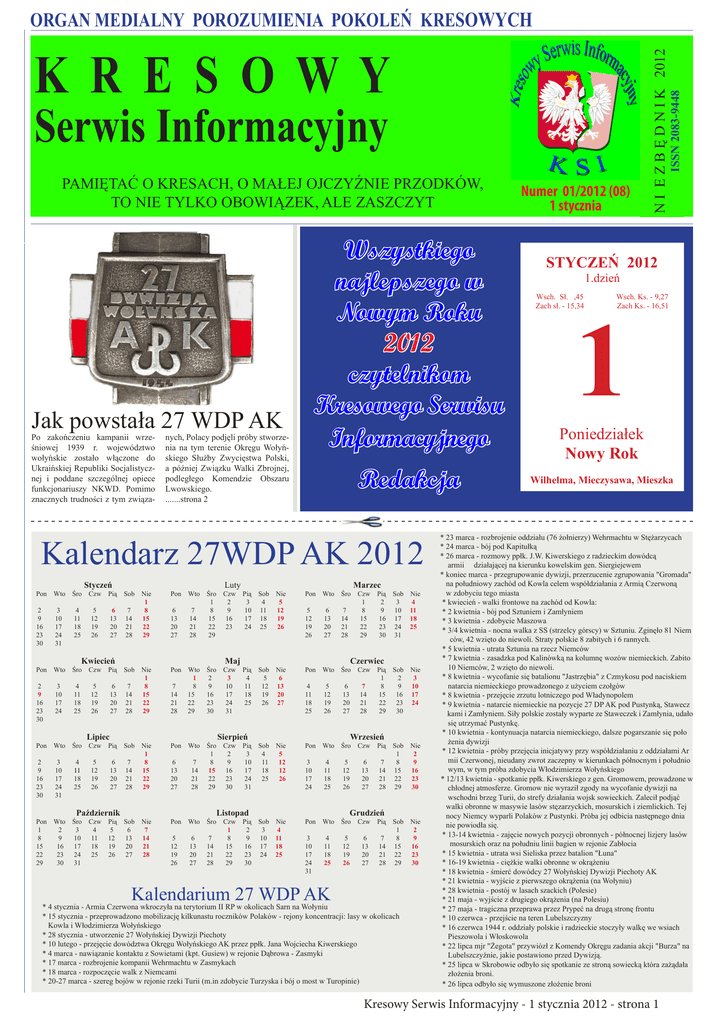 ISSN 2083-9448 K R E S OWY Serwis Informacyjny PAMIĘTAĆ O KRESACH, O MAŁEJ OJCZYŹNIE PRZODKÓW, TO NIE TYLKO OBOWIĄZEK, ALE ZASZCZYT Jak powstała 27 WDP AK Po zakończeniu kampanii wrześniowej 1939 r. województwo wołyńskie zostało włączone do Ukraińskiej Republiki Socjalistycznej i poddane szczególnej opiece funkcjonariuszy NKWD. Pomimo znacznych trudności z tym związa- nych, Polacy podjęli próby stworzenia na tym terenie Okręgu Wołyńskiego Służby Zwycięstwa Polski, a później Związku Walki Zbrojnej, podległego Komendzie Obszaru Lwowskiego. .......strona 2 Wszystkiego najlepszego w Nowym Roku 2012 czytelnikom Kresowego Serwisu Informacyjnego Redakcja Kalendarz 27WDP AK 2012 Styczeń Pon Wto Śro Czw 2 3 4 5 9 10 11 12 16 17 18 19 23 24 25 26 30 31 Pią Sob 6 13 20 27 7 14 21 28 Kwiecień Pon Wto Śro Czw 2 3 4 5 9 10 11 12 16 17 18 19 23 24 25 26 30 Pią Sob 6 13 20 27 7 14 21 28 Pią Sob 6 13 20 27 7 14 21 28 Lipiec Pon Wto Śro Czw 2 3 4 5 9 10 11 12 16 17 18 19 23 24 25 26 30 31 Październik Pon Wto Śro Czw Pią Sob 1 2 3 4 5 6 8 9 10 11 12 13 15 16 17 18 19 20 22 23 24 25 26 27 29 30 31 Luty Nie 1 8 15 22 29 Pon Wto Śro Czw Pią Sob 1 2 3 4 6 7 8 9 10 11 13 14 15 16 17 18 20 21 22 23 24 25 27 28 29 Nie 1 8 15 22 29 Pon Wto Śro 1 2 7 8 9 14 15 16 21 22 23 28 29 30 Nie 1 8 15 22 29 Pon Wto 6 7 13 14 20 21 27 28 Nie 7 14 21 28 Pon Wto Śro Czw Pią Sob Nie 1 2 3 4 5 6 7 8 9 10 11 12 13 14 15 16 17 18 19 20 21 22 23 24 25 26 27 28 29 30 Maj Czw 3 10 17 24 31 Pią 4 11 18 25 Sob 5 12 19 26 Śro 1 8 15 22 29 Sierpień Czw 2 9 16 23 30 Pią Sob 3 4 10 11 17 18 24 25 31 Listopad Marzec Nie 5 12 19 26 Pon Wto Śro Czw Pią Sob Nie 1 2 3 4 5 6 7 8 9 10 11 12 13 14 15 16 17 18 19 20 21 22 23 24 25 26 27 28 29 30 31 Nie 6 13 20 27 Pon Wto Śro Czw Pią Sob 1 2 4 5 6 7 8 9 11 12 13 14 15 16 18 19 20 21 22 23 25 26 27 28 29 30 Nie 5 12 12 26 Pon Wto Śro Czw Pią Sob 1 3 4 5 6 7 8 10 11 12 13 14 15 17 18 19 20 21 22 24 25 26 27 28 29 Czerwiec Wrzesień Pon Wto 3 4 10 11 17 18 24 25 31 Kalendarium 27 WDP AK Grudzień Śro Czw Pią 5 12 19 26 6 13 20 27 7 14 21 28 N I E Z B Ę D N I K 2012 ORGAN MEDIALNY POROZUMIENIA POKOLEŃ KRESOWYCH Sob 1 8 15 22 29 * 4 stycznia - Armia Czerwona wkroczyła na terytorium II RP w okolicach Sarn na Wołyniu * 15 stycznia - przeprowadzono mobilizację kilkunastu roczników Polaków - rejony koncentracji: lasy w okolicach Kowla i Włodzimierza Wołyńskiego * 28 stycznia - utworzenie 27 Wołyńskiej Dywizji Piechoty * 10 lutego - przejęcie dowództwa Okręgu Wołyńskiego AK przez ppłk. Jana Wojciecha Kiwerskiego * 4 marca - nawiązanie kontaktu z Sowietami (kpt. Gusiew) w rejonie Dąbrowa - Zasmyki * 17 marca - rozbrojenie kompanii Wehrmachtu w Zasmykach * 18 marca - rozpoczęcie walk z Niemcami * 20-27 marca - szereg bojów w rejonie rzeki Turii (m.in zdobycie Turzyska i bój o most w Turopinie) Nie 3 10 17 24 Nie 2 9 16 23 30 Nie 2 9 16 23 30 Numer 01/2012 (08) 1 stycznia STYCZEŃ 2012 1.dzień 1 Wsch. Sł. ,45 Zach sł. - 15,34 Wsch. Ks. - 9,27 Zach Ks. - 16,51 Poniedziałek Nowy Rok Wilhelma, Mieczysawa, Mieszka * 23 marca - rozbrojenie oddziału (76 żołnierzy) Wehrmachtu w Stężarzycach * 24 marca - bój pod Kapitułką * 26 marca - rozmowy ppłk. J.W. Kiwerskiego z radzieckim dowódcą armii działającej na kierunku kowelskim gen. Siergiejewem * koniec marca - przegrupowanie dywizji, przerzucenie zgrupowania "Gromada" na południowy zachód od Kowla celem współdziałania z Armią Czerwoną w zdobyciu tego miasta * kwiecień - walki frontowe na zachód od Kowla: * 2 kwietnia - bój pod Sztuniem i Zamłyniem * 3 kwietnia - zdobycie Maszowa * 3/4 kwietnia - nocna walka z SS (strzelcy górscy) w Sztuniu. Zginęło 81 Niem ców, 42 wzięto do niewoli. Straty polskie 8 zabitych i 6 rannych. * 5 kwietnia - utrata Sztunia na rzecz Niemców * 7 kwietnia - zasadzka pod Kalinówką na kolumnę wozów niemieckich. Zabito 10 Niemców, 2 wzięto do niewoli. * 8 kwietnia - wycofanie się batalionu "Jastrzębia" z Czmykosu pod naciskiem natarcia niemieckiego prowadzonego z użyciem czołgów * 8 kwietnia - przejęcie zrzutu lotniczego pod Władynopolem * 9 kwietnia - natarcie niemieckie na pozycje 27 DP AK pod Pustynką, Stawecz kami i Zamłyniem. Siły polskie zostały wyparte ze Staweczek i Zamłynia, udało się utrzymać Pustynkę. * 10 kwietnia - kontynuacja natarcia niemieckiego, dalsze pogarszanie się poło żenia dywizji * 12 kwietnia - próby przejęcia inicjatywy przy współdziałaniu z oddziałami Ar mii Czerwonej, nieudany zwrot zaczepny w kierunkach północnym i południo wym, w tym próba zdobycia Włodzimierza Wołyńskiego * 12/13 kwietnia - spotkanie ppłk. Kiwerskiego z gen. Gromowem, prowadzone w chłodnej atmosferze. Gromow nie wyraził zgody na wycofanie dywizji na wschodni brzeg Turii, do strefy działania wojsk sowieckich. Zalecił podjąć walki obronne w masywie lasów stęzarzyckich, mosurskich i ziemlickich. Tej nocy Niemcy wyparli Polaków z Pustynki. Próba jej odbicia następnego dnia nie powiodła się. * 13-14 kwietnia - zajęcie nowych pozycji obronnych - północnej lizjery lasów mosurskich oraz na południu linii bagien w rejonie Zabłocia * 15 kwietnia - utrata wsi Sieliska przez batalion "Łuna" * 16-19 kwietnia - ciężkie walki obronne w okrążeniu * 18 kwietnia - śmierć dowódcy 27 Wołyńskiej Dywizji Piechoty AK * 21 kwietnia - wyjście z pierwszego okrążenia (na Wołyniu) * 28 kwietnia - postój w lasach szackich (Polesie) * 21 maja - wyjście z drugiego okrążenia (na Polesiu) * 27 maja - tragiczna przeprawa przez Prypeć na drugą stronę frontu * 10 czerwca - przejście na teren Lubelszczyzny * 16 czerwca 1944 r. oddziały polskie i radzieckie stoczyły walkę we wsiach Pieszowola i Włoskowola * 22 lipca mjr "Żegota" przywiózł z Komendy Okręgu zadania akcji "Burza" na Lubelszczyźnie, jakie postawiono przed Dywizją. * 25 lipca w Skrobowie odbyło się spotkanie ze stroną sowie