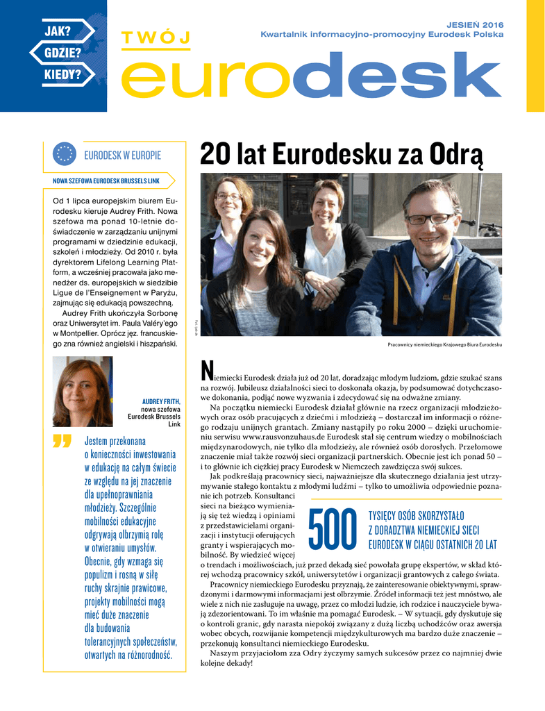 JESIEŃ 2016 Kwartalnik informacyjno-promocyjny Eurodesk Polska T WÓJ 20 lat Eurodesku za Odrą EURODESK W EUROPIE NOWA SZEFOWA EURODESK BRUSSELS LINK Fot. ijab.de Od 1 lipca europejskim biurem Eurodesku kieruje Audrey Frith. Nowa szefowa ma ponad 10-letnie doświadczenie w zarządzaniu unijnymi programami w dziedzinie edukacji, szkoleń i młodzieży. Od 2010 r. była dyrektorem Lifelong Learning Platform, a wcześniej pracowała jako menedżer ds. europejskich w siedzibie Ligue de l’Enseignement w Paryżu, zajmując się edukacją powszechną. Audrey Frith ukończyła Sorbonę oraz Uniwersytet im. Paula Valéry’ego w Montpellier. Oprócz jęz. francuskiego zna również angielski i hiszpański. Pracownicy niemieckiego Krajowego Biura Eurodesku N AUDREY FRITH, nowa szefowa Eurodesk Brussels Link Jestem przekonana o konieczności inwestowania w edukację na całym świecie ze względu na jej znaczenie dla upełnoprawniania młodzieży. Szczególnie mobilności edukacyjne odgrywają olbrzymią rolę w otwieraniu umysłów. Obecnie, gdy wzmaga się populizm i rosną w siłę ruchy skrajnie prawicowe, projekty mobilności mogą mieć duże znaczenie dla budowania tolerancyjnych społeczeństw, otwartych na różnorodność. iemiecki Eurodesk działa już od 20 lat, doradzając młodym ludziom, gdzie szukać szans na rozwój. Jubileusz działalności sieci to doskonała okazja, by podsumować dotychczasowe dokonania, podjąć nowe wyzwania i zdecydować się na odważne zmiany. Na początku niemiecki Eurodesk działał głównie na rzecz organizacji młodzieżowych oraz osób pracujących z dziećmi i młodzieżą – dostarczał im informacji o różnego rodzaju unijnych grantach. Zmiany nastąpiły po roku 2000 – dzięki uruchomieniu serwisu www.rausvonzuhaus.de Eurodesk stał się centrum wiedzy o mobilnościach międzynarodowych, nie tylko dla młodzieży, ale również osób dorosłych. Przełomowe znaczenie miał także rozwój sieci organizacji partnerskich. Obecnie jest ich ponad 50 – i to głównie ich ciężkiej pracy Eurodesk w Niemczech zawdzięcza swój sukces. Jak podkreślają pracownicy sieci, najważniejsze dla skutecznego działania jest utrzymywanie stałego kontaktu z młodymi ludźmi – tylko to umożliwia odpowiednie poznanie ich potrzeb. Konsultanci sieci na bieżąco wymieniają się też wiedzą i opiniami z przedstawicielami organizacji i instytucji oferujących granty i wspierających mobilność. By wiedzieć więcej o trendach i możliwościach, już przed dekadą sieć powołała grupę ekspertów, w skład której wchodzą pracownicy szkół, uniwersytetów i organizacji grantowych z całego świata. Pracownicy niemieckiego Eurodesku przyznają, że zainteresowanie obiektywnymi, sprawdzonymi i darmowymi informacjami jest olbrzymie. Źródeł informacji też jest mnóstwo, ale wiele z nich nie zasługuje na uwagę, przez co młodzi ludzie, ich rodzice i nauczyciele bywają zdezorientowani. To im właśnie ma pomagać Eurodesk. – W sytuacji, gdy dyskutuje się o kontroli granic, gdy narasta niepokój związany z dużą liczbą uchodźców oraz awersja wobec obcych, rozwijanie kompetencji międzykulturowych ma bardzo duże znaczenie – przekonują konsultanci niemieckiego Eurodesku. Naszym przyjaciołom zza Odry życzymy samych sukcesów przez co najmniej dwie kolejne dekady! 500 TYSIĘCY OSÓB SKORZYSTAŁO Z DORADZTWA NIEMIECKIEJ SIECI EURODESK W CIĄGU OSTATNICH 20 LAT To było jedno z lepszych szkoleń, w jakich miałam przyjemność uczestniczyć! KRAJ Uczestniczka szkolenia rocznego Eurodesk Polska poświęconego partnerstwom Erasmusa+ (cytat pochodzi z anonimowej ewaluacji szkolenia) ? NA POCZĄTEK SPYTAJ NAS Podróż, praca, wolontariat… Czy można spróbować wszystkiego po trochu? Szanowni! Kończę licencjat z fizjoterapii i p o myś l a ł e m, że d ob r ze był oby zrobić przerwę. Potrzebuję wyjechać, spojrzeć na wszystko z innej strony. Może wolontariat, może praca, staż? Nie mam zbyt wielu oszczędności, a chciałbym też zobaczyć trochę świata. Nie mogę się zdecydować. Pozdrawiam Marcin Na plusie z Erasmusem+ Program Erasmus+ był tematem tegorocznego trzydniowego szkolenia rocznego Eurodesk Polska przeznaczonego dla przedstawicieli organizacji należących do sieci. Znajomość programu Erasmus+ to obowiązek każdego konsultanta Eurodesk Polska. W tym roku tematyka spotkania dotyczyła partnerstw. Poprzednie szkolenie roczne poświęcone było mobilnościom w Erasmusie+. Szkolenia roczne to element oferty Krajowego Biura Eurodesk Polska dla organizacji należących do sieci. Poświęcone są kluczowym aspektom związanym z pracą konsultantów – największym programom europejskim, komunikacji w mediach społecznościowych i współpracy z mediami tradycyjnymi. Odpowiada ŁUKASZ SMOGOROWSKI ekspert Eurodesk Polska By spróbować wszystkiego po trochu, warto podejść do sprawy niestandardowo i zamiast szukać ofert programów grantowych, rozejrzeć się po internecie. A tu opcji jest mnóstwo. Z myślą o (nie tylko) młodych altruistach z całego świata powstały: WorkAway.info i HelpX.net, którym przyświeca myśl: od kontaktu w sieci do działania. Couchsurfing.com to globalna społeczność podróżników, którzy wspierają się nawzajem, oferując nocleg, udział w wydarzeniach i wspólne zwiedzanie. A co zwiedzać? – sekrety swoich miast lokalsi zdradzają w przewodnikach Use-it.travel. Goabroad.com to oferty staży i praktyk na całym świecie, a nazwy Workingtraveller.com i AnyWorkAnyWhere.com mówią same za siebie. Do dzieła! MASZ PYTANIE ZWIĄZANE Z FUNDUSZAMI LUB MOBILNOŚCIĄ MIĘDZYNARODOWĄ? SKONTAKTUJ SIĘ Z NAMI! ZADZWOŃ (22 46 31 450) LUB WEJDŹ NA WWW.EURODESK.PL/ZAPYTAJ. GRANT KWARTAŁU Uwaga na październik! Współpraca, partnerstwo, aktywność społeczna – to kilka z wielu słów-kluczy programu Erasmus+ Młodzież. To klucz do rozwoju edukacyjnego i zawodowego. Do 4 października, p