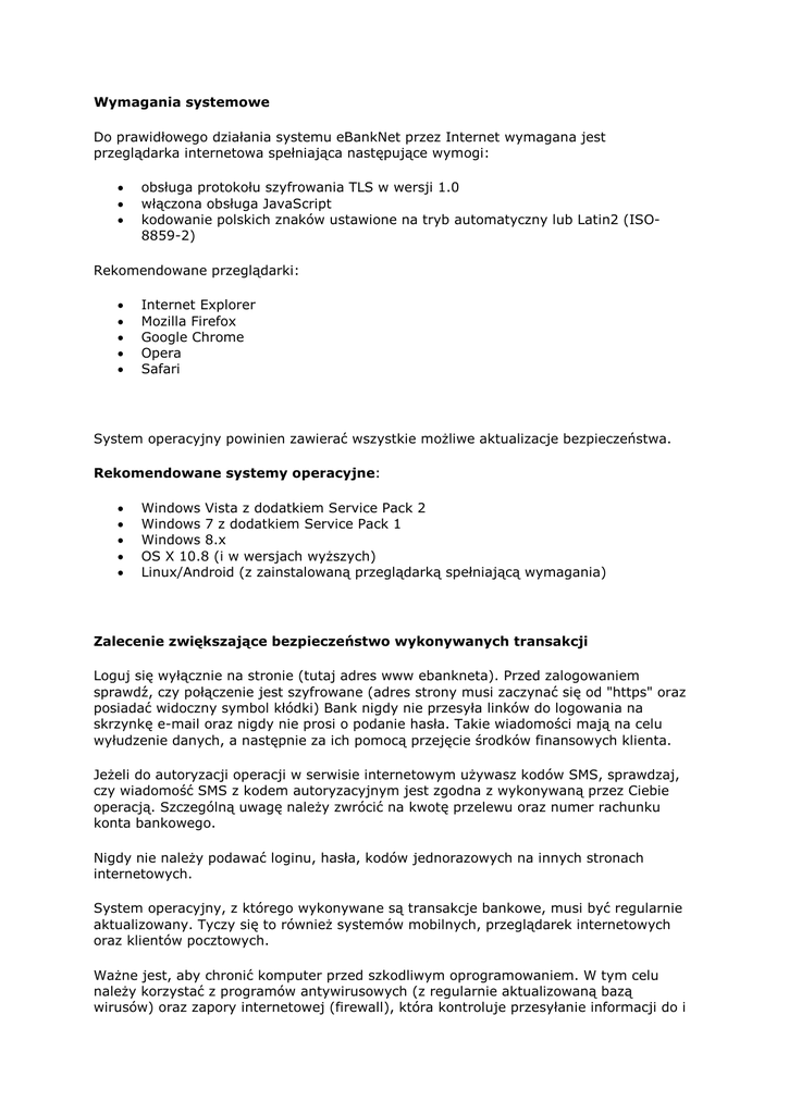 Wymagania systemowe Do prawidłowego działania systemu eBankNet przez Internet wymagana jest przeglądarka internetowa spełniająca następujące wymogi: • • • obsługa protokołu szyfrowania TLS w wersji 1.0 włączona obsługa JavaScript kodowanie polskich znaków ustawione na tryb automatyczny lub Latin2 (ISO8859-2) Rekomendowane przeglądarki: • • • • • Internet Explorer Mozilla Firefox Google Chrome Opera Safari System operacyjny powinien zawierać wszystkie możliwe aktualizacje bezpieczeństwa. Rekomendowane systemy operacyjne: • • • • • Windows Vista z dodatkiem Service Pack 2 Windows 7 z dodatkiem Service Pack 1 Windows 8.x OS X 10.8 (i w wersjach wyższych) Linux/Android (z zainstalowaną przeglądarką spełniającą wymagania) Zalecenie zwiększające bezpieczeństwo wykonywanych transakcji Loguj się wyłącznie na stronie (tutaj adres www ebankneta). Przed zalogowaniem sprawdź, czy połączenie jest szyfrowane (adres strony musi zaczynać się od "https" oraz posiadać widoczny symbol kłódki) Bank nigdy nie przesyła linków do logowania na skrzynkę e-mail oraz nigdy nie prosi o podanie hasła. Takie wiadomości mają na celu wyłudzenie danych, a następnie za ich pomocą przejęcie środków finansowych klienta. Jeżeli do autoryzacji operacji w serwisie internetowym używasz kodów SMS, sprawdzaj, czy wiadomość SMS z kodem autoryzacyjnym jest zgodna z wykonywaną przez Ciebie operacją. Szczególną uwagę należy zwrócić na kwotę przelewu oraz numer rachunku konta bankowego. Nigdy nie należy podawać loginu, hasła, kodów jednorazowych na innych stronach internetowych. System operacyjny, z którego wykonywane są transakcje bankowe, musi być regularnie aktualizowany. Tyczy się to również systemów mobilnych, przeglądarek internetowych oraz klientów pocztowych. Ważne jest, aby chronić komputer przed szkodliwym oprogramowaniem. W tym celu należy korzystać z programów antywirusowych (z regularnie aktualizowaną bazą wirusów) oraz zapory internetowej (firewall), która kontroluje przesyłanie informacji do i z internetu. W przypadku korzystania z bankowości mobilnej należy pamiętać o odpowiednim zabezpieczeniu smartphone'a, tabletu itp (aktualizacje systemu operacyjnego, oprogramowanie antywirusowe). Nie instaluj programów ze źródeł, do których nie masz zaufania i podchodź ostrożnie do programów pobieranych z Internetu. Nie otwieraj załączników w wiadomościach e-mail od nieznanych nadawców. Zwróć uwagę podczas instalowania darmowych programów, wiele z nich posiada wbudowane aplikacje adware, które służą do wyświetlania reklam niezależnie od wykonywanych na komputerze czynności. Niektóre z nich wyposażone są również w moduły szpiegujące "spyware". Dbaj aby przeglądarka, z której korzystasz była zawsze aktualna, wraz z wtyczkami, które są w niej zainstalowane. Loguj się wyłącznie osobiście, nikomu nie przekazuj danych autoryzacyjnych. Regularnie zmieniaj hasło w serwisie internetowym. Bezpieczne hasło powinno składać się z wielkich i małych liter, cyfr i znaków specjalnych (np. , #, @, ?, &) i nie powinno być słowem występującym w słowniku, ani hasłem używanym w innych serwisach internetowych. Bank nigdy nie prosi o podanie pełnego hasła do serwisu internetowego, ani żadnych danych pocztą elektroniczną. Pamiętaj aby po wykonaniu czynności w serwisie internetowym, poprawnie się wylogować. Aby to uczynić należy w następującej kolejności wykonać operacje: kliknąć wyloguj się, a następnie wyłączyć przeglądarkę. Najpopularniejsze przeglądarki Mozilla Firefox, Chrome, Opera, Internet Explorer, posiadają szereg zabezpieczeń, np. filtr witryn wyłudzających poufne dane, które w istotny sposób chronią przed oszustwami w internecie i podnoszą poziom bezpieczeństwa korzystania z bankowości elektronicznej. Oszustwa te, znane są jako "phishing" lub "wyłudzanie informacji". Polegają one zwykle na próbie nakłonienia nas do odwiedzenia fałszywej witryny internetowej, na której możemy być proszeni o podanie poufnych danych osobowych, loginów, haseł, itp Aby włączyć ochronę anty-phishingową w przeglądarce: • • • • Chrome Ustawienia ? Pokaż ustawienia zaawansowane ? W sekcji ?Prywatność? zaznacz opcje: ?Włącz ochronę przed wyłudzeniem danych (phishingiem) i złośliwym oprogramowaniem. Internet Explorer Narzędzia ->Filtr witryn wyłudzających informacje i wybierz opcję "Włącz automatyczne sprawdzanie sieci Web". Firefox Narzędzia -> Opcje -> Bezpieczeństwo i zaznaczyć opcje: Ostrzegaj, jeśli witryny próbują zainstalować dodatki; Blokuj witryny zgłoszone jako stwarzające zagrożenie oraz Blokuj witryny zgłoszone jako próby oszustwa internetowego. Opera Narzędzia -> Preferencje -> Zaawansowane - Bezpieczeństwo, a następnie zaznaczyć opcję: "Włącz ochronę przed oszustwami i złośliwym oprogramowaniem".