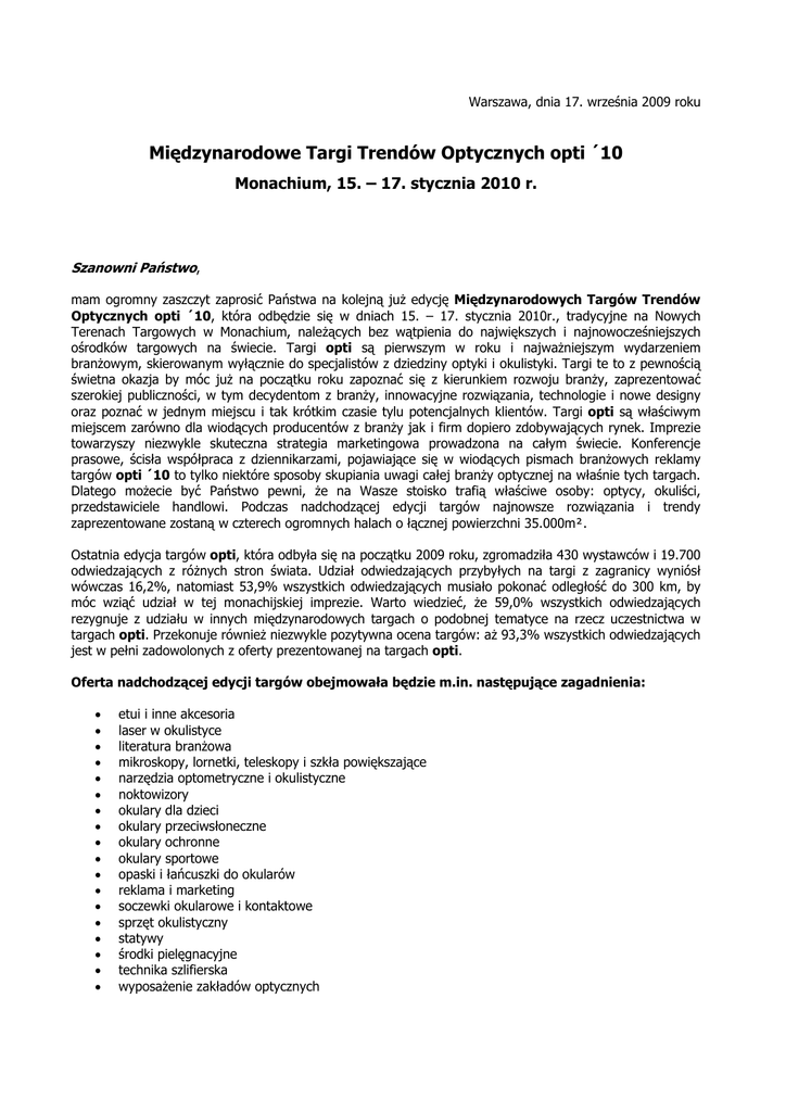 Warszawa, dnia 17. września 2009 roku Międzynarodowe Targi Trendów Optycznych opti ´10 Monachium, 15. – 17. stycznia 2010 r. Szanowni Państwo, mam ogromny zaszczyt zaprosić Państwa na kolejną już edycję Międzynarodowych Targów Trendów Optycznych opti ´10, która odbędzie się w dniach 15. – 17. stycznia 2010r., tradycyjne na Nowych Terenach Targowych w Monachium, należących bez wątpienia do największych i najnowocześniejszych ośrodków targowych na świecie. Targi opti są pierwszym w roku i najważniejszym wydarzeniem branżowym, skierowanym wyłącznie do specjalistów z dziedziny optyki i okulistyki. Targi te to z pewnością świetna okazja by móc już na początku roku zapoznać się z kierunkiem rozwoju branży, zaprezentować szerokiej publiczności, w tym decydentom z branży, innowacyjne rozwiązania, technologie i nowe designy oraz poznać w jednym miejscu i tak krótkim czasie tylu potencjalnych klientów. Targi opti są właściwym miejscem zarówno dla wiodących producentów z branży jak i firm dopiero zdobywających rynek. Imprezie towarzyszy niezwykle skuteczna strategia marketingowa prowadzona na całym świecie. Konferencje prasowe, ścisła współpraca z dziennikarzami, pojawiające się w wiodących pismach branżowych reklamy targów opti ´10 to tylko niektóre sposoby skupiania uwagi całej branży optycznej na właśnie tych targach. Dlatego możecie być Państwo pewni, że na Wasze stoisko trafią właściwe osoby: optycy, okuliści, przedstawiciele handlowi. Podczas nadchodzącej edycji targów najnowsze rozwiązania i trendy zaprezentowane zostaną w czterech ogromnych halach o łącznej powierzchni 35.000m. Ostatnia edycja targów opti, która odbyła się na początku 2009 roku, zgromadziła 430 wystawców i 19.700 odwiedzających z różnych stron świata. Udział odwiedzających przybyłych na targi z zagranicy wyniósł wówczas 16,2%, natomiast 53,9% wszystkich odwiedzających musiało pokonać odległość do 300 km, by móc wziąć udział w tej monachijskiej imprezie. Warto wiedzieć, że 59,0% wszystkich odwiedzających rezygnuje z udziału w innych międzynarodowych targach o podobnej tematyce na rzecz uczestnictwa w targach opti. Przekonuje również niezwykle pozytywna ocena targów: aż 93,3% wszystkich odwiedzających jest w pełni zadowolonych z oferty prezentowanej na targach opti. Oferta nadchodzącej edycji targów obejmowała będzie m.in. następujące zagadnienia: • • • • • • • • • • • • • • • • • • etui i inne akcesoria laser w okulistyce literatura branżowa mikroskopy, lornetki, teleskopy i szkła powiększające narzędzia optometryczne i okulistyczne noktowizory okulary dla dzieci okulary przeciwsłoneczne okulary ochronne okulary sportowe opaski i łańcuszki do okularów reklama i marketing soczewki okularowe i kontaktowe sprzęt okulistyczny statywy środki pielęgnacyjne technika szlifierska wyposażenie zakładów optycznych Organizatorzy targów opti ´10 przeznaczyli całą halę wyłącznie dla producentów tzw. „private labels”. Miejscem dla wyjątkowych designerów i ich odważnych, zupełnie nowych pomysłów będzie hala Yes! Young Eye Styles. Zupełną nowością na nadchodzących targach opti będzie strefa „Walk of Frame” w hali C1. To tutaj zaprezentują się wystawcy, których modele wyróżniają się szeroko rozumianą innowacyjnością. Tradycyjnie targom opti ´10 towarzyszył będzie niezwykle atrakcyjny program ramowy. Gorąco zachęcam zarówno Państwa jak i Państwa Klientów do uczestnictwa w ciekawych forach dyskusyjnych, wykładach i prezentacjach na żywo. Ich szczegółowy program znajdziecie Państwo na stronie www.opti-munich.com w zakładce About the trade show pod Fringe programme. Warto skorzystać z wiedzy znanych na całym świecie specjalistów z branży optycznej. Targi opti ´10 są wydarzeniem na którym po prostu nie może Państwa zabraknąć! Proszę skorzystać z zaproszenia Biura Targów Monachijskich w Polsce i dołączyć do grona zadowolonych wystawców, gdyż opinia taka jak przytoczona poniżej, nie jest odosobnionym przypadkiem. „Wystawiamy się na targach opti w Monachium nieprzerwanie od 1998 roku. Nie ma lepszych targów. Inne imprezy tego typu są z góry skazane na porażkę.” (Manfred Gründler, SPECOM Sportoptik) Proszę również pamiętać, że targi opti odbywają się w Monachium, przepięknej stolicy Bawarii, w „metropolii z sercem.” To miasto ma wszystko, co jest potrzebne do zaspokojenia nawet najbardziej wybrednych turystów. Warto zobaczyć piękną starówkę, liczne muzea, parki i ogrody, zamki i pałace. Monachium to miasto kontrastów. Z jednej strony żyje ono bawarską tradycją, zaś z drugiej jest niezwykle nowoczesną metropolią, ośrodkiem niemieckiej high tech, z siedzibami wielu międzynarodowych koncernów. Na naszej stronie internetowej www.targiwmonachium.pl w zakładce Planowanie podróży a następnie Biura podróży znajdą Państwo adresy współpracujących z nami biur, które kompleksowo zajmą się organizacją Państwa pobytu na targach. DO ZOBACZENIA W MONACHIUM! Koszty powierzchni wystawienniczej na targach opti ’10 (netto za 1 m2 ) * • Stoisko szeregowe (stoisko otwarte z jednej strony, min. 12 m²) 163 € / m2 • Stoisko narożne (stoisko otwarte z dwóch stron, min. 32 m²) 179 € / m2 • Stoisko czołowe (stoisko otwarte z trzech stron, min. 64 m²) 186 € / m2 • Stoisko wyspowe (stoisko otwarte z czterech stron, min. 200 m²) 189 € / m2 *Do powyższych cen należy doliczyć 19 % VAT. Powyższe ceny nie obejmują kosztów zabudowy stoiska, a jedynie samą powierzchnię wystawienniczą. Opłata rejestracyjna wystawców wynosi 500 € netto. Opłata za ewentualnych podwystawców – 300 € netto. Wpis do katalogu – 290 € netto (wersja drukowana i online). W tym miejscu pragnę zwrócić Państwa uwagę na stoiska modułowe, przygotowane „po