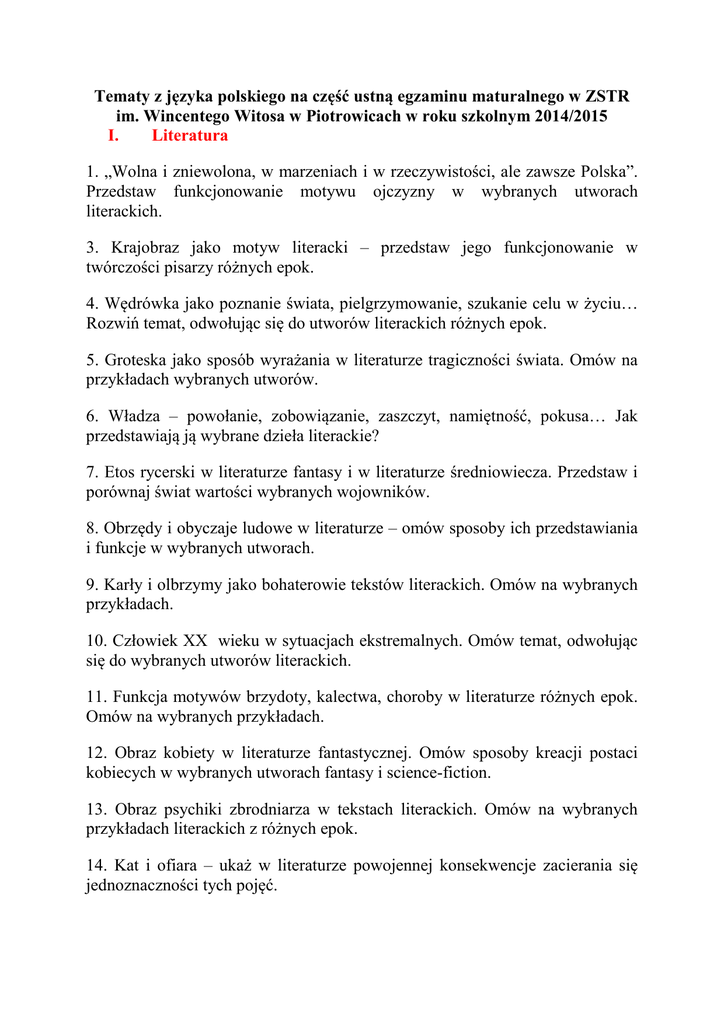 Tematy z języka polskiego na część ustną egzaminu maturalnego w ZSTR im. Wincentego Witosa w Piotrowicach w roku szkolnym 2014/2015 I. Literatura 1. „Wolna i zniewolona, w marzeniach i w rzeczywistości, ale zawsze Polska”. Przedstaw funkcjonowanie motywu ojczyzny w wybranych utworach literackich. 3. Krajobraz jako motyw literacki – przedstaw jego funkcjonowanie w twórczości pisarzy różnych epok. 4. Wędrówka jako poznanie świata, pielgrzymowanie, szukanie celu w życiu… Rozwiń temat, odwołując się do utworów literackich różnych epok. 5. Groteska jako sposób wyrażania w literaturze tragiczności świata. Omów na przykładach wybranych utworów. 6. Władza – powołanie, zobowiązanie, zaszczyt, namiętność, pokusa… Jak przedstawiają ją wybrane dzieła literackie? 7. Etos rycerski w literaturze fantasy i w literaturze średniowiecza. Przedstaw i porównaj świat wartości wybranych wojowników. 8. Obrzędy i obyczaje ludowe w literaturze – omów sposoby ich przedstawiania i funkcje w wybranych utworach. 9. Karły i olbrzymy jako bohaterowie tekstów literackich. Omów na wybranych przykładach. 10. Człowiek XX wieku w sytuacjach ekstremalnych. Omów temat, odwołując się do wybranych utworów literackich. 11. Funkcja motywów brzydoty, kalectwa, choroby w literaturze różnych epok. Omów na wybranych przykładach. 12. Obraz kobiety w literaturze fantastycznej. Omów sposoby kreacji postaci kobiecych w wybranych utworach fantasy i science-fiction. 13. Obraz psychiki zbrodniarza w tekstach literackich. Omów na wybranych przykładach literackich z różnych epok. 14. Kat i ofiara – ukaż w literaturze powojennej konsekwencje zacierania się jednoznaczności tych pojęć. 15. Obraz kultury żydowskiej w literaturze XX wieku. Ukaż na wybranych przykładach. 16. Omów różne sposoby podejmowania tematyki getta w literaturze powojennej, odwołując się do wybranych przykładów. 17. Refleksje o człowieku i świecie zawarte w poezji współczesnej. Rozwiń temat, odwołując się do twórczości co najmniej dwóch poetów. 18. Deformacja świata jako poetyka XX i XXI wieku. Ukaż na wybranych przykładach. 19. Obyczaje i tradycje szlacheckie w świetle literatury staropolskiej. Omów temat na podstawie wybranych utworów. 20. Porównaj koncepcje szczęścia wyrażone w literaturze różnych epok, odwołując się do wybranych przykładów. 21. Kobieta buntowniczka, feministka, emancypantka…Zanalizuj jej obraz w wybranych utworach literackich. 22. Honor i godność – wartości wyznawane lub/i odrzucone przez bohaterów literackich. Omów temat, wykorzystując wybrane przykłady. 23. Czy termin „literatura kobieca” ma rację bytu? Przedstaw swoją opinię, odwołując się do wybranych przykładów z literatury polskiej i obcej. 24. Bohaterowie z marginesu i półświatka w wybranych utworach literackich. Przedstaw ich kreacje w tekstach z literatury polskiej i obcej. 25. Różne kreacje kobiety fatalnej w literaturze. Zinterpretuj na wybranych przykładach. 26. Pamiętnik jako forma przywoływania przeszłości przez bohaterów literackich. Omów na wybranych przykładach. 27. Walka dobra ze złem jako temat dzieł literackich. Omów na wybranych przykładach. 28. Wykorzystanie karykatury i parodii jako sposobu prezentacji rzeczywistości. Rozważ zagadnienie, wykorzystując wybrane przykłady literackie. 29. Na podstawie wybranych przykładów przedstaw rolę lektur w kształtowaniu charakterów postaci literackich. 30. Bóg w liryce polskiej różnych epok. Dokonaj analizy i interpretacji wybranych utworów oraz porównania wizji Boga. 31. Bohaterowie w sutannach i habitach – przedstaw różne portrety osób duchownych i pełnione przez nie funkcje w literaturze wybranych epok. 32. Dekalog bohaterów Gustawa Herlinga- Grudzińskiego. Omów na wybranych przykładach dzieł. 33. Twórczość Jana Kochanowskiego w tradycji literackiej późniejszych epok. Zanalizuj nawiązania literackie na przykładzie wybranych utworów. 34. Tematyka maryjna w liryce polskiej różnych epok. Dokonaj analizy i interpretacji wybranych utworów. 35. Śmierć jako bohaterka literacka. Omów sposób konstruowania obrazu personifikacji śmierci w literaturze i zinterpretuj jego rolę w wybranych utworach różnych epok. 36. Literacki obraz pracy i portrety ludzi pracujących. Przestaw, odwołując się do wybranych przykładów. 37. Literackie ujęcia zwycięzców i zwyciężonych w walce. Omów temat na wybranych przykładach dzieł. 38. Słynne lekcje w literaturze. Przedstaw sposób funkcjonowania tego motywu w literaturze różnych epok. 39. Człowiek i świat widziany oczyma artysty hiphopowego lub rockowego. Przedstaw i omów obraz rzeczywistości kreowanej przez twórców tekstów piosenek tego nurtu. 40. „Jakaż jest przeciw włóczni złego twoja tarcza, człowiecze końca wieku?..." Wykaż, że w utworach literatury współczesnej można odnaleźć odpowiedź na pytanie poety. Przeanalizuj dowolnie wybrane przykłady i porównaj je. 41. Spotkania z duszami zmarłych. Omów funkcjonowanie motywu w wybranych tekstach literackich z różnych epok. 42. Bajki A. Fredry a bajki I. Krasickiego i A. Mickiewicza. Dokonaj porównania budowy i treści utworów. 43. Wizerunek Żyda w literaturze polskiej. Omów na wybranych przykładach. 44. Bohater romantyczny i jego spadkobiercy. Omów zagadnienie na wybranych przykładach. 45. Miłość – jej rola w życiu człowieka. Przedstaw temat, analizując wybrane dzieła literackie z rożnych epok. 46. Światy nieludzkie w prozie XX wieku. Omów temat na podstawie wybranych utworów literackich. 47. Od herosa do pantoflarza – różnorodne portrety mężczyzn w literaturze. Przedstaw temat na podstawie analizy wybranych utworów. 48. Wpływ wojny na psychikę człowieka. Zanalizuj zagadnienie, odwołując się do literatury XX wieku. 49. Dekadenckie nastroje i postawy w literaturze Młodej Polski. Scharakteryzuj j