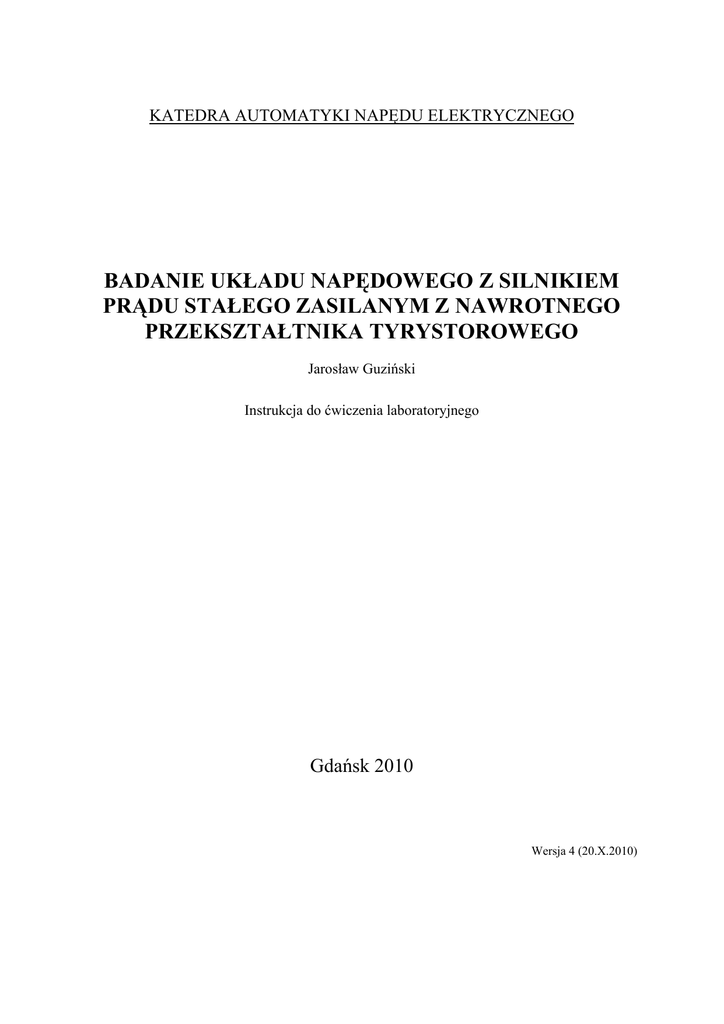KATEDRA AUTOMATYKI NAPĘDU ELEKTRYCZNEGO BADANIE UKŁADU NAPĘDOWEGO Z SILNIKIEM PRĄDU STAŁEGO ZASILANYM Z NAWROTNEGO PRZEKSZTAŁTNIKA TYRYSTOROWEGO Jarosław Guziński Instrukcja do ćwiczenia laboratoryjnego Gdańsk 2010 Wersja 4 (20.X.2010) 1. Cel ćwiczenia Celem ćwiczenia jest zapoznanie się z działaniem układu regulacji prędkości kątowej silnika obcowzbudnego prądu stałego zasilanego z tyrystorowego przekształtnika nawrotnego, przeprowadzenie procedury strojenia regulatorów na obiekcie rzeczywistym oraz przeprowadzenie analizy układu. 2. Wstęp W regulowanych układach napędowych silniki prądu stałego są przeważnie zasilane z przekształtników sterowanych tyrystorowych (PS) o komutacji sieciowej. Poprzez zmianę kąta wysterowania tyrystorów, wpływa się na wartość (i kierunek) napięcia na wyjściu przekształtnika i umożliwia jego płynną regulację. Ponadto PS umożliwia, w pewnych warunkach, dwukierunkowy przepływ energii co pozwala na hamowanie elektryczne silnika i zwrot energii hamowania do źródła. W regulowanym napędzie z maszyną prądu stałego przekształtniki wykorzystywane są do zasilania obwodu twornika silnika oraz, w układach dwustrefowej regulacji prędkości, do zasilania obwodu wzbudzenia silnika. Dzięki zastosowaniu odpowiedniego układu regulacji możliwa jest płynna regulacja prędkości i innych wymaganych w układzie napędowym wielkości jak np. momentu obrotowego oraz uzyskanie pożądanych właściwości dynamicznych (czasu rozruchu, przeregulowania, itp.). Układ regulacji umożliwia odpowiednie kształtowanie charakterystyk mechanicznych silnika zapewniając, np. przy sprzężeniu prędkościowym uzyskanie sztywnych charakterystyk mechanicznych. W układach napędowych prądu stałego stosuje się najczęściej strukturę szeregową (kaskadową) regulatora prędkości z podporządkowanym regulatorem prądu twornika. 3. Tyrystorowy przekształtnik nawrotny W napędach prądu stałego większej mocy przeważnie stosuje się prostowniki trójfazowe w pełni sterowane typu 6T- rys. 1. Rys. 1. Prostownik 6T zasilający twornik silnika prądu stałego Układ z rys. 1 jest układem dwukwadrantowym tj. zapewniającym pracę silnikową i prądnicową maszyny przy jednym kierunku wirowania. Zmiana kierunku obrotów silnika w takim układzie wiąże się z koniecznością przełączenia zacisków obwodu twornika lub obwodu wzbudzenia maszyny. Płynna zmiana kierunku obrotów jest możliwa do uzyskania przy zastosowaniu prostownika rewersyjnego (nawrotnego, dwukierunkowego) złożonego z dwóch prostowników 6T - rys. 2. Rys. 2. Przekształtnik nawrotny z dławikiem wyrównawczym Przekształtnik rewersyjny może pracować przy równoczesnym wysterowaniu tyrystorów obu prostowników 6T lub przy sterowaniu naprzemiennym. W pierwszym przypadku jeden z układów znajduje się w zakresie pracy prostownikowej a drugi w zakresie pracy falownikowej. Pomimo tych samych wartości średnich napięć pomiędzy obydwoma układami występuje różnica wartości chwilowych napięć. Różnica ta powoduje przepływ prądu wyrównawczego, którego wartość musi być ograniczona przez wprowadzenie dławika wyrównawczego Lw. Układ z dławikiem wyrównawczym umożliwia płynną zmianę kierunku prądu płynącego przez obciążenie co zapewnia dużą dynamikę układu. Rozwiązanie to jest stosowane dla mniejszych mocy, w których jest możliwy do przyjęcia przepływ prądu wyrównawczego. W układach większej mocy stosowane jest sterowanie naprzemienne obu prostowników. W danej chwili podawane są impulsy sterujące jedynie na tyrystory jednego mostka. Takie sterowanie eliminuje występowanie prądu wyrównawczego ale pogarsza nieznacznie dynamikę układu. W układzie pracującym bez prądu wyrównawczego przy zmianie kierunku prądu obciążenia i przy zmianie pracującego przekształtnika, konieczne jest bowiem wprowadzenie krótkiej przerwy bezprądowej (rzędu paru ms) zapewniającej zanik prądu obciążenia i wyłączenie tyrystorów dotychczas pracującego przekształtnika.. Schemat układu bez dławika wyrównawczego przedstawiono na rys. 2. P1 α P2 β M Rys. 3. Przekształtnik nawrotny bez dławika wyrównawczego Obszary pracy dla przekształtnika nawrotnego przedstawiono w układzie współrzędnych (Id, Ud) na rys. 4. Rys. 4. Obszary pracy przekształtnika nawrotnego w układzie współrzędnych (Id,Ud) 4. Ogólna struktura układu regulacji Prędkość kątowa maszyny prądu stałego w stanie ustalonym okreslona jest zależnością: U Rt ω = t −M 2 cΨ f ( cΨ ) f gdzie Ut oznacza napięcie twornika, Rt rezystancję twornika, Ψf strumień wzbudzenia, c stałą konstrukcyjną a M moment obciążenia. Z równania tego wynika że prędkość kątowa zależy od napięcia twornika i strumienia (prądu) wzbudzenia. Zmiana napięcia twornika w zakresie ±Ut pozwala na regulację prędkości w zakresie ±ωn, z kolei zmniejszenie strumienia umożliwia zwiększenie zakresu regulacji prędkości (praca w drugiej strefie). Struktura układu regulacji prędkości maszyny prądu stałego składa się z układu sterowania napięciem obwodu twornika oraz w przypadku napędu dwustrefowego także z układu regulacji prądu wzbudzenia. Poniżej na rys. 5 pokazano strukturę układu regulacji prędkości napędu jednostrefowego tzn. przy stałej wartości prądu wzbudzenia. Rys. 5. Układ regulacji o strukturze szeregowej Układ regulacji prędkości kątowej maszyny prądu stałego składa się z połączonych kaskadowo regulatorów PI prędkości i prądu twornika. Regulator prądu twornika jest stosowany ze względu na konieczność ograniczania prądu twornika i kontrolowania w stanach przejściowych. Jest to podstawowa struktura nie uwzględniająca elementów dodatkowych jak np. układu sterowania przekształtnikiem lub w napędzie nawrotnym, przekształtnikami. W obwodzie nadrzędnym regulator prędkości Rω na podstawie różnicy sygn