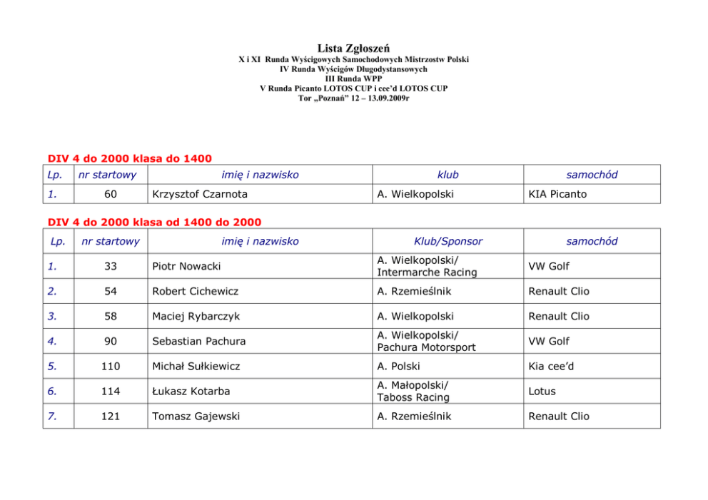 Lista Zgłoszeń X i XI Runda Wyścigowych Samochodowych Mistrzostw Polski IV Runda Wyścigów Długodystansowych III Runda WPP V Runda Picanto LOTOS CUP i cee’d LOTOS CUP Tor „Poznań” 12 – 13.09.2009r DIV 4 do 2000 klasa do 1400 Lp. 1. nr startowy 60 imię i nazwisko Krzysztof Czarnota klub A. Wielkopolski samochód KIA Picanto DIV 4 do 2000 klasa od 1400 do 2000 Lp. nr startowy imię i nazwisko Klub/Sponsor samochód 1. 33 Piotr Nowacki A. Wielkopolski/ Intermarche Racing VW Golf 2. 54 Robert Cichewicz A. Rzemieślnik Renault Clio 3. 58 Maciej Rybarczyk A. Wielkopolski Renault Clio 4. 90 Sebastian Pachura A. Wielkopolski/ Pachura Motorsport VW Golf 5. 110 Michał Sułkiewicz A. Polski Kia cee’d 6. 114 Łukasz Kotarba A. Małopolski/ Taboss Racing Lotus 7. 121 Tomasz Gajewski A. Rzemieślnik Renault Clio DIV 4 pow. 2000 klasa do 3500 Lp. nr startowy imię i nazwisko Klub/Sponsor samochód 1. 12 Karolina Lampel-Czapka A. Wielkopolski/ Katrex Karolina Autosport Renault Megane 2. 14 Michał Słomian A. Wielkopolski Lotus Exige 3. 17 Krzysztof Spyra A. Rzemieślnik Renault Megane 4. 18 Paweł Szymański A. Rzemieślnik Renault Megane DIV 4 pow. 2000 klasa pow. 3500 Lp. nr startowy imię i nazwisko Klub/Sponsor samochód 1. 1 Maciej Stańco A. Kielecki Ferrari 430 2. 4 Adam Kornacki A. Polski Porsche 996 3. 16 Radosław Kordecki A. Wielkopolski Porsche 911 4. 63 Piotr Zaleski A. Gdański Porsche 997 DSMP Klasa 1 do 1400 nr Lp. Zespół/sponsor startowy 1. 60 Krzysztof Czarnota 2. 62 Gizelewski/Szcześniak 3. 100 Garstecki/ Czyż DSMP Klasa 2 (1400-2000) nr Lp. Zespół/sponsor startowy 1. 25 Gawarecki/Kiwak 2 32 Tomasz Strozik 3 33 Intermarche Racing 4 34 Bany/Kołakowski 5 43 Michałowski 6 90 Pachura Motosport 7 101 Tomaszewski/Wydra imię i nazwisko Krzysztof Czarnota Daria Dziwisz Gerard Gizelewski Mirosław Szcześniak Maciej Garstecki Artur Czyż klub A. Wielkopolski A. Wielkopolski Auto Klub Szczecin Auto Klub Szczecin A. Wielkopolski A. Wielkopolski imię i nazwisko Marcin Gawarecki Marcin Kiwak Tomasz Strozik Filip Lewandowski Piotr Nowacki Tomasz Nowacki Adam Nowacki Piotr Bany Sebastian Kołakowski Aleksander Michałowski Michał Matuszyk Robert Kosiba Sebastian Pachura Patryk Pachura Maciej Tomaszewski Marcin Wydra klub A. A. A. A. A. A. A. A. A. A. A. A. A. A. A. A. Rzemieślnik Rzemieślnik Rzemieślnik Wschodni Wielkopolski Wielkopolski Wielkopolski Rzemieślnik Rzemieślnik Lubelski Wałbrzyski Małopolski Wielkopolski Wielkopolski Polski Radomski samochód Kia Picanto Suzuki Swift Fiat Panda samochód Renault Clio Fiat Seicento VW Golf Alfa Romeo BMW E 46 VW Golf V TDI Alfa Romeo DSMP Klasa 3 (2000-3500) nr Lp. Zespół/sponsor startowy 1. 3 GŁADYSZ RACING 2. 12 Katrex Karolina Autosport 3. 15 MP Sport 4. 17 Katrex Karolina Autosport 5. 77 Szwagierczak/Obuchowski DSMP Klasa 4 (pow 3500) nr Lp. Zespół/sponsor startowy imię i nazwisko Gładysz Adam Gładysz Marcin Karolina Lampel-Czapka Mateusz Lisowski Bartosz Warzecha Jakub Marcinkiewicz Krzysztof Spyra Paweł Szymański Piotr Magdziarz Zbigniew Szwagierczak Artur Obuchowski imię i nazwisko klub A. A. A. A. Kielecki Kielecki Wielkopolski Rzemieślnik AMK Tarnów A. A. A. A. A. Rzemieślnik Rzemieślnik Wielkopolski Wielkopolski Wielkopolski klub samochód VW Jetta Renault Megane Seat Leon Renault Megane Alfa Romeo samochód 1. 1 Lukas Motosport Stefan Biliński Teodor Myszkowski A. Wielkopolski A. Wielkopolski Porsche 997 2. 2 Star Moto Racing Maciej Stańco A. Kielecki Ferrari 430 Luis Scarpacio Fabio Ghizzi Mateo Cressoni Adam Kornacki Robert Lukas A. Wielkopolski A. Polski Club D’Italia A. Polski A. Kielecki 3. 6 4. 21 Nostress Motosport Lukas Motosport Ferrari 360 Porsche 997 WPP Lp. nr startowy imię i nazwisko klub samochód Klasa 1. 13 Bartosz Knast A. Wielkopolski Fiat Seicento 1 2. 14 Sebastian Karpiński A. Kielecki Fiat Seicento 1 3. 15 Bartosz Rybienik A. Rzemieślnik Fiat Seicento 1 4. 16 Piotr Bany A. Rzemieślnik Fiat Seicento 1 5. 17 Jakub Paczkowski A. Wielkopolski Fiat Cinquecento 1 6. 18 Adrian Meller A. Wielkopolski Fiat Seicento 1 7. 19 Cezary Szlawski A. Kielecki Fiat Seicento 1 8. 20 Radosław Kapturski A. Wielkopolski Fiat Cinquecento 1 9. 22 Paweł Jakus AMK Limanowa Fiat Cinquecento 1 10. 28 Krzysztof Hellwig A. Wielkopolski BMW Open 11. 30 Jakub Bień AMK Tarnowski Citroen Saxo 2 12. 39 Paweł Grzywacz A. Polski Opel Kadett 3 13. 40 Przemysław Włodarczyk A. Orski Honda Civic 3 14. 42 Jakub Masłowski A. Wielkopolski Honda Civic 3 15. 50 Krzysztof Mencel A. Wielkopolski Fiat Cinquecento 1 16. 53 Marcin Gawarecki A. Rzemieślnik Alfa Romeo 3 17. 57 Piotr Gembicki A. Wielkopolski Honda CRX 2 18. 62 Józef Dziób A. Wielkopolski Alfa Romeo Open 19. 63 Dawid Bokiej A. Wielkopolski BMW Open 20. 69 Łukasz Kosiński A. Wielkopolski Fiat Seicento 1 21. 76 Bartosz Gradowski A. Kielecki Fiat Cinquecento Open 22. 80 Bartosz Kubicki A. Wielkopolski Fiat Seicento 1 23. 666 Jarosław Gawroński Motoklub Olsztyn Honda Civic Open KIA c'eed LOTOS Cup Lp. nr startowy imię i nazwisko klub samochód 1. 1 Łukasz Błaszkowski A. Wielkopolski KIA c'eed 2. 2 Kamil Raczkowski A. Rzemieślnik KIA c’eed 3. 3 Andrzej Gasenko A. Wielkopolski KIA c'eed 4. 5 MOP A. Rzemieślnik KIA c’eed 5. 7 Maciej Ostoja-Chyżyński A. Rzemieślnik KIA c’eed 6. 8 Piotr Knaś A. Częstochowski KIA c’eed 7. 9 Piotr Wójcik A. Rzemieślnik KIA c’eed 8. 10 Michał Sułkiewicz A. Polski KIA c'eed 9. 11 Mariusz Fronc A. Wschodni KIA c'eed 10. 12 Monika Luberadzka A. Rzemieślnik KIA c’eed 11. 15 Tomasz Senkowski A. Polski KIA c’eed 12. 22 Zbigniew Łacisz A. Śląski KIA c’eed 13. 24 Robert Lukas A. Kielecki/ Lukas Motorsport KIA c’eed 14. 25 Stefan Biliński A. Wielkopolski KIA c’eed 15. 44 Marcin Bartoszuk A. Rzemieślnik KIA c’eed 16. 77 Robert Kosiba A. Małopolski KIA c'eed 17. 97 Łukasz Byśkiniewicz A. Śląski KIA c'eed 18. 99 Jacek Pieśniewski A. Opolski/ Kia Motors Polska KIA c'eed KIA Picanto 