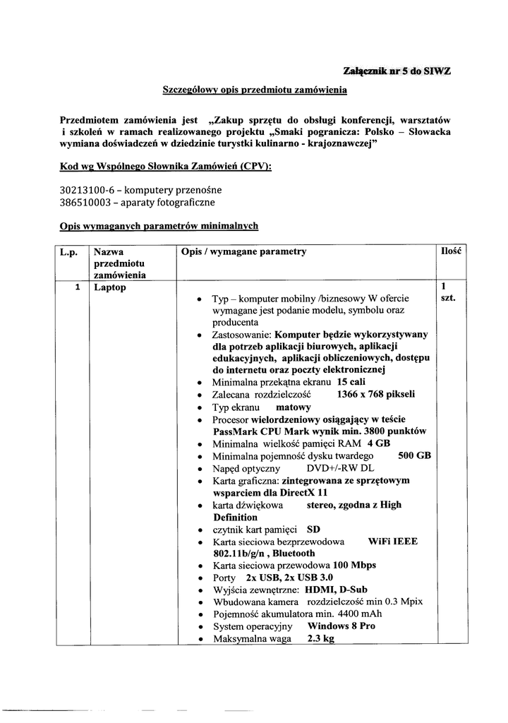Załąa:nikar5 do SIWZ Szczegółowy opis przedmiotu zamówienia Przedmiotem zamówienia jest „Zakup sprzętu do obsługi konferencji, warsztatów i szkoleń w ramach realizowanego projektu „Smaki pogranicza: Polsko - Słowacka wymiana doświadczeń w dziedzinie turystki kulinarno - krajoznawczej" Kod wg Wspólnego Słownika Zamówień (CPV>: 30213100-6 - komputery przenośne 386510003 - aparaty fotograficzne Opis wymaganych parametrów minimalnych L.p. 1 Nazwa przedmiotu zamówienia Laptop Opis I wymagane parametry Ilość 1 Typ - komputer mobilny /biznesowy W ofercie wymagane jest podanie modelu, symbolu oraz producenta • Zastosowanie: Komputer będzie wykorzystywany dla potrzeb aplikacji biurowych, aplikacji edukacyjnych, aplikacji obliczeniowych, dostępu do internetu oraz poczty elektronicznej • Minimalna przekątna ekranu 15 cali 1366 x 768 pikseli • Zalecana rozdzielczość matowy • Typ ekranu • Procesor wielordzeniowy osiągający w teście PassMark CPU Mark wynik min. 3800 punktów • Minimalna wielkość pamięci RAM 4 GB 500 GB • Minimalna pojemność dysku twardego DVD+/-RW DL • Napęd optyczny • Karta graficzna: zintegrowana ze sprzętowym wsparciem dla DirectX 11 stereo, zgodna z High • karta dźwiękowa Deimition • czytnik kart pamięci SD WiFi IEEE • Karta sieciowa bezprzewodowa 802.llb/g/n, Bluetooth • Karta sieciowa przewodowa 100 Mbps • Porty 2x USB, 2x USB 3.0 • Wyjścia zewnętrzne: HDMI, D-Sub • Wbudowana kamera rozdzielczość min 0.3 Mpix • Pojemność akumulatora min. 4400 mAh Windows 8 Pro • System operacyjny 2.3 kg • Maksymalna waga • szt. • • 1 rok Gwarancja Oprogramowanie Microsoft Office 2013 dla Domowych i Małych Firm - polska wersja językowa zawierająca min (Word, Excel, Powerpoin t, Outlook) użytkowników 2 Laptop • • • • • • • • • • • • • • • • • • • • • • • • • Typ - komputer mobilny. W ofercie wymagane jest podanie modelu, symbolu oraz producenta Zastosowanie: Komputer będzie wykorzyst ywany dla potrzeb aplikacji edukacyjn ych, , aplikacji biurowych , aplikacji obliczeniowych, dostępu do internetu oraz poczty elektronic znej Minimalna przekątna ekranu 15 cali 1366 x 768 pikseli Zalecana rozdzielczość matowy Typ ekranu Procesor wielordzen iowy osiągający w teście PassMark CPU Mark wynik min. 3300 punktów Minimalna wielkość pamięci RAM 4 GB 500 GB Minimalna pojemność dysku twardego DVD+/-RW DL Napęd optyczny ze sprzętowym wsparciem Karta graficzna 11 dla DirectX stereo zgodna z High karta dźwiękowa Definition czytnik kart pamięci SDXC, SDHC, SD, MMC WiFi IEEE Karta sieciowa bezprzewodowa 802.llb/g/ n Karta sieciowa przewodowa 100 Mbps Porty 3x USB Wyjścia zewnętrzne: HDMI, D-Sub Wbudowana kamera rozdzielczość min 0.3 Mpix min. 4400 mAh Pojemność akumulatora System operacyjny Windows 8 2.3 kg Maksymalna waga 381 mm Maksymalna szerokość mm 251 Maksymalna głębokość 33 mm Maksymalna wysokość Gwarancja: min 2 lata Oprogramowanie Microsoft Office 2013 polska wersja językowa zawierająca min (Word, Excel, Powerpoin t, Outlook) 1 szt. L.p. 3 Nazwa przedmiotu zamówienia Aparat fotograficzny Ilość Opis I wymagane parametry • minimum 2 lata w serwisie zewnętrznym Gwarancja Przetwornik (min) • 20.4 MP • Nie mniej niż 5184 x 3888 pikseli Rozdzielczość • Secure Digital • rodzaj obsługiwanej pamięci zewn. • • • • • • • Minimalny zoom optyczny ogniskowa obiektywu wg filmu 35mm Szybkość migawki SDXC SDHC microSDHC micro SD Memory Stick PRO-HG Duo Memory Stick Pro Duo Memory Stick Micro Memory Stick Duo • 50 X • 24- l 200mm • 30 s - 114000 s Wbudowana lampa błyskowa Wbudowany wizjer optyczny Wbudowany wyświetlacz LCD Minimalna przekątna LCD • 3 cale • HDMI USB 2.0 Interfejsy • Rodzaj zasilania • akumulator dedykowany Maksymalna szerokość • 129.6mm Maksymalna wysokość • 93.2mm 1 szt. Maksymalna głębokość Maksymalna waga • 103.2 mm • 623 g wskazane pochodzenie (marka, znak towarowy, producent, dostawca) których mowa w art. 30 ust. 1-3 materiałów lub normy, aprobaty, specyfikacje i systemy, o ałów lub Ustawy Prawo zamówień publicznych, Zamawiający dopuszcza oferowanie materi nie parametrów technicznych rozwiązań równoważnych pod warunkiem, że zapewnią uzyska nie gorszych od założonych. Tam, gdzie zostało