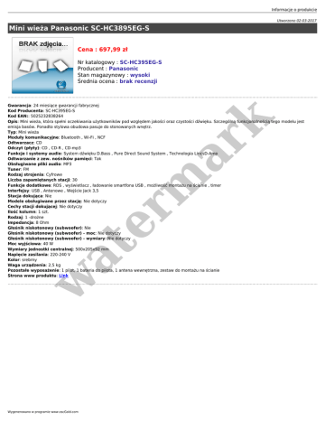Informacje o produkcie Utworzono 02-03-2017 Mini wieża Panasonic SC-HC3895EG-S Cena : 697,99 zł Nr katalogowy : SC-HC395EG-S Producent : Panasonic Stan magazynowy : wysoki Średnia ocena : brak recenzji w at er m ar k Gwarancja: 24 miesiące gwarancji fabrycznej Kod Producenta: SC-HC395EG-S Kod EAN:: 5025232838264 Opis: Mini wieża, która spełni oczekiwania użytkowników pod względem jakości oraz czystości dźwięku. Szczególną funkcjonalnością tego modelu jest emisja basów. Ponadto stylowa obudowa pasuje do stonowanych wnętrz. Typ: Mini wieża Moduły komunikacyjne: Bluetooth , Wi-Fi , NCF Odtwarzacz: CD Odczyt (płyty): CD , CD-R , CD-mp3 Funkcje i systemy audio: System dźwięku D.Bass , Pure Direct Sound System , Technologia LincsD-Amp Odtwarzanie z zew. nośników pamięci: Tak Obsługiwane pliki audio: MP3 Tuner: FM Rodzaj strojenia: Cyfrowe Liczba zapamiętanych stacji: 30 Funkcje dodatkowe: RDS , wyświetlacz , ładowanie smartfona USB , możliwość montażu na ścianie , timer Interfejsy: USB , Antenowe , Wejście Jack 3,5 Stacja dokująca: Nie Modele obsługiwane przez stację: Nie dotyczy Cechy stacji dokującej: Nie dotyczy Ilość kolumn: 1 szt. Rodzaj: 1 -drożne Impedancja: 8 Ohm Głośnik niskotonowy (subwoofer): Nie Głośnik niskotonowy (subwoofer) - moc: Nie dotyczy Głośnik niskotonowy (subwoofer) - wymiary: Nie dotyczy Moc wyjściowa: 40 W Wymiary jednostki centralnej: 500x205x92 mm Napięcie zasilania: 220-240 V Kolor: srebrny Waga urządzenia: 2,5 kg Pozostałe wyposażenie: 1 pilot, 1 bateria do pilota, 1 antena wewnętrzna, zestaw do montażu na ścianie Strona www produktu: Link Wygenerowano w programie www.oscGold.com