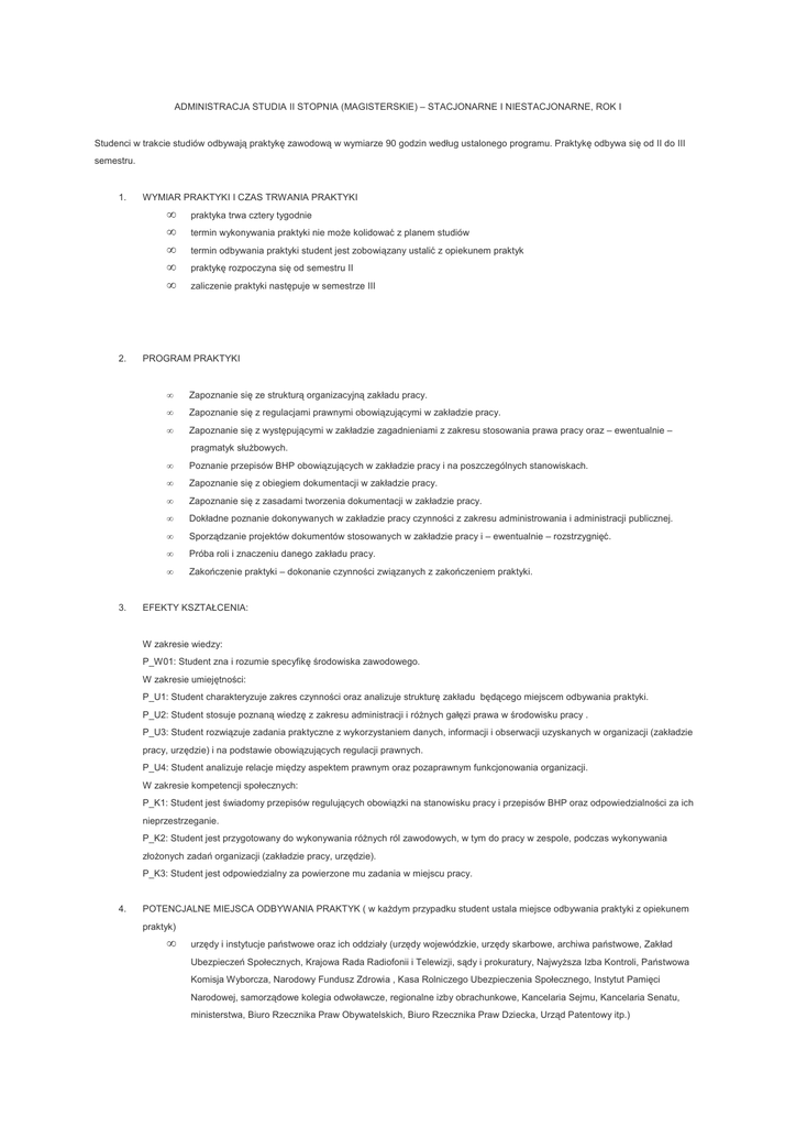 ADMINISTRACJA STUDIA II STOPNIA (MAGISTERSKIE) – STACJONARNE I NIESTACJONARNE, ROK I Studenci w trakcie studiów odbywają praktykę zawodową w wymiarze 90 godzin według ustalonego programu. Praktykę odbywa się od II do III semestru. 1. WYMIAR PRAKTYKI I CZAS TRWANIA PRAKTYKI • • • • • 2. praktyka trwa cztery tygodnie termin wykonywania praktyki nie może kolidować z planem studiów termin odbywania praktyki student jest zobowiązany ustalić z opiekunem praktyk praktykę rozpoczyna się od semestru II zaliczenie praktyki następuje w semestrze III PROGRAM PRAKTYKI • Zapoznanie się ze strukturą organizacyjną zakładu pracy. • Zapoznanie się z regulacjami prawnymi obowiązującymi w zakładzie pracy. • Zapoznanie się z występującymi w zakładzie zagadnieniami z zakresu stosowania prawa pracy oraz – ewentualnie – • Poznanie przepisów BHP obowiązujących w zakładzie pracy i na poszczególnych stanowiskach. • Zapoznanie się z obiegiem dokumentacji w zakładzie pracy. • Zapoznanie się z zasadami tworzenia dokumentacji w zakładzie pracy. • Dokładne poznanie dokonywanych w zakładzie pracy czynności z zakresu administrowania i administracji publicznej. • Sporządzanie projektów dokumentów stosowanych w zakładzie pracy i – ewentualnie – rozstrzygnięć. • Próba roli i znaczeniu danego zakładu pracy. • Zakończenie praktyki – dokonanie czynności związanych z zakończeniem praktyki. pragmatyk służbowych. 3. EFEKTY KSZTAŁCENIA: W zakresie wiedzy: P_W01: Student zna i rozumie specyfikę środowiska zawodowego. W zakresie umiejętności: P_U1: Student charakteryzuje zakres czynności oraz analizuje strukturę zakładu będącego miejscem odbywania praktyki. P_U2: Student stosuje poznaną wiedzę z zakresu administracji i różnych gałęzi prawa w środowisku pracy . P_U3: Student rozwiązuje zadania praktyczne z wykorzystaniem danych, informacji i obserwacji uzyskanych w organizacji (zakładzie pracy, urzędzie) i na podstawie obowiązujących regulacji prawnych. P_U4: Student analizuje relacje między aspektem prawnym oraz pozaprawnym funkcjonowania organizacji. W zakresie kompetencji społecznych: P_K1: Student jest świadomy przepisów regulujących obowiązki na stanowisku pracy i przepisów BHP oraz odpowiedzialności za ich nieprzestrzeganie. P_K2: Student jest przygotowany do wykonywania różnych ról zawodowych, w tym do pracy w zespole, podczas wykonywania złożonych zadań organizacji (zakładzie pracy, urzędzie). P_K3: Student jest odpowiedzialny za powierzone mu zadania w miejscu pracy. 4. POTENCJALNE MIEJSCA ODBYWANIA PRAKTYK ( w każdym przypadku student ustala miejsce odbywania praktyki z opiekunem praktyk) • urzędy i instytucje państwowe oraz ich oddziały (urzędy wojewódzkie, urzędy skarbowe, archiwa państwowe, Zakład Ubezpieczeń Społecznych, Krajowa Rada Radiofonii i Telewizji, sądy i prokuratury, Najwyższa Izba Kontroli, Państwowa Komisja Wyborcza, Narodowy Fundusz Zdrowia , Kasa Rolniczego Ubezpieczenia Społecznego, Instytut Pamięci Narodowej, samorządowe kolegia odwoławcze, regionalne izby obrachunkowe, Kancelaria Sejmu, Kancelaria Senatu, ministerstwa, Biuro Rzecznika Praw Obywatelskich, Biuro Rzecznika Praw Dziecka, Urząd Patentowy itp.) • państwowe osoby prawne (Narodowy Bank Polski, Narodowy Fundusz Ochrony Środowiska i Gospodarki Wodnej, Agencja Nieruchomości Rolnych, Generalna Dyrekcja Dróg Krajowych i Autostrad, Państwowe Gospodarstwo Leśne Lasy Państwowe, Państwowy Fundusz Rehabilitacji Osób Niepełnosprawnych, Polski Komitet Normalizacyjny) • inspekcje, służby i straże (Państwowa Inspekcja Pracy, Państwowa Inspekcja Ochrony Roślin i Nasiennictwa, Służba Celna RP, Straż Graniczna RP) • urzędy i instytucje samorządowe (urzędy marszałkowskie, starostwa powiatowe, urzędy gmin, wojewódzkie i powiatowe urzędy pracy) • • • • samorządowe zakłady budżetowe, jednostki budżetowe i spółki samorządowe (gminne) spółdzielnie mieszkaniowe szkoły prywatne zakłady pracy – w działach, które odpowiadają za kontakty zakładu pracy z administracją publiczną (działy kadr, księgowości itp.) A. Podstawowe informacje: 1. Praktyki zawodowe dla studentów PWSZ AS są integralną częścią procesu dydaktycznego, realizowaną zgodnie z planem i programem studiów, określonym w standardach kształcenia dla poszczególnych kierunków studiów i poziomu kształcenia. 2. Nadzór organizacyjny i dydaktyczny nad praktykami sprawuje opiekun praktyk. 3. Praktyka zawodowa zaliczana jest na ocenę. 4. Praktyce zawodowej przypisywane są punkty ECTS (8 punktów). 5. Odbycie praktyki studenckiej wpisywane jest do indeksu elektronicznego w ostatnim semestrze, do którego należy odbyć praktykę. 6. Zaliczenie praktyki dokonuje opiekun praktyk. B. Wymiar praktyk: - studencka praktyka zawodowa realizowana jest w trakcie studiów i trwa 3 tygodnie i obejmuje co najmniej 90 godzin; - praktykę można odbywać po zakończeniu 1 semestru do końca 3 semestru; - forma praktyki jest to praktyka ciągła C. Obieg dokumentów: W plikach PDF zamieszczone zostały dokumenty, które każdy student powinien samodzielnie wydrukować i wypełnić: 1. Skierowanie na praktyki – wydrukowane i wypełnione skierowanie student przynosi do opiekuna w celu podpisania i podstemplowania. Skierowanie student zostawia w podmiocie, w którym student odbywa 2. Deklaracja – wydrukowaną i wypełnioną student zostawia u opiekuna praktyk. 3. Umowa – wydrukowane i wypełnione w dwóch egzemplarzach umowy student przedkłada opiekunowi do podpisu, następnie zanosi do podpisu do praktykodawcy, gdzie odbywa praktykę. Jeden egzemplarz umowy podpisany przez praktykodawcę student przekazuje opiekunowi praktyk. 4. Program praktyk – Student dostosowuje przykładowy program praktyk do programu jaki zamierza zrealizować u praktykodawcy. W razie wątpliwości kontaktuje się z opiekunem pr