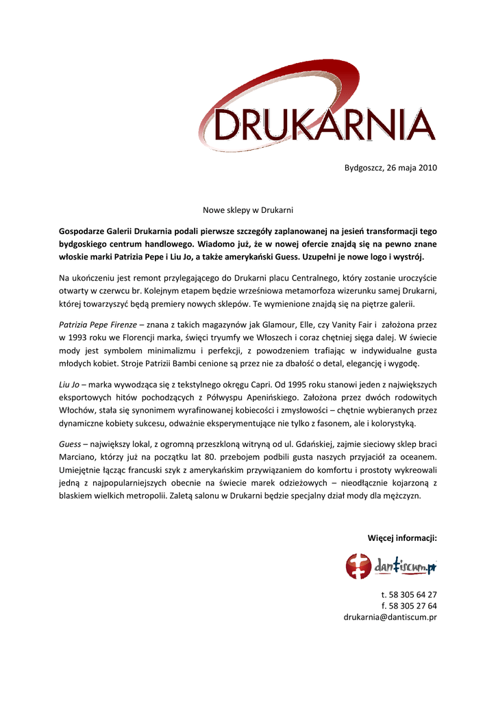 Bydgoszcz, 26 maja 2010 Nowe sklepy w Drukarni Gospodarze Galerii Drukarnia podali pierwsze szczegóły zaplanowanej na jesień transformacji tego bydgoskiego centrum handlowego. handlowego Wiadomo już, że w nowej ofercie znajdą jdą się na pewno znane włoskie marki Patrizia Pepe i Liu Jo, a także amerykański Guess. Uzupełni je nowe logo i wystrój. Na ukończeniu jest remont przylegającego do Drukarni placu Centralnego, który zostanie z uroczyście otwarty w czerwcu br. Kolejnym etapem będzie wrześniowa metamorfoza wizerunku samej Drukarni, której towarzyszyć będą premiery nowych sklepów. Te wymienione znajdą się na piętrze galerii. galerii Patrizia Pepe Firenze – znana z takich magazynów jak Glamour, Elle, czy Vanity Fair i założona przez w 1993 roku we Florencji marka, święci tryumfy we Włoszech i coraz chętniej sięga dalej. W świecie mody jest symbolem ymbolem minimalizmu i perfekcji, z powodzeniem trafiając w indywidualne gusta młodych kobiet. Stroje Patrizii Bambi cenione są przez nie za dbałość o detal, elegancję elegan i wygodę. Liu Jo – marka wywodząca się z tekstylnego okręgu Capri. Capri. Od 1995 roku stanowi jeden z największych eksportowych hitów pochodzących z Półwyspu Apenińskiego.. Założona przez dwóch rodowitych Włochów, stała się synonimem wyrafinowanej kobiecości i zmysłowości – chętnie ętnie wybieranych przez dynamiczne kobiety sukcesu, odważnie eksperymentujące eksperymentując nie tylko z fasonem,, ale i kolorystyką. Guess – największy lokal, z ogromną przeszkloną p witryną od ul. Gdańskiej, zajmie sieciowy sklep braci Marciano, którzy już na początku lat 80. przebojem podbili gusta naszych przyjaciół za oceanem. oceanem Umiejętnie łącząc francuski szyk z amerykańskim przywiązaniem do komfortu i prostoty wykreowali jedną z najpopularniejszych obecnie na świecie marek odzieżowych – nieodłącznie kojarzoną z blaskiem wielkich metropolii. Zaletą salonu w Drukarni będzie specjalny dział mody dla mężczyzn. Więcej informacji: t. 58 305 64 27 f. 58 305 27 64 [email protected]