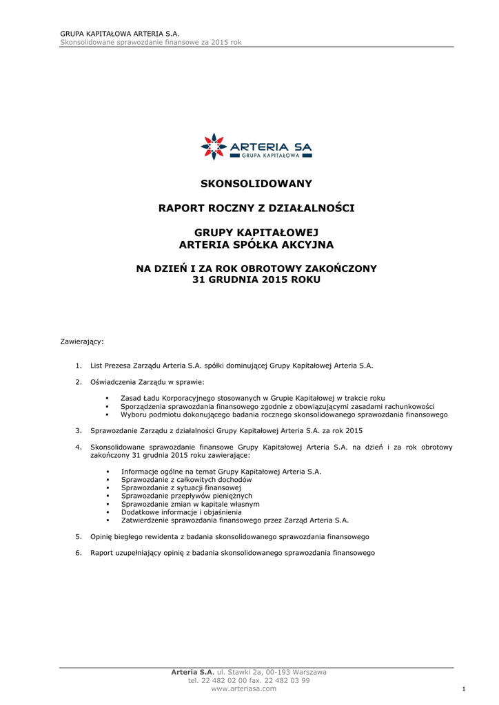 GRUPA KAPITAŁOWA ARTERIA S.A. Skonsolidowane sprawozdanie finansowe za 2015 rok SKONSOLIDOWANY RAPORT ROCZNY Z DZIAŁALNOŚCI GRUPY KAPITAŁOWEJ ARTERIA SPÓŁKA AKCYJNA NA DZIEŃ I ZA ROK OBROTOWY ZAKOŃCZONY 31 GRUDNIA 2015 ROKU Zawierający: 1. List Prezesa Zarządu Arteria S.A. spółki dominującej Grupy Kapitałowej Arteria S.A. 2. Oświadczenia Zarządu w sprawie: Zasad Ładu Korporacyjnego stosowanych w Grupie Kapitałowej w trakcie roku Sporządzenia sprawozdania finansowego zgodnie z obowiązującymi zasadami rachunkowości Wyboru podmiotu dokonującego badania rocznego skonsolidowanego sprawozdania finansowego 3. Sprawozdanie Zarządu z działalności Grupy Kapitałowej Arteria S.A. za rok 2015 4. Skonsolidowane sprawozdanie finansowe Grupy Kapitałowej Arteria S.A. na dzień i za rok obrotowy zakończony 31 grudnia 2015 roku zawierające: Informacje ogólne na temat Grupy Kapitałowej Arteria S.A. Sprawozdanie z całkowitych dochodów Sprawozdanie z sytuacji finansowej Sprawozdanie przepływów pieniężnych Sprawozdanie zmian w kapitale własnym Dodatkowe informacje i objaśnienia Zatwierdzenie sprawozdania finansowego przez Zarząd Arteria S.A. 5. Opinię biegłego rewidenta z badania skonsolidowanego sprawozdania finansowego 6. Raport uzupełniający opinię z badania skonsolidowanego sprawozdania finansowego Arteria S.A. ul. Stawki 2a, 00-193 Warszawa tel. 22 482 02 00 fax. 22 482 03 99 www.arteriasa.com 1 GRUPA KAPITAŁOWA ARTERIA S.A. Skonsolidowane sprawozdanie finansowe za 2015 rok DO WALNEGO ZGROMADZENIA AKCJONARIUSZY Jednostki dominującej Grupy Kapitałowej Arteria Spółka Akcyjna Szanowni Państwo. W raportowanym okresie Zarząd Arteria S.A., zrealizował zamierzone cele strategiczne, stając się liderem procesu konsolidacji rynku call center w Polsce. Zgodnie z wcześniejszą zapowiedzią, Zarząd przeprowadził w 2015 roku akwizycje dwóch spółek z branży. Pod koniec sierpnia sfinalizował przejęcie spółki Contact Center Sp. z o.o. kosztem 9,07 mln zł, natomiast w połowie grudnia zakończył z powodzeniem akwizycję BPO Management Sp. z o.o. płacąc 3,8 mln zł za 100% udziałów tej spółki. Wskazane przejęcia znacząco zwiększyły ilość stanowisk telemarketingowych działających w ramach Grupy Kapitałowej do ponad 2200 oraz poszerzyły portfel obsługiwanych klientów w tym segmencie, zwłaszcza z branży energetycznej i telekomunikacyjnej. Działaniom akwizycyjnym towarzyszył intensywny rozwój organiczny w segmencie usług call center, prowadzonych zwłaszcza w ramach obsługi klienta. Przykładem tego trendu jest projekt realizowany dla globalnego klienta w segmencie marketingu internetowego na dziewięciu rynkach Europy Środkowej i Wschodniej (Rosja, Ukraina, Rumunia, Węgry, Czechy, Słowacja, Białoruś, Kazachstan, Polska, a od grudnia dodatkowo Litwa), którego skala rosła systematycznie przez cały 2015 rok. Większą skalę osiągnęły też projekty realizowane dla klientów z branży energetycznej, finansowej, wydawniczej czy telekomunikacyjnej. W efekcie Grupa Kapitałowa osiągnęła w 2015 roku rekordowe przychody w segmencie call center, które w całym roku wyniosły 91 425 tysięcy złotych. Tym samym Grupa Kapitałowa Arteria S.A. umocniła się na pozycji numer jeden komercyjnych call center w Polsce. Kolejnym celem Zarządu jest zwiększenie aktywów zarządzanej Grupy Kapitałowej do poziomu odpowiadającego liczącym się spółkom z branży w skali europejskiej, co ma nastąpić w ciągu kolejnych 24 miesięcy tj. do końca 2017 roku. Grupa Kapitałowa Arteria S.A. to także dynamicznie rosnące usługi Wsparcia Sprzedaży w zakresie dostarczania specjalistycznych systemów IT, projektowania procesów biznesowych, realizacji eventów i kampanii marketingowych, programów lojalnościowych czy usług merchandisingowych oraz dostawy i specjalistycznego montażu urządzeń RTV/AGD. Dynamikę tego segmentu najlepiej potwierdzają rosnące przychody, które w 2015 roku wyniosły 78 669 tysięcy złotych wobec 51 488 tysięcy złotych osiągniętych rok wcześniej. Były zatem wyższe o 153%, kwotowo o 27 181 tysięcy złotych. Tak dynamiczny wzrost przychodów był wynikiem zaplanowanej strategii zdobywania rynku, zwłaszcza w IV kwartale ubiegłego roku. Trzecim segmentem działalności na poziomie skonsolidowanym jest sprzedaż aktywna, która w 2015 roku stopniowo zdobywała rynek w oparciu o sprzedaż produktów finansowych. W związku z zaplanowanym na rok bieżący, dalszym, dynamicznym rozwojem oraz kontynuowania restrukturyzacji rozwojowej oraz wewnętrznego uporządkowania struktur dwóch spółek zakupionych w 2015 roku, Zarząd Arteria S.A. nie podjął jeszcze decyzji dotyczącej rekomendacji wypłaty dywidendy w roku bieżącym. Rekomendacja ta zostanie przedstawiona przed odbyciem Zwyczajnego Walnego Zgromadzenia Akcjonariuszy Arteria S.A. zatwierdzającego sprawozdania finansowe za 2015 rok. Reasumując, w załączeniu mam przyjemność zaprezentować Państwu Skonsolidowane Sprawozdanie Finansowe Arteria S.A. wraz ze sprawozdaniem Zarządu za rok ubiegły. Znajdują się w nim szczegółowe dane dotyczące działalności operacyjnej Arterii S.A. oraz spółek zależnych należących do Grupy Kapitałowej w 2015 roku oraz informacje o planach na kolejne lata. Jestem przekonany, że wysiłek jaki włożyliśmy w rozwój Arteria S.A. oraz wszystkich spółek wchodzących w skład Grupy Kapitałowej w 2015 roku wzmocniony motywacją i osobistym zaangażowaniem wszystkich pracowników i współpracowników, pozwoli osiągać kolejne sukcesy w 2016 roku i latach następnych, co przełoży się na stopniowy wzrost kapitalizacji Spółki, odpowiadającej jej potencjałowi wzrostu i rzeczywistej pozycji rynkowej. Z poważaniem, Marcin Marzec, Prezes Zarządu ARTERIA S.A. Arteria S.A. ul. Stawki 2a, 00-193 Warszawa tel. 22 482 02 00 fax. 22 482 03 99 www.arteriasa.com 2 GRUPA KAPITAŁOWA ARTERIA S.A. Skonsolidowane