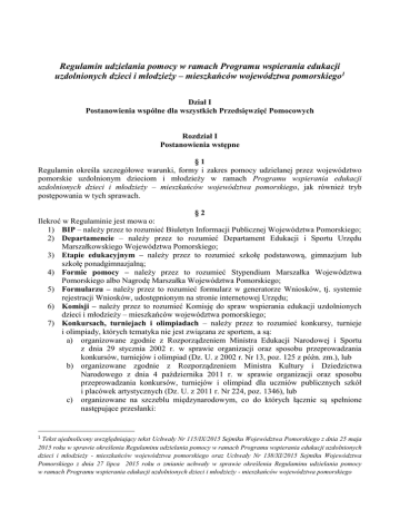 Regulamin udzielania pomocy w ramach Programu wspierania edukacji uzdolnionych dzieci i młodzieży – mieszkańców województwa pomorskiego1 Dział I Postanowienia wspólne dla wszystkich Przedsięwzięć Pomocowych Rozdział I Postanowienia wstępne §1 Regulamin określa szczegółowe warunki, formy i zakres pomocy udzielanej przez województwo pomorskie uzdolnionym dzieciom i młodzieży w ramach Programu wspierania edukacji uzdolnionych dzieci i młodzieży – mieszkańców województwa pomorskiego, jak również tryb postępowania w tych sprawach. §2 Ilekroć w Regulaminie jest mowa o: 1) BIP – należy przez to rozumieć Biuletyn Informacji Publicznej Województwa Pomorskiego; 2) Departamencie – należy przez to rozumieć Departament Edukacji i Sportu Urzędu Marszałkowskiego Województwa Pomorskiego; 3) Etapie edukacyjnym – należy przez to rozumieć szkołę podstawową, gimnazjum lub szkołę ponadgimnazjalną; 4) Formie pomocy – należy przez to rozumieć Stypendium Marszałka Województwa Pomorskiego albo Nagrodę Marszałka Województwa Pomorskiego; 5) Formularzu – należy przez to rozumieć formularz w generatorze Wniosków, tj. systemie rejestracji Wniosków, udostępnionym na stronie internetowej Urzędu; 6) Komisji – należy przez to rozumieć Komisję do spraw wspierania edukacji uzdolnionych dzieci i młodzieży – mieszkańców województwa pomorskiego; 7) Konkursach, turniejach i olimpiadach – należy przez to rozumieć konkursy, turnieje i olimpiady, których tematyka nie jest związana ze sportem, a są: a) organizowane zgodnie z Rozporządzeniem Ministra Edukacji Narodowej i Sportu z dnia 29 stycznia 2002 r. w sprawie organizacji oraz sposobu przeprowadzania konkursów, turniejów i olimpiad (Dz. U. z 2002 r. Nr 13, poz. 125 z późn. zm.), lub b) organizowane zgodnie z Rozporządzeniem Ministra Kultury i Dziedzictwa Narodowego z dnia 4 października 2011 r. w sprawie organizacji oraz sposobu przeprowadzania konkursów, turniejów i olimpiad dla uczniów publicznych szkół i placówek artystycznych (Dz. U. z 2011 r. Nr 224, poz. 1346), lub c) organizowane na szczeblu międzynarodowym, co do których łącznie są spełnione następujące przesłanki: 1 Tekst ujednolicony uwzględniający tekst Uchwały Nr 115/IX/2015 Sejmiku Województwa Pomorskiego z dnia 25 maja 2015 roku w sprawie określenia Regulaminu udzielania pomocy w ramach Programu wspierania edukacji uzdolnionych dzieci i młodzieży - mieszkańców województwa pomorskiego oraz Uchwały Nr 138/XI/2015 Sejmiku Województwa Pomorskiego z dnia 27 lipca 2015 roku o zmianie uchwały w sprawie określenia Regulaminu udzielania pomocy w ramach Programu wspierania edukacji uzdolnionych dzieci i młodzieży - mieszkańców województwa pomorskiego 8) 9) 10) 11) 12) 13) 14) 15) 16) 17) 18) udział w nich nie wymaga uzyskania członkostwa w jakichkolwiek podmiotach, udział w nich jest bezpłatny, ranking laureatów i finalistów ma charakter międzynarodowy, co oznacza, że ranking ten uwzględnia wszystkich uczestników niezależnie od kraju pochodzenia, możliwe jest stwierdzenie samodzielności udziału ucznia w konkursie, turnieju lub olimpiadzie, co oznacza, że w ramach konkursu, turnieju lub olimpiady przeprowadzana jest bezpośrednia identyfikacja uczestnika oraz co najmniej etap finałowy konkursu, turnieju lub olimpiady wymaga osobistego udziału uczestnika, nie są przeprowadzane wyłącznie za pomocą środka bezpośredniego porozumiewania się na odległość, konkurs, turniej lub olimpiada składa się z minimum dwóch etapów, spośród których jeden etap jest etapem kwalifikacyjnym; Liście rezerwowej – należy przez to rozumieć listę Wniosków ujętych w Rankingu, które uzyskały mniejszą liczbę punktów niż Wnioski Uprawnionych; Obszarze wiejskim – należy przez to rozumieć tereny leżące poza granicami administracyjnymi miast – obszary gmin wiejskich oraz część wiejską (leżącą poza miastem) gminy miejsko-wiejskiej, zgodnie z definicją Głównego Urzędu Statystycznego, która opiera się na podziale jednostek administracyjnych zastosowanym w rejestrze TERYT; Podaniu – należy przez to rozumieć podanie o ponowną ocenę merytoryczną Wniosku; Przedsięwzięciu Pomocowym – należy przez to rozumieć zespół Form pomocy, przeznaczonych dla poszczególnych grup Uczniów oraz szczegółowo określonych w dziale II Regulaminu; Programie – należy przez to rozumieć Program wspierania edukacji uzdolnionych dzieci i młodzieży – mieszkańców województwa pomorskiego, przyjęty na podstawie uchwały Sejmiku Województwa Pomorskiego Nr 902/XLII/14 z dnia 28 lipca 2014 roku w sprawie przyjęcia Programu wspierania edukacji uzdolnionych dzieci i młodzieży – mieszkańców Województwa Pomorskiego; Rankingu – należy przez to rozumieć listę Wniosków, uszeregowanych pod względem liczby uzyskanych punktów, odrębnie dla każdego Etapu edukacyjnego; Regulaminie – należy przez to rozumieć niniejszy regulamin; Rekomendacji – należy przez to rozumieć informację sporządzaną przez Komisję i dotyczącą przyznania Form pomocy, zawierającą propozycje dotyczące: a) liczby proponowanych Form pomocy – z zastrzeżeniem, że liczba ta powinna być porównywalna w każdym z Etapów edukacyjnych; b) wartości proponowanych Form pomocy – z zastrzeżeniem, że wartości te powinny mieścić się w ramach limitów określonych w dziale II Regulaminu odrębnie dla każdego Przedsięwzięcia pomocowego; Szkole ponadgimnazjalnej – należy przez to rozumieć: liceum ogólnokształcące, technikum i zasadniczą szkołę zawodową; Średniej ocen – należy przez to rozumieć średnią ocen z zajęć edukacyjnych osiągniętą w roku szkolnym poprzedzającym rok, na który składany jest Wniosek, wyrażoną w postaci wartości liczbowej podanej z dokładnością do trzech miejsc po przecinku, bez stosowania zaokrągleń; Uczniu – należy przez 