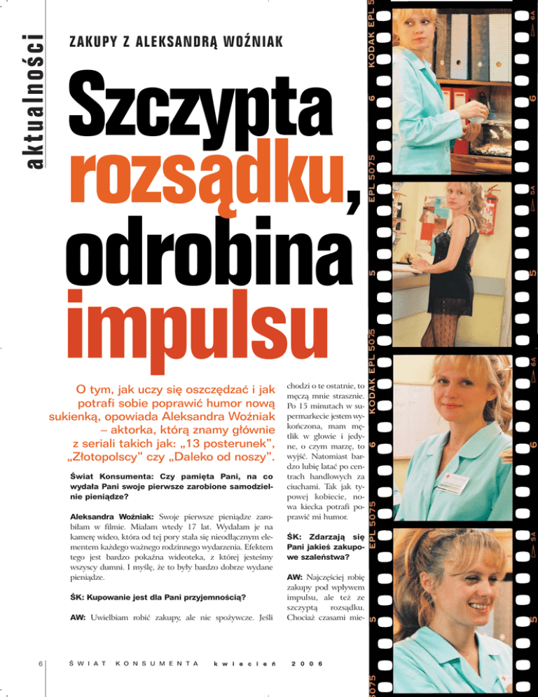 aktualnoÊci ZAKUPY Z ALEKSANDRÑ WOèNIAK Szczypta rozsàdku, odrobina impulsu O tym, jak uczy si´ oszcz´dzaç i jak potrafi sobie poprawiç humor nowà sukienkà, opowiada Aleksandra Woêniak – aktorka, którà znamy g∏ównie z seriali takich jak: „13 posterunek”, „Z∏otopolscy” czy „Daleko od noszy”. Âwiat Konsumenta: Czy pami´ta Pani, na co wyda∏a Pani swoje pierwsze zarobione samodzielnie pieniàdze? Aleksandra Woêniak: Swoje pierwsze pieniàdze zarobi∏am w filmie. Mia∏am wtedy 17 lat. Wyda∏am je na kamer´ wideo, która od tej pory sta∏a si´ nieod∏àcznym elementem ka˝dego wa˝nego rodzinnego wydarzenia. Efektem tego jest bardzo pokaêna wideoteka, z której jesteÊmy wszyscy dumni. I myÊl´, ˝e to by∏y bardzo dobrze wydane pieniàdze. ÂK: Kupowanie jest dla Pani przyjemnoÊcià? AW: Uwielbiam robiç zakupy, ale nie spo˝ywcze. JeÊli 6  W I A T K O N S U M E N T A k w i e c i e ƒ chodzi o te ostatnie, to m´czà mnie strasznie. Po 15 minutach w supermarkecie jestem wykoƒczona, mam m´tlik w g∏owie i jedyne, o czym marz´, to wyjÊç. Natomiast bardzo lubi´ lataç po centrach handlowych za ciuchami. Tak jak typowej kobiecie, nowa kiecka potrafi poprawiç mi humor. ÂK: Zdarzajà si´ Pani jakieÊ zakupowe szaleƒstwa? AW: Najcz´Êciej robi´ zakupy pod wp∏ywem impulsu, ale te˝ ze szczyptà rozsàdku. Chocia˝ czasami mie- 2 0 0 6 Mam raczej rozsàdne podejÊcie do ˝ycia i nadmiar pieni´dzy wykorzysta∏abym nie po to, by staç si´ maniaczkà, dla której wydawanie pieni´dzy jest jedynym zaj´ciem i celem w ˝yciu. Pieniàdze mogà zdzia∏aç wiele dobrego. wam wyrzuty sumienia, kiedy kupi´ coÊ bardzo drogiego albo niepraktycznego. Rzadko, ale zdarza mi si´ kupiç jakiÊ ciuch pod wp∏ywem impulsu. Nie nosz´ go póêniej, bo wydaje mi si´ na przyk∏ad za ekstrawagancki. Ale chyba nie jestem w tym osamotniona... cj´ naszych marzeƒ. Ich posiadanie daje mo˝liwoÊç pomocy ubogim. Krótko mówiàc pieniàdze mogà dawaç wiele nowych mo˝liwoÊci. ÂK: Czy to oznacza, ˝e ∏atwo ulega Pani promocjom? AW: Zdrowie! AW: OczywiÊcie zwracam uwag´ na promocje, ale nie skupiam si´ g∏ównie na nich. Najpierw szukam czegoÊ, co mi si´ podoba, a dopiero potem, gdy ju˝ nie wyobra˝am sobie mojej szafy bez danej cz´Êci garderoby, patrz´ na cen´. No i najcz´Êciej... ulegam. ÂK: A na co nie wyda∏aby Pani ani z∏otówki? ÂK: Na co lub na kogo wydaje Pani najwi´cej pieni´dzy? AW: Ciàgle si´ tego ucz´. Ale robi´ post´py. ÂK: Co Pani zdaniem jest warte ka˝dych pieni´dzy? aktualnoÊci ZAKUPY Z ALEKSANDRÑ WOèNIAK AW: Na wszelkie zbrojne konflikty. ÂK: Czy lubi i potrafi Pani oszcz´dzaç? ÂK: Dzi´kuj´ za rozmow´ AW: Najdro˝szà rzeczà, którà sobie do tej pory kupi∏am, jest moje mieszkanie. A w codziennym ˝yciu zdecydowanie najwi´cej pieni´dzy wydaj´ na moje córeczki – g∏ównie na ubrania i zabawki dla nich. Rozmawia∏a: Agnieszka Buczak ÂK: Jakie znaczenie ma dla Pani marka produktów, które Pani kupuje? AW: W przypadku sprz´tu i kosmetyków zwracam uwag´ na mark´, bo uwa˝am, ˝e jest ona gwarancjà dobrej jakoÊci. W przypadku odzie˝y mo˝na od razu oceniç jej gatunek. I tu nie k∏ad´ ju˝ nacisku na firm´. ÂK: Czy jest w tej chwili jakiÊ przedmiot, o którego zakupie Pani marzy? Najpierw szukam czegoÊ, co mi si´ podoba, a dopiero potem, gdy ju˝ nie wyobra˝am sobie mojej szafy bez danej cz´Êci garderoby, patrz´ na cen´. No i najcz´Êciej... ulegam. AW: Owszem – bardzo du˝y przedmiot: wi´ksze mieszkanie. Poniewa˝ wola∏abym nie braç kredytu, musz´ na nie jeszcze troch´ poczekaç. fot. Polsat ÂK: Czym dla Pani w ogóle sà pieniàdze? W czym mogà pomóc, w czym przeszkodziç? AW: Nie wyobra˝am sobie, ˝eby mi mog∏y w czymÊ przeszkodziç. Mam raczej rozsàdne podejÊcie do ˝ycia i nadmiar pieni´dzy wykorzysta∏abym nie po to, by staç si´ maniaczkà, dla której wydawanie pieni´dzy jest jedynym zaj´ciem i celem w ˝yciu. Pieniàdze mogà zdzia∏aç wiele dobrego. Dajà poczucie bezpieczeƒstwa, u∏atwiajà realiza-  W I A T K O N S U M E N T A k w i e c i e ƒ 2 0 0 6 7