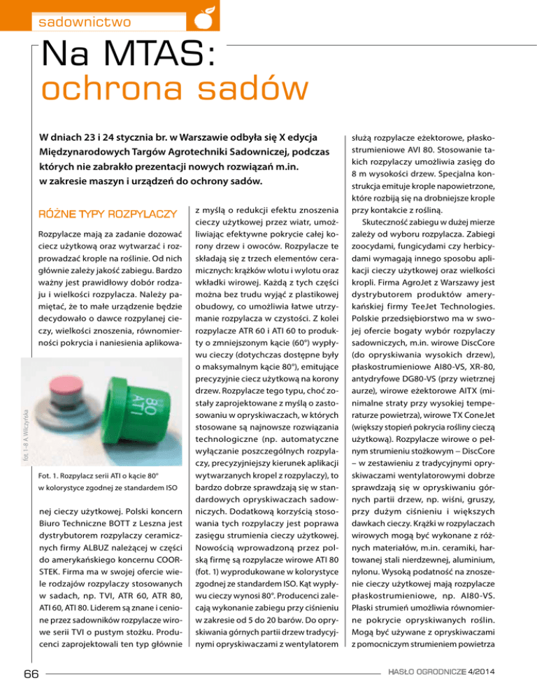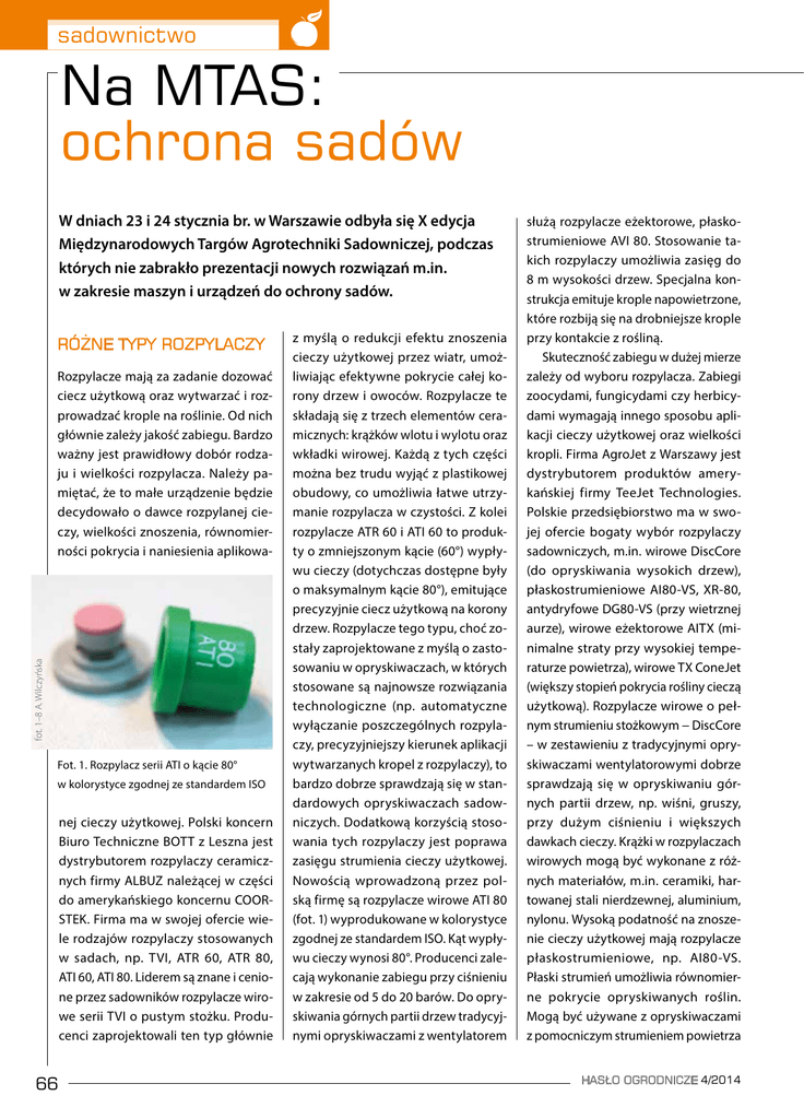 sadownictwo Na MTAS: ochrona sadów W dniach 23 i 24 stycznia br. w Warszawie odbyła się X edycja Międzynarodowych Targów Agrotechniki Sadowniczej, podczas których nie zabrakło prezentacji nowych rozwiązań m.in. w zakresie maszyn i urządzeń do ochrony sadów. RÓŻNE TYPY ROZPYLACZY fot. 1–8 A. Wilczyńska Rozpylacze mają za zadanie dozować ciecz użytkową oraz wytwarzać i rozprowadzać krople na roślinie. Od nich głównie zależy jakość zabiegu. Bardzo ważny jest prawidłowy dobór rodzaju i wielkości rozpylacza. Należy pamiętać, że to małe urządzenie będzie decydowało o dawce rozpylanej cieczy, wielkości znoszenia, równomierności pokrycia i naniesienia aplikowa- Fot. 1. Rozpylacz serii ATI o kącie 80° w kolorystyce zgodnej ze standardem ISO nej cieczy użytkowej. Polski koncern Biuro Techniczne BOTT z Leszna jest dystrybutorem rozpylaczy ceramicznych firmy ALBUZ należącej w części do amerykańskiego koncernu COORSTEK. Firma ma w swojej ofercie wiele rodzajów rozpylaczy stosowanych w sadach, np. TVI, ATR 60, ATR 80, ATI 60, ATI 80. Liderem są znane i cenione przez sadowników rozpylacze wirowe serii TVI o pustym stożku. Producenci zaprojektowali ten typ głównie 66 z myślą o redukcji efektu znoszenia cieczy użytkowej przez wiatr, umożliwiając efektywne pokrycie całej korony drzew i owoców. Rozpylacze te składają się z trzech elementów ceramicznych: krążków wlotu i wylotu oraz wkładki wirowej. Każdą z tych części można bez trudu wyjąć z plastikowej obudowy, co umożliwia łatwe utrzymanie rozpylacza w czystości. Z kolei rozpylacze ATR 60 i ATI 60 to produkty o zmniejszonym kącie (60°) wypływu cieczy (dotychczas dostępne były o maksymalnym kącie 80°), emitujące precyzyjnie ciecz użytkową na korony drzew. Rozpylacze tego typu, choć zostały zaprojektowane z myślą o zastosowaniu w opryskiwaczach, w których stosowane są najnowsze rozwiązania technologiczne (np. automatyczne wyłączanie poszczególnych rozpylaczy, precyzyjniejszy kierunek aplikacji wytwarzanych kropel z rozpylaczy), to bardzo dobrze sprawdzają się w standardowych opryskiwaczach sadowniczych. Dodatkową korzyścią stosowania tych rozpylaczy jest poprawa zasięgu strumienia cieczy użytkowej. Nowością wprowadzoną przez polską firmę są rozpylacze wirowe ATI 80 (fot. 1) wyprodukowane w kolorystyce zgodnej ze standardem ISO. Kąt wypływu cieczy wynosi 80°. Producenci zalecają wykonanie zabiegu przy ciśnieniu w zakresie od 5 do 20 barów. Do opryskiwania górnych partii drzew tradycyjnymi opryskiwaczami z wentylatorem służą rozpylacze eżektorowe, płaskostrumieniowe AVI 80. Stosowanie takich rozpylaczy umożliwia zasięg do 8 m wysokości drzew. Specjalna konstrukcja emituje krople napowietrzone, które rozbiją się na drobniejsze krople przy kontakcie z rośliną. Skuteczność zabiegu w dużej mierze zależy od wyboru rozpylacza. Zabiegi zoocydami, fungicydami czy herbicydami wymagają innego sposobu aplikacji cieczy użytkowej oraz wielkości kropli. Firma AgroJet z Warszawy jest dystrybutorem produktów amerykańskiej firmy TeeJet Technologies. Polskie przedsiębiorstwo ma w swojej ofercie bogaty wybór rozpylaczy sadowniczych, m.in. wirowe DiscCore (do opryskiwania wysokich drzew), płaskostrumieniowe AI80-VS, XR-80, antydryfowe DG80-VS (przy wietrznej aurze), wirowe eżektorowe AITX (minimalne straty przy wysokiej temperaturze powietrza), wirowe TX ConeJet (większy stopień pokrycia rośliny cieczą użytkową). Rozpylacze wirowe o pełnym strumieniu stożkowym − DiscCore – w zestawieniu z tradycyjnymi opryskiwaczami wentylatorowymi dobrze sprawdzają się w opryskiwaniu górnych partii drzew, np. wiśni, gruszy, przy dużym ciśnieniu i większych dawkach cieczy. Krążki w rozpylaczach wirowych mogą być wykonane z różnych materiałów, m.in. ceramiki, hartowanej stali nierdzewnej, aluminium, nylonu. Wysoką podatność na znoszenie cieczy użytkowej mają rozpylacze płaskostrumieniowe, np. AI80-VS. Płaski strumień umożliwia równomierne pokrycie opryskiwanych roślin. Mogą być używane z opryskiwaczami z pomocniczym strumieniem powietrza HASŁO OGRODNICZE 4/2014 sadownictwo (PSP) lub bez niego. Krople wytwarzane z rozpylacza eżektorowego i kąt strumienia wynoszący 80° zwiększają zasięg aplikacji cieczy użytkowej. Rozpylacze serii TX ConeJet wytwarzają strumień cieczy o kącie 80° przy minimalnym ciśnieniu 7 barów. Najczęściej stosowane są w sadach, jagodnikach, winnicach i uprawach specjalistycznych, przy wykorzystaniu opryskiwaczy z PSP. Nowością wprowadzoną do sprzedaży na najbliższy sezon są rozpylacze wirowe serii TXR (fot. 2) ConeJet wytwarzające bardzo drobne krople w szerokim zakresie ciśnienia roboczego od 2 do 22 barów. Specjalna konstrukcja została zaprojektowana do stosowania w opryskiwaczach sadowniczych z PSP. Odpowiednią jakość zapewniają ceramiczne elementy, które charakteryzują się szczególną odpornością na ścieranie przy wysokim ciśnieniu roboczym. Fot. 2. Rozpylacz serii TXR firmy TeeJet OPRYSKIWACZE – NOWE ROZWIĄZANIA Bogata ekspozycja opryskiwaczy firmy „Bury” Maszyny Rolnicze przyciągała wzrok przybyłych sadowników. Znany model Wulkan (fot. 3) o pojemności zbiornika 1000 l, 1500 l lub 2000 l wyposażony jest w nowoczesne rozwiązanie przystawki (wysokość 2,7 m lub 3 m) , których specjalna konstrukcja (nieruchome kierownice) umożliwia równomierne rozłożenie strumienia powietrza na lewą i prawą stronę oraz do góry na wyższe partie korony drzew. Opryskiwacz Wulkan może być wyposażony w wentylator 12- lub 16-łopatkowy. Na przystawce o wysokość 2,7 m zamontowanych jest 8 rozpylaczy (z prawej strony), a na tej o wysokości 3 m – 10 szt. W zależności od potrzeb sadownika, mogą być typu wirowego o pustym lub pełnym stożku lub płaskostrumieniowe. W ostatnim reklama HASŁO OGRODNICZE 4/2014 67 sadownictwo Fot. 4. Bieżące