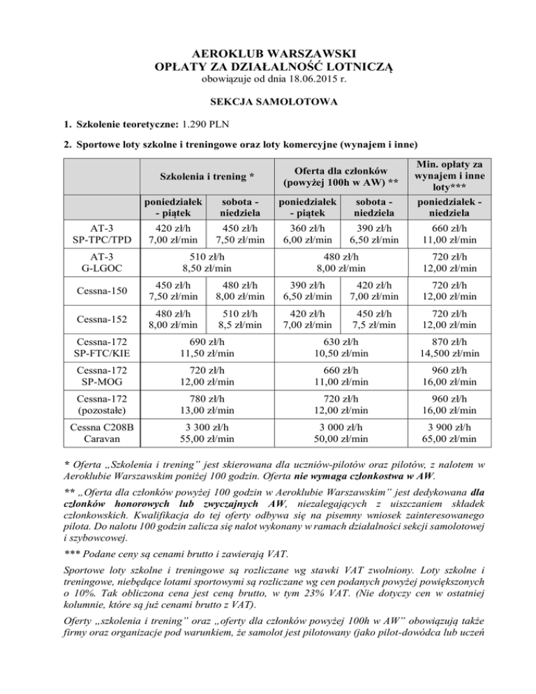 AEROKLUB WARSZAWSKI OPŁATY ZA DZIAŁALNOŚĆ LOTNICZĄ obowiązuje od dnia 18.06.2015 r. SEKCJA SAMOLOTOWA 1. Szkolenie teoretyczne: 1.290 PLN 2. Sportowe loty szkolne i treningowe oraz loty komercyjne (wynajem i inne) poniedziałek - piątek sobota niedziela poniedziałek - piątek sobota niedziela Min. opłaty za wynajem i inne loty*** usługowe poniedziałek niedziela 420 zł/h 7,00 zł/min 450 zł/h 7,50 zł/min 360 zł/h 6,00 zł/min 390 zł/h 6,50 zł/min 660 zł/h 11,00 zł/min Szkolenia i trening * AT-3 SP-TPC/TPD AT-3 G-LGOC Oferta dla członków (powyżej 100h w AW) ** 510 zł/h 8,50 zł/min 480 zł/h 8,00 zł/min 720 zł/h 12,00 zł/min Cessna-150 450 zł/h 7,50 zł/min 480 zł/h 8,00 zł/min 390 zł/h 6,50 zł/min 420 zł/h 7,00 zł/min 720 zł/h 12,00 zł/min Cessna-152 480 zł/h 8,00 zł/min 510 zł/h 8,5 zł/min 420 zł/h 7,00 zł/min 450 zł/h 7,5 zł/min 720 zł/h 12,00 zł/min Cessna-172 SP-FTC/KIE 690 zł/h 11,50 zł/min 630 zł/h 10,50 zł/min 870 zł/h 14,500 zł/min Cessna-172 SP-MOG 720 zł/h 12,00 zł/min 660 zł/h 11,00 zł/min 960 zł/h 16,00 zł/min Cessna-172 (pozostałe) 780 zł/h 13,00 zł/min 720 zł/h 12,00 zł/min 960 zł/h 16,00 zł/min Cessna C208B Caravan 3 300 zł/h 55,00 zł/min 3 000 zł/h 50,00 zł/min 3 900 zł/h 65,00 zł/min * Oferta „Szkolenia i trening” jest skierowana dla uczniów-pilotów oraz pilotów, z nalotem w Aeroklubie Warszawskim poniżej 100 godzin. Oferta nie wymaga członkostwa w AW. ** „Oferta dla członków powyżej 100 godzin w Aeroklubie Warszawskim” jest dedykowana dla członków honorowych lub zwyczajnych AW, niezalegających z uiszczaniem składek członkowskich. Kwalifikacja do tej oferty odbywa się na pisemny wniosek zainteresowanego pilota. Do nalotu 100 godzin zalicza się nalot wykonany w ramach działalności sekcji samolotowej i szybowcowej. *** Podane ceny są cenami brutto i zawierają VAT. Sportowe loty szkolne i treningowe są rozliczane wg stawki VAT zwolniony. Loty szkolne i treningowe, niebędące lotami sportowymi są rozliczane wg cen podanych powyżej powiększonych o 10%. Tak obliczona cena jest ceną brutto, w tym 23% VAT. (Nie dotyczy cen w ostatniej kolumnie, które są już cenami brutto z VAT). Oferty „szkolenia i trening” oraz „oferty dla członków powyżej 100h w AW” obowiązują także firmy oraz organizacje pod warunkiem, że samolot jest pilotowany (jako pilot-dowódca lub uczeń w locie szkolnym) przez członka honorowego, zwyczajnego lub wspierającego AW. W takim przypadku kwalifikacja do odpowiedniej kategorii stawek odbywa się analogicznie jak poprzednio, na podstawie nalotu tego pilota w Aeroklubie Warszawskim. Gdy usługi nie są świadczone na rzecz osób uprawiających sport, dolicza się 10% - tak obliczona cena jest ceną brutto, w tym 23% VAT. 3. Opłata za instruktora W lotach sportowych z instruktorem w samolocie oraz podczas szkolenia/treningu z instruktorem na symulatorze do każdej minuty lotu dolicza się opłatę w wysokości 1,50 zł/min. W lotach samodzielnych uczniów-pilotów nadzór instruktorski gratis! 4. Wypożyczenie sprzętu na zawody i pokazy lotnicze Udostępnienie członkom AW sprzętu na zawody samolotowe i pokazy lotnicze odbywa się na określonych oddzielnie zasadach i podlega opłatom wg stawki „poniedziałek-piątek”. 5. Opłaty lotniskowe i zakup paliwa Piloci i uczniowie-piloci wszelkie dodatkowe opłaty ponoszą indywidualnie za wyjątkiem lotnisk Babice i Chrcynno. Podane ceny skalkulowano na podstawie wartości paliwa dostępnego w AW. W przypadku tankowania samolotu poza AW zostanie doliczona opłata dodatkowa za lot stanowiąca różnicę ceny zakupu paliwa poza AW i wartości paliwa dostępnego w AW. Opłata dodatkowa zostanie potrącona przy rozliczeniu faktury zakupu paliwa poza AW na podstawie kompletu dokumentów niezbędnych do rozliczenia zużycia paliwa zwolnionego z akcyzy. Rozliczenie następuje, jeżeli nie było możliwe tankowanie w AW oraz umowa użytkowania statku powietrznego przewiduje możliwość tankowania na koszt AW. 6. Rozliczenia Wykonywanie lotów z ujemnym saldem jest zabronione. Warunkiem korzystania z cen podanych w pkt. 2 i 3 jest brak zaległych zobowiązań wobec Aeroklubu Warszawskiego oraz dokonanie przedpłaty w odpowiedniej wysokości i wykonywanie lotu z dodatnim stanem konta pilota. Przed wykonaniem lotu pilot zobowiązany jest zasilić konto (dokonać wpłaty) w wysokości pozwalającej na wykonanie planowanego zadania. W wyjątkowych przypadkach osiągnięcia salda mniejszego od zera, pilot zobowiązany jest niezwłocznie uzupełnić stan konta. W rażących przypadkach zalegania z opłatami lub wykonania lotów z ujemnym saldem, Aeroklub zastrzega sobie prawo do naliczenia opłat zgodnie z powyższym cennikiem powiększonych o 30% (wymaga każdorazowej decyzji Dyrektora AW) oraz publikacji listy dłużników wraz zaległościami. Przekazywanie niewykorzystanych przedpłat pomiędzy kontami różnych osób odbywa się na pisemną prośbę właściciela konta i wymaga zatwierdzenia Dyrektora AW. SEKCJA SZYBOWCOWA 1. Teoretyczny kurs szybowcowy Oferta specjalna dla młodzieży uczącej się do 25 roku życia: 690 PLN Oferta podstawowa dla pozostałych osób: 990 PLN 2. Indywidualny program szkolenia do licencji PL(G): 300 PLN 3. Podstawowe Szkolenie szybowcowe Szkolenie za wyciągarką Cena podstawowa: 4.590 PLN Oferta specjalna dla uczniów i studentów do 25 roku życia: 3.790 PLN Oferta specjalna dla młodzieży do 18 roku życia: 2.990 PLN Szkolenie podstawowe obejmuje 70 lotów (opłata zryczałtowana). Loty dodatkowe (poza opłatą zryczałtowaną) rozliczane są zgodnie z Tabelą B. 4. Szkolenie ponadpodstawowe i inne sportowe loty treningowe Tabela A GOŚĆ Piloci spoza AW Start za samolotem SP-AWA – HOL (zł / min holu) Start za innym samolotem - HOL (zł / min holu) Start za wyciągarką (zł / start) Opłata za szybowiec Opłata za instrukt. do 20 min. (zł / lot) Opłata za inst