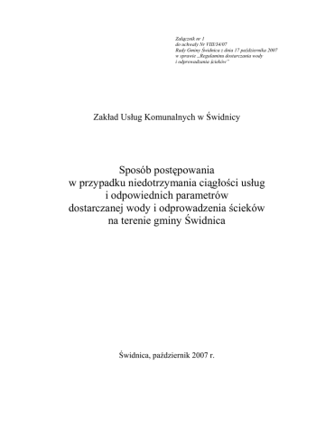 Załącznik nr 1 do uchwały Nr VIII/34/07 Rady Gminy Świdnica z dnia 17 października 2007 w sprawie „Regulaminu dostarczania wody i odprowadzania ścieków” Zakład Usług Komunalnych w Świdnicy Sposób postępowania w przypadku niedotrzymania ciągłości usług i odpowiednich parametrów dostarczanej wody i odprowadzenia ścieków na terenie gminy Świdnica Świdnica, październik 2007 r. Niniejszy załącznik opracowano na podstawie: Ustawy z dnia 7 czerwca 2001 r. o zbiorowym zaopatrzeniu w wodę i zbiorowym odprowadzaniu ścieków (Dz. U. Nr 72 poz. 747 z późn. zm.) Ustawa z dnia 18 lipca 2001 r. Prawo wodne (Dz. U. z 2005 r. Nr 239, poz. 2019) Rozporządzenia Ministra Infrastruktury z dnia 14 stycznia 2002 r. w sprawie określenia przeciętnych norm zuŜycia wody (Dz. U. Nr 8 poz. 70) Rozporządzenia Ministra Spraw Wewnętrznych i Administracji z dnia 16 czerwca 2003 r. w sprawie przeciwpoŜarowego zaopatrzenia w wodę oraz dróg poŜarowych (Dz. U. Nr 121 poz. 1139) Rozporządzenie Ministra Zdrowia z dnia 29 marca 2007 r. w sprawie jakości wody przeznaczonej do spoŜycia przez ludzi (Dz. U. Nr 61 poz. 417) SPIS TREŚCI: Nazwa Strona CZĘŚĆ I „DOSTARCZANIE WODY” Rozdział 1 Dane ogólne 1. Dane dotyczące Gminy Świdnica ………………………………………………………… 2. Ogólna charakterystyka zaopatrzenia w wodę……………………………………………. 3. Lokalizacja komunalnych ujęć wody ...…………………………………………………... 4. Opis ujęć wody będących w administrowaniu Zakładu Usług Komunalnych …………… 5. Opis ujęć wody będących w administrowaniu innych jednostek ………………………… 6. Zapasowe ujęcia wody ……………………………………………………………………. 7. Posiadane zasoby wody …………………………………………………………………... ………4 ………4 ………5 ………6 ………7 ………7 ………8 Rozdział 2 Potrzeby wody na terenie Gminy Świdnica 1. Potrzeby wody w warunkach normalnych dostaw w rozbiciu na grupy odbiorców ……... 2. Potrzeby wody w warunkach normalnych dostaw w rozbiciu na rejony ………………. 3. Niezbędna ilość wody w okresie dostaw minimalnych w rozbiciu na grupy odbiorców .... 4. Niezbędna ilość wody w okresie dostaw minimalnych w rozbiciu na rejony ……………. 5. Zaopatrzenie w wodę do celów poŜarowych ……………………………………………... ………9 ………9 ……..10 ……..10 ……..11 Rozdział 3 Siły i środki do przewozu wody 1. Siły i środki do przewozu wody pitnej …………………………………………………… 2. Siły i środki do przewozu wody przemysłowej …………………………………………... ……..11 ……..12 Rozdział 4 Plan dowozu wody pitnej i przemysłowej ……………………………… ……..13 CZĘŚĆ II „ODPROWADZANIE I OCZYSZCZANIE ŚCIEKÓW” Rozdział 1 Ogólna charakterystyka odprowadzania ścieków na terenie gminy Świdnica ………………………………………………………………… ……..14 Rozdział 2 Ogólna charakterystyka oczyszczania ścieków na terenie gminy Świdnica ………………………………………………………………… ……..15 Rozdział 3 Wykaz sprzętu do przewozu ścieków …………………………………... ……..16 CZĘŚĆ III „INFORMOWANIE LUDNOŚCI” Rozdział 1 Sposób informowania ludności o dowozie wody pitnej i przemysłowej ……..17 Rozdział 2 Sposób informowania ludności o odbiorze ścieków ………………….... ……..17 Część I „DOSTARCZANIE WODY” Rozdział 1 Dane ogólne 1. Dane ogólne dotyczące Gminy Świdnica 1. Powierzchnia Gminy wynosi 160,8 km2. 2. Liczba ludności w Gminie Świdnica na dzień 31.12.2006r.: Lp. 1. 2. 3. 4. 5. 6. 7. 8. 9. 10. 11. 12. 13. Miejscowość Buchałów Drzonów Grabowiec Koźla Letnica Lipno Łochowo Orzewo Piaski Radomia Słone Świdnica Wilkanowo RAZEM Liczba ludności 213 356 224 531 625 172 51 90 195 127 437 1540 998 5.559 2. Ogólna charakterystyka zaopatrzenia w wodę Gmina Świdnica zwodociągowania jest w 75 %, co stanowi około 4.165 1) mieszkańców. Wodociągi znajdują się w następujących miejscowościach: 2) • • • • • • • • • • Drzonów Grabowiec Koźla Letnica Lipno Orzewo Radomia Świdnica lewa strona wsi Wilkanowo od drogi relacji Zielona Góra – śary Osiedle Przylesie w Wilkanowie 3) Prawa strona wsi Wilkanowo od drogi relacji Zielona Góra – śary zostanie zwodociągowana do końca 2007 r., natomiast wsie Buchałów oraz Słone do końca roku 2008. 4) Obszar gminy pod względem zaopatrzenia w wodę moŜna podzielić na 4 rejony: a) Rejon 1 – Świdnica, zaopatrujący w wodę wieś Świdnica, ilość odbiorców wody: 1540 osób, długość sieci wodociągowej 7,2 km; b) Rejon 2 – Koźla, zaopatrujący w wodę wsie Koźla, Letnica, Grabowiec i Lipno, ilość odbiorców wody 1552 osoby, długość sieci wodociągowej 15 km; c) Rejon 3 – Drzonów, zaopatrujący w wodę wsie Drzonów, Radomia, Orzewo, ilość odbiorców wody 573 osób, długość sieci wodociągowej 11,8 km; d) Rejon 4 – Wilkanowo, zaopatrujący w wodę Osiedle Przylesie w Wilkanowie, ilość odbiorców wody 240 osób, długość sieci wodociągowej 1,5 km. 3. Lokalizacja komunalnych ujęć wody a) będących w administrowaniu Zakładu Usług Komunalnych w Świdnicy: Lp 1. 2. 3. 4. Miejscowość Świdnica Koźla Drzonów Wilkanowo Ilość studni 2 2 1 1 Zatwierdzona wydajność eksploatacyjna (m3/h) 57 55 31 18 Strefa ochronna Głębokość ujęcia (m) bezpośrednia bezpośrednia bezpośrednia bezpośrednia 28 42 45 25 Obsługa ujęć wody oraz sieci wodociągowej zlecona jest firmie LAF – Assman, ul. Zamenhofa 46/5, 65-186 Zielona Góra. b) będących w administrowaniu innych jednostek: Miejscowość Lp 1. Wilkanowo – og