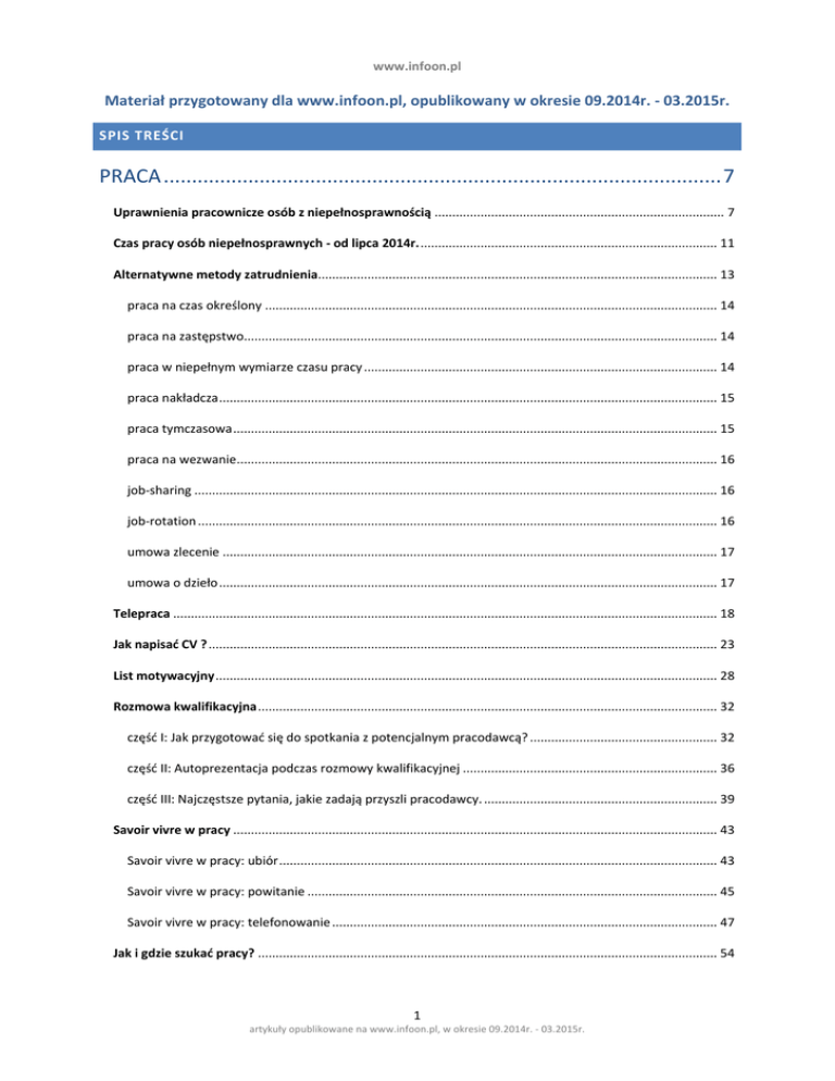 www.infoon.pl Materiał przygotowany dla www.infoon.pl, opublikowany w okresie 09.2014r. - 03.2015r. SPIS TREŚCI PRACA ................................................................................................... 7 Uprawnienia pracownicze osób z niepełnosprawnością .................................................................................. 7 Czas pracy osób niepełnosprawnych - od lipca 2014r. .................................................................................... 11 Alternatywne metody zatrudnienia................................................................................................................. 13 praca na czas określony ................................................................................................................................ 14 praca na zastępstwo...................................................................................................................................... 14 praca w niepełnym wymiarze czasu pracy .................................................................................................... 14 praca nakładcza ............................................................................................................................................. 15 praca tymczasowa ......................................................................................................................................... 15 praca na wezwanie........................................................................................................................................ 16 job-sharing .................................................................................................................................................... 16 job-rotation ................................................................................................................................................... 16 umowa zlecenie ............................................................................................................................................ 17 umowa o dzieło ............................................................................................................................................. 17 Telepraca .......................................................................................................................................................... 18 Jak napisać CV ? ................................................................................................................................................ 23 List motywacyjny .............................................................................................................................................. 28 Rozmowa kwalifikacyjna .................................................................................................................................. 32 część I: Jak przygotować się do spotkania z potencjalnym pracodawcą? ..................................................... 32 część II: Autoprezentacja podczas rozmowy kwalifikacyjnej ........................................................................ 36 część III: Najczęstsze pytania, jakie zadają przyszli pracodawcy. .................................................................. 39 Savoir vivre w pracy ......................................................................................................................................... 43 Savoir vivre w pracy: ubiór ............................................................................................................................ 43 Savoir vivre w pracy: powitanie .................................................................................................................... 45 Savoir vivre w pracy: telefonowanie ............................................................................................................. 47 Jak i gdzie szukać pracy? .................................................................................................................................. 54 1 artykuły opublikowane na www.infoon.pl, w okresie 09.2014r. - 03.2015r. www.infoon.pl Jak uzyskać dotację na podjęcie działalności gospodarczej ? ......................................................................... 62 Refundacja składek na ubezpieczenie społeczne ............................................................................................ 70 Zakłady Aktywności Zawodowej ....................................................................................................................... 74 Zakłady Pracy Chronionej .................................................................................................................................. 83 PRAWO ............................................................................................. 105 Prawa osób niepełnosprawnych - podstawowe regulacje prawne, dokumenty ............................................ 105 System orzecznictwa i stopnie niepełnosprawności ....................................................................................... 111 Prawa pacjenta................................................................................................................................................ 120 System Rejestrów Prawnych: zmiany w urzędach od 1 marca 2015r. ............................................................ 132 Uprawnienia wyborców niepełnosprawnych.................................................................................................. 135 Karty parkingowe dla osób niepełnosprawnych - nowe zasady od 1 lipca 2014r. .......................................... 142 Komornik nie może zająć sprzętu niepełnosprawnym.................................................................................... 147 Zmiana przepisów konsumenckich - od 25.12.2015r. ..................................................................................... 150 Jak złożyć zawi