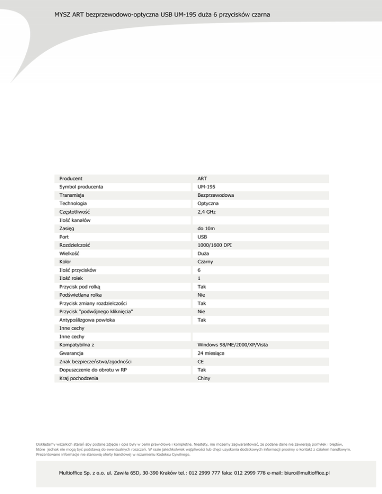 MYSZ ART bezprzewodowo-optyczna USB UM-195 duża 6 przycisków czarna Producent ART Symbol producenta UM-195 Transmisja Bezprzewodowa Technologia Optyczna Częstotliwość 2,4 GHz Ilość kanałów Zasięg do 10m Port USB Rozdzielczość 1000/1600 DPI Wielkość Duża Kolor Czarny Ilość przycisków 6 Ilość rolek 1 Przycisk pod rolką Tak Podświetlana rolka Nie Przycisk zmiany rozdzielczości Tak Przycisk "podwójnego kliknięcia" Nie Antypoślizgowa powłoka Tak Inne cechy Inne cechy Kompatybilna z Windows 98/ME/2000/XP/Vista Gwarancja 24 miesiące Znak bezpieczeństwa/zgodności CE Dopuszczenie do obrotu w RP Tak Kraj pochodzenia Chiny Dokładamy wszelkich starań aby podane zdjęcie i opis były w pełni prawidłowe i kompletne. Niestety, nie możemy zagwarantować, że podane dane nie zawierają pomyłek i błędów, które jednak nie mogą być podstawą do ewentualnych roszczeń. W razie jakichkolwiek wątpliwości lub chęci uzyskania dodatkowych informacji prosimy o kontakt z działem handlowym. Prezentowane informacje nie stanowią oferty handlowej w rozumieniu Kodeksu Cywilnego. Multioffice Sp. z o.o. ul. Zawiła 65D, 30-390 Kraków tel.: 012 2999 777 faks: 012 2999 778 e-mail: [email protected]