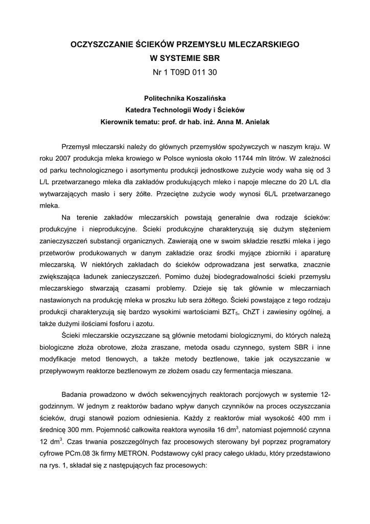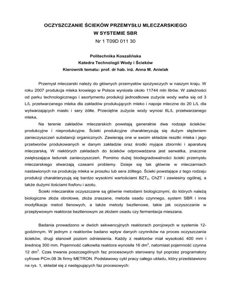 Oczyszczanie ścieków przemysłu mleczarskiego w systemie SBR