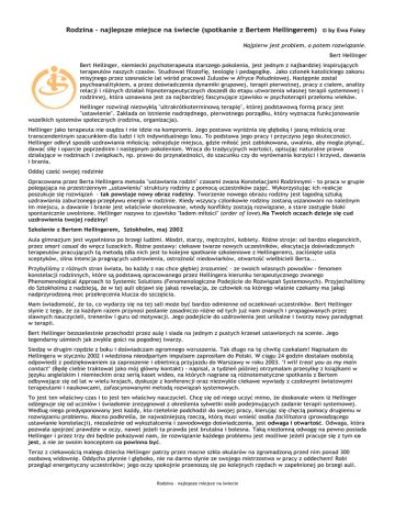 Rodzina – najlepsze miejsce na świecie (spotkanie z Bertem Hellingerem) © by Ewa Foley Najpierw jest problem, a potem rozwiązanie. Bert Hellinger Bert Hellinger, niemiecki psychoterapeuta starszego pokolenia, jest jednym z najbardziej inspirujących terapeutów naszych czasów. Studiował filozofię, teologię i pedagogikę. Jako członek katolickiego zakonu misyjnego przez szesnaście lat wśród pracował Zulusów w Afryce Południowej. Następnie został psychoanalitykiem, a przez doświadczenia dynamiki grupowej, terapii pierwotnej, pracy z ciałem, analizy relacji i różnych działań hipnoterapeutycznych doszedł do etapu utworzenia własnej terapii systemowej i rodzinnej, która uznawana jest za najbardziej fascynujące zjawisko w psychoterapii przełomu wieków. Hellinger rozwinął niezwykłą "ultrakrótkoterminową terapię", której podstawową formą pracy jest "ustawienie". Zakłada on istnienie nadrzędnego, pierwotnego porządku, który wyznacza funkcjonowanie wszelkich systemów społecznych (rodzina, organizacja). Hellinger jako terapeuta nie osądza i nie idzie na kompromis. Jego postawa wyróżnia się głęboką i jasną miłością oraz transcendentnym szacunkiem dla ludzi i ich indywidualnego losu. To podstawa jego pracy i przyczyna jego skuteczności. Hellinger odkrył sposób uzdrawiania miłością: odnajduje miejsca, gdzie miłość jest zablokowana, uwalnia, aby mogła płynąć, dawać siłę i oparcie poprzednim i następnym pokoleniom. Wraca do tradycyjnych wartości, opisując naturalne prawa działające w rodzinach i związkach, np. prawo do przynależności, do szacunku czy do wyrównania korzyści i krzywd, dawania i brania. Oddaj cześć swojej rodzinie Opracowana przez Berta Hellingera metoda "ustawiania rodzin" czasami zwana Konstelacjami Rodzinnymi - to praca w grupie polegająca na przestrzennym „ustawieniu" struktury rodziny z pomocą uczestników zajęć. Wykorzystując ich reakcje poszukuje się rozwiązań - tak powstaje nowy obraz rodziny. Tworzenie nowego obrazu rodziny jest łagodną sztuką uzdrawiania zaburzonego przepływu energii w rodzinie. Kiedy wszyscy członkowie rodziny zostaną uszanowani na należnym im miejscu, a dawanie i branie jest właściwie skorelowane, wtedy konflikty zostają rozwiązane, a stare zastygłe bloki spontanicznie uwolnione. Hellinger nazywa to zjawisko "ładem miłości" (order of love).Na Twoich oczach dzieje się cud uzdrowienia twojej rodziny! Szkolenie z Bertem Hellingerem, Sztokholm, maj 2002 Aula gimnazjum jest wypełniona po brzegi ludźmi. Młodzi, starzy, mężczyźni, kobiety. Różne stroje: od bardzo eleganckich, przez smart casual do wręcz luzackich. Różne postawy: ciekawe twarze nowych uczestników, ekscytacja doświadczonych terapeutów pracujących tą metodą (dla nich jest to kolejne spotkanie szkoleniowe z Hellingerem), zaciśnięte usta sceptyków, silna intencja pragnących uzdrowienia, ostrożność niedowiarków, otwartość wielbicieli Berta... Przybyliśmy z różnych stron świata, bo każdy z nas chce głębiej zrozumieć - ze swoich własnych powodów - fenomen konstelacji rodzinnych, które są podstawą opracowanego przez Hellingera kierunku terapeutycznego zwanego Phenomenological Approach to Systemic Solutions (Fenomenologiczne Podejście do Rozwiązań Systemowych). Przyjechaliśmy do Sztokholmu z nadzieją, że w tej auli objawi się jakaś rewelacja, że człowiek na którego właśnie czekamy ma jakąś nadprzyrodzoną moc przekręcenia klucza do szczęścia. Mam świadomość, że to, co wydarzy się na tej sali może być bardzo odmienne od oczekiwań uczestników. Bert Hellinger słynie z tego, że za każdym razem przynosi posłanie zasadniczo różne od tych już nam znanych i propagowanych przez sławnych nauczycieli, trenerów i guru od motywacji. Jego podejście do uzdrowienia jest unikalne i tworzy nowy paradygmat w terapii. Bert Hellinger bezszelestnie przechodzi przez aulę i siada na jednym z pustych krzeseł ustawionych na scenie. Jego legendarny uśmiech jak zwykle gości na pogodnej twarzy. Siedzę w drugim rzędzie z boku i doświadczam ogromnego wzruszenia. Tak długo na tę chwilę czekałam! Napisałam do Hellingera w styczniu 2002 i wiedziona nieodpartym impulsem zaprosiłam do Polski. W ciągu 24 godzin dostałam osobistą odpowiedź z podziękowaniem za zaproszenie i obietnicą przyjazdu do Warszawy w roku 2003. "I will treat you as my main contact" (Będę ciebie traktował jako mój główny kontakt) - napisał, a tydzień później otrzymałam przesyłkę z książkami w języku angielskim i niemieckim oraz serią kaset wideo, na których nagrane są różnotematyczne spotkania z Bertem odbywające się od lat w wielu krajach, dyskusje z konferencji oraz niezwykle ciekawe wywiady z czołowymi światowymi terapeutami i naukowcami, zafascynowanymi metodą rozwiązań systemowych. To jest ten właściwy czas i to jest ten właściwy nauczyciel. Chcę się od niego uczyć mimo, że doskonale wiem iż Hellinger odżegnuje się od uczniów i świadomie zrezygnował z określenia sylwetki osób podejmujących zadanie terapii systemowej. Według niego predysponowany jest każdy, kto rzetelnie podchodzi do swojej pracy, kierując się chęcią pomocy drugiemu w rozwiązaniu problemu. Mocno podkreśla, że najważniejszą rzeczą, którą musi wnieść osoba facilitatora (prowadzącego ustawianie konstelacji), niezależnie od wykształcenia i zawodowego doświadczenia, jest odwaga i otwartość. Odwaga, która pozwala spojrzeć prawdzie w oczy, nawet jeżeli ta prawda jest brutalna i bolesna. Taką niezłomną odwagę na pewno posiada Hellinger i przez trzy dni będzie pokazywał nam, że rozwiązanie każdego problemu jest możliwe jeżeli pracuje się z tym co jest, a nie ze swoim konceptem co powinno być. Teraz z ciekawością małego dziecka Hellinger patrzy przez mocne szkła okularów na zgromadzoną przed nim ponad 300 osobową widownię. 