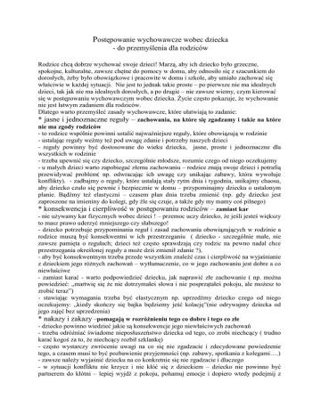 Postępowanie wychowawcze wobec dziecka - do przemyślenia dla rodziców Rodzice chcą dobrze wychować swoje dzieci! Marzą, aby ich dziecko było grzeczne, spokojne, kulturalne, zawsze chętne do pomocy w domu, aby odnosiło się z szacunkiem do dorosłych, żeby było obowiązkowe i pracowite w domu i szkole, aby umiało zachować się właściwie w każdej sytuacji. Nie jest to jednak takie proste – po pierwsze nie ma idealnych dzieci, tak jak nie ma idealnych dorosłych, a po drugie – nie zawsze wiemy, czym kierować się w postępowaniu wychowawczym wobec dziecka. Życie często pokazuje, że wychowanie nie jest łatwym zadaniem dla rodziców. Dlatego warto przemyśleć zasady wychowawcze, które ułatwiają to zadanie: * jasne i jednoznaczne reguły – zachowania, na które się zgadzamy i takie na które nie ma zgody rodziców - to rodzice wspólnie powinni ustalić najważniejsze reguły, które obowiązują w rodzinie - ustalając reguły weźmy też pod uwagę zdanie i potrzeby naszych dzieci - reguły powinny być dostosowane do wieku dziecka, jasne, proste i jednoznaczne dla wszystkich w rodzinie - trzeba upewnić się czy dziecko, szczególnie młodsze, rozumie czego od niego oczekujemy - u małych dzieci warto zapobiegać złemu zachowaniu – rodzice znają swoje dzieci i potrafią przewidywać problem( np. odwracając ich uwagę czy unikając zabawy, która wywołuje konflikty). - zadbajmy o reguły, które ustalają stały rytm dnia i tygodnia, unikajmy chaosu, aby dziecko czuło się pewnie i bezpiecznie w domu – przypominajmy dziecku o ustalonym planie. Bądźmy też elastyczni – czasem plan dnia trzeba zmienić (np. gdy dziecko jest zaproszone na imieniny do kolegi, gdy źle się czuje, a także gdy my mamy coś pilnego) * konsekwencja i cierpliwość w postępowaniu rodziców – zamiast kar - nie używamy kar fizycznych wobec dzieci ! – przemoc uczy dziecko, że jeśli jesteś większy to masz prawo uderzyć mniejszego czy słabszego! - dziecko potrzebuje przypominania reguł i zasad zachowania obowiązujących w rodzinie a rodzice muszą być konsekwentni w ich przestrzeganiu ( dziecko - szczególnie małe, nie zawsze pamięta o regułach; dzieci też często sprawdzają czy rodzic na pewno nadal chce przestrzegania określonej reguły a może dziś zmienił zdanie ?), - aby być konsekwentnym trzeba przede wszystkim znaleźć czas i cierpliwość na wyjaśnianie z dzieckiem jego różnych zachowań – wytłumaczenie, co w jego zachowaniu jest dobre a co niewłaściwe - zamiast karać - warto podpowiedzieć dziecku, jak naprawić złe zachowanie ( np. można powiedzieć: „martwię się że nie dotrzymałeś słowa i nie posprzątałeś pokoju, ale możesz to zrobić teraz”) - stawiając wymagania trzeba być elastycznym np. uprzedźmy dziecko czego od niego oczekujemy: „kiedy skończy się bajka będziemy jeść kolację”(nie odrywajmy dziecka od jego zajęć bez uprzedzenia) * nakazy i zakazy –pomagają w rozróżnieniu tego co dobre i tego co złe - dziecko powinno wiedzieć jakie są konsekwencje jego niewłaściwych zachowań - trzeba odróżniać świadome nieposłuszeństwo dziecka od tego, co zrobi niechcący ( trudno karać kogoś za to, że niechcący rozbił szklankę) - często wystarczy zwrócenie uwagi na co się nie zgadzacie i zdecydowane powiedzenie tego, a czasem musi to być pozbawienie przyjemności (np. zabawy, spotkania z kolegami….) - zawsze należy wyjaśnić dziecku na co konkretnie się nie zgadzacie i dlaczego - w sytuacji konfliktu nie krzycz i nie kłóć się z dzieckiem – dziecko nie powinno być partnerem do kłótni – lepiej wyjdź z pokoju, pohamuj emocje i dopiero wtedy podejmij z dzieckiem rozmowę ( ludzie w emocjach często się ranią, nie panują nad słowami, a tego nie chcemy – bo chcemy wychowywać dziecko a nie ranić go) * słowność i szacunek - jeśli oczekujemy od dziecka słowności to sami też musimy dotrzymywać obietnic składanych dziecku - chcemy nauczyć dzieci szacunku do nas, więc okazujmy szacunek dziecku – doceniajmy jego staranie, dotrzymujmy danego mu słowa, nie straszmy i nie stosujmy kar fizycznych - dziecko dopiero uczy się tego co dobre i złe - może popełniać błędy – a najszybciej uczy się naśladując zachowanie dorosłych – więc uważaj co mówisz i robisz, bo twoje dziecko obserwuje cię i powtarza twoje zachowanie - np. jeśli nie chcemy, aby dzieci używały wulgarnych słów, to sami też nie możemy ich używać * zainteresowanie sprawami dziecka i akceptacja - ważne jest aby rodzice mieli czas dla swoich dzieci – czas na wspólne spędzanie czasu, na rozmowę, na poznawanie marzeń i mocnych stron swoich dzieci, na poznanie jego kolegów - rozmowa z dzieckiem nic nas nie kosztuje, nie wymaga nakładów pieniężnych, kupowania prezentów – a daje dziecku poczucie, że jest dla nas ważne, że rodzice interesują się nim - okazując swojemu dziecku, że się interesujesz jego kłopotami i radościami, pomagając gdy ma problemy dajesz mu poczucie bezpieczeństwa i oparcie w domu -to będzie procentować, gdy będzie dorastał – łatwiej mu będzie zwrócić się do rodziców z problemami a nie szukać oparcia w grupie rówieśniczej, która nie zawsze dobrze oddziałuje na nastolatka * rozwijanie obowiązkowości i odpowiedzialności za swoje postępowanie - jeśli w domu rodzina dzieli się obowiązkami wzmacnia to dobre więzi rodzinne – buduje zaufanie do siebie wzajemnie ( wszyscy w rodzinie wiedzą na co u kogo mogą liczyć) - powierzanie dziecku obowiązków powinno być oczywiście na miarę jego wieku i umiejętności (już małe dziecko można już włączać do prostych czynności domowych, pomocy w porządkach, wspólnego układania zabawek itp.-dziecko chętnie pomaga, jeśli jest za to chwalone) -angażowanie dziecka do wykonania zadań, z którymi sobie radzi umożliwia dziecku przeżycie sukcesu, (w trudniejszych ważne 