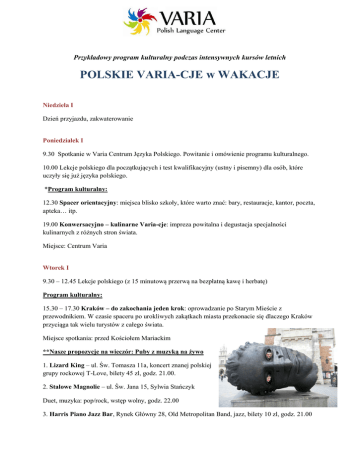 Przykładowy program kulturalny podczas intensywnych kursów letnich POLSKIE VARIA-CJE w WAKACJE Niedziela I Dzień przyjazdu, zakwaterowanie Poniedziałek I 9.30 Spotkanie w Varia Centrum Języka Polskiego. Powitanie i omówienie programu kulturalnego. 10.00 Lekcje polskiego dla początkujących i test kwalifikacyjny (ustny i pisemny) dla osób, które uczyły się już języka polskiego. *Program kulturalny: 12.30 Spacer orientacyjny: miejsca blisko szkoły, które warto znać: bary, restauracje, kantor, poczta, apteka… itp. 19.00 Konwersacyjno – kulinarne Varia-cje: impreza powitalna i degustacja specjalności kulinarnych z różnych stron świata. Miejsce: Centrum Varia Wtorek I 9.30 – 12.45 Lekcje polskiego (z 15 minutową przerwą na bezpłatną kawę i herbatę) Program kulturalny: 15.30 – 17.30 Kraków – do zakochania jeden krok: oprowadzanie po Starym Mieście z przewodnikiem. W czasie spaceru po urokliwych zakątkach miasta przekonacie się dlaczego Kraków przyciąga tak wielu turystów z całego świata. Miejsce spotkania: przed Kościołem Mariackim **Nasze propozycje na wieczór: Puby z muzyką na żywo 1. Lizard King – ul. Św. Tomasza 11a, koncert znanej polskiej grupy rockowej T-Love, bilety 45 zl, godz. 21.00. 2. Stalowe Magnolie – ul. Św. Jana 15, Sylwia Stańczyk Duet, muzyka: pop/rock, wstęp wolny, godz. 22.00 3. Harris Piano Jazz Bar, Rynek Główny 28, Old Metropolitan Band, jazz, bilety 10 zl, godz. 21.00 Środa I 9.30 – 12.45 Lekcje polskiego Nasze propozycje: Zwiedzanie „zielonego” Krakowa na rowerze Skałki Twardowskiego - skały i jezioro blisko centrum Krakowa Kopiec Kościuszki - z piękną panoramą Krakowa Las Wolski - "zielone płuca Krakowa”; atrakcje - klasztor kamedułów na Srebrnej Górze oraz ogród zoologiczny wycieczka do Tyńca - trasa wzdłuż wałów Wisły; początek: Wawel lub Most Dębnicki, koniec: opactwo benedyktynów w Tyńcu Wypożyczalnie rowerów: ul. Św. Anny 4, ul. Józefa 5, cena za wypożyczenie: 9 zł za godzinę. Czwartek I 9.30 – 12.45 Lekcje polskiego Program kulturalny: 13.00 – 14.00 „Chłopaki nie płaczą” – warsztaty karaoke: wspólna nauka piosenki i trening przed wieczornym karaoke. 21.00 „Hej sokoły!” - wieczór karaoke: śpiewanie piosenek po polsku, niemiecku, angielsku, rosyjsku... Wspaniała zabawa w naszym ulubionym „variowym” pubie: Movida Cocktail Bar, ul. Mikołajska 9 Nasze propozycje muzealne: 1. Podziemia Rynku – ponad 4 metry pod powierzchnią rynku można zobaczyć niespotykany w Europie przekrój wielkiego, tętniącego życiem średniowiecznego Krakowa, bilety 19 zł 2. MOCAK - muzeum sztuki współczesnej, ul. Lipowa 4, bilety 10 zł Piątek I 9.30 – 12.45 Lekcje polskiego 13.00 – 14.00 „Chrząszcz brzmi w trzcinie” – warsztaty językowe: praktyczne ćwiczenia z zakresu polskiej wymowy. Nasze propozycje taneczne: 1. Klub Społem - klub w klimacie PRL, muzyka: polska muzyka lat 70', 80', rock'n'roll, rock, punk, old school disco, reggae, ul. Św. Tomasza 4 2. Gorączka – tłumnie odwiedzany, popularny studencki klub, dominuje rock, ul. Szewska 7 3. Cień – muzyka klubowa ul. Św. Jana 15 WEEKEND – SOBOTA, NIEDZIELA: Czas do własnej dyspozycji. Nasze propozycje: 1.Wycieczki za miasto: Wieliczka (zabytkowa kopalnia soli), Zakopane (wędrówka po tatrzańskich górach), Ojców (kraina 1000 jaskiń), Auschwitz (Oświęcim) - obóz koncentracyjny 2. Kraków: Zwiedzanie Nowej Huty, historycznej, socrealistycznej części miasta Wypoczynek na Krakow Beach Club plaża, basen, koncerty Bulwar Wołyński nad Wisłą, niedaleko Zamku Wawelskiego Koncert symfoniczny w Filharmonii Krakowskiej, ul. Zwierzynecka 1 Krakowski Szlak Streetart’u – spacer po Krakowie pokazujący najciekawsze murale miasta Pchli targ na Placu Nowym (Kazimierz) Kryspinów, kąpielisko i plaża Poniedziałek II 9.30 – 12.45 Lekcje polskiego Program kulturalny: 13.45 Zwiedzanie fabryki Schindlera - stała wystawa Kraków pod nazistowską okupacją 1939 – 1945. Wystawa jest opowieścią o Krakowie oraz losach jego żydowskich i polskich mieszkańców w czasie II wojny światowej. Wtorek II 9.30 – 12.45 Lekcje polskiego Program kulturalny: 13.00 – 14.45 „Gdzie kucharek sześć…“ - warsztaty kulinarne z kuchni polskiej: wspólne lepienie i degustacja pierogów Nasze propozycje: wieczór na Kazimierzu Kolacja: Kolanko No 6 – pyszne naleśniki z oryginalnym nadzieniem, ul. Józefa 17 Deser: lody w małej lodziarni na ul. Starowiślnej 83 (najlepsze lody w Krakowie :) ) Zakupy: Idea Fix– ubrania i gadżety od młodych polskich projektantów, ul. Miodowa 23 Kultura: 18.00 koncert muzyki klezmerskiej w Synagodze Izaaka, ul. Kupa 18, wstęp wolny. Środa II 9.30 – 12.45 Lekcje polskiego Nasze propozycje: Powtórka przed testem, a wieczorem polski film z angielskimi napisami: 21.00 „Tylko mnie kochaj“, komedia romantyczna, kino Pod Baranami, Rynek Główny 27, bilety: 15 Czwartek II 9.30 – 12.45 Lekcje polskiego, test końcowy 13.00 – 14.00 „Masakra nie czaję” – warsztaty slangu: praktyczne zajęcia poświęcone mowie potocznej. Program kulturalny: 17.00 „Entliczek Pentliczek” – gry i zabawy z językiem polskim. Dla najlepszych atrakcyjne nagrody! 20.00 Wieczorna spotkanie „na żywca” Spotkanie integracyjne w pubie. Klub Kulturalny, Szewska 25 Piątek II 9.30 – 12.45 Lekcje polskiego 14.30 Impreza pożegnalna, rozdanie certyfikatów Sobota II Dzień odjazdu * Przykładowy program dla kursu intensywnego. Niektóre punkty mogą ulec zmianie. ** Nasze propozycje na wolne wieczory – koncerty, festiwale, wystawy.