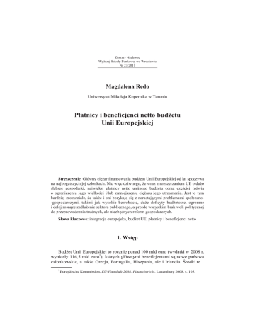 Zeszyty Naukowe Wy szej Szkoły Bankowej we Wrocławiu Nr 23/2011 Magdalena Redo Uniwersytet Mikołaja Kopernika w Toruniu Płatnicy i beneficjenci netto bud etu Unii Europejskiej Streszczenie. Główny ci ar finansowania bud etu Unii Europejskiej od lat spoczywa na najbogatszych jej członkach. Nic wi c dziwnego, e wraz z rozszerzaniem UE o du o słabsze gospodarki, najwi ksi płatnicy netto unijnego bud etu coraz cz ciej mówi o ograniczeniu jego wielko ci i/lub zmniejszeniu ci aru jego utrzymania. Jest to tym bardziej zrozumiałe, e tak e i oni borykaj si z narastaj cymi problemami społeczno-gospodarczymi, takimi jak wysokie bezrobocie, du e deficyty bud etowe, ogromne i dalej rosn ce zadłu enie sektora publicznego, a przede wszystkim brak woli politycznej do przeprowadzenia trudnych, ale niezb dnych reform gospodarczych. Słowa kluczowe: integracja europejska, bud et UE, płatnicy i beneficjenci netto 1. Wst p Bud et Unii Europejskiej to rocznie ponad 100 mld euro (wydatki w 2008 r. wyniosły 116,5 mld euro1), których głównymi beneficjentami s nowe pa stwa członkowskie, a tak e Grecja, Portugalia, Hiszpania, ale i Irlandia. rodki te 1 Europäische Kommission, EU-Haushalt 2008. Finanzbericht, Luxemburg 2008, s. 105. 50 Magdalena Redo Rys. 1. Wielko bud etu UE (do 1993 r. EWG) w latach 1958-2008 r ó d ł o: opracowanie własne na podstawie Europäische Kommission, EU-Haushalt 2008. Finanzbericht, Luxemburg 2008, s. 83 oraz Europäische Kommission, EU-Haushalt 2006. Finanzbericht, Luxemburg 2006, s. 38-42. stanowi około 1% PKB całej UE. I cho w porównaniu z krajowymi bud etami to relatywnie niedu e pieni dze – bowiem rednio w pa stwach UE przez sektor finansów publicznych przechodzi prawie 45% ich PKB2 – to dla słabszych gospodarek rodki te stanowi niezwykle wa ne ródło wsparcia, istotnie poprawiaj ce ich mo liwo ci rozwojowe. 2 Eurostat, Total general government revenue. General government. 2008 (% of GDP), March 2010. Płatnicy i beneficjenci netto bud etu Unii Europejskiej 51 Bud et UE ma w du ej mierze charakter redystrybucyjny – obok polityki rolnej głównym obszarem wsparcia jest poprawa konkurencyjno ci słabiej rozwini tych regionów – dlatego nie dziwi fakt, e bardziej zamo ne kraje, zwłaszcza najwi ksi płatnicy netto unijnego bud etu, od lat próbuj przeforsowa ograniczenie jego wielko ci i/lub złagodzenie ci aru jego utrzymania. Jest to tym bardziej zrozumiałe, gdy prze ledzi si dynamik rozrostu bud etu UE – por. rysunek 1. Jeszcze w latach siedemdziesi tych XX w. bud et EWG stanowił około 0,5% dochodu narodowego brutto (DNB) krajów członkowskich, jednak lata osiemdziesi te i dziewi dziesi te XX w. przyniosły rozrost do ponad 1% DNB – por. rysunek 1. Ci ar jego utrzymania jest wi c dzi dwukrotnie wi kszy ni wówczas, co oznacza, e po kilkudziesi ciu latach finansowania w coraz wi kszym stopniu działa wspólnotowych, niektóre kraje maj ju tego po prostu do . Dotyczy to zwłaszcza tych, którzy do unijnego bud etu wpłacaj wi cej pieni dzy ni z niego otrzymuj , czyli tzw. płatników netto. Celem niniejszego artykułu jest analiza stopnia obci enia poszczególnych krajów członkowskich daninami na rzecz bud etu Unii Europejskiej – zarówno obecnie, jak i na przestrzeni minionych dekad, a tak e przybli enie preferencyjnych rozwi za w zakresie finansowania bud etu UE, jakie dotychczas udało si wynegocjowa niektórym płatnikom netto. 2. Beneficjenci i płatnicy netto bud etu Unii Europejskiej w 2008 r. Do najwi kszych płatników netto unijnego bud etu nale obecnie w kolejno ci Holandia, Szwecja i Niemcy – por. rysunek 2. Wpłacaj oni do bud etu UE o kilka, a Niemcy nawet kilkana cie miliardów euro wi cej ni otrzymuj z niego wsparcia. To ujemne saldo rozlicze z unijnym bud etem stanowi w ich przypadku najwi kszy procent ich PKB – odpowiednio 0,74% PKB Holandii, 0,54% PKB Szwecji i 0,44% PKB Niemiec. Płatnikami netto jest obecnie w sumie a 10 pa stw spo ród 27. Poza wymienionymi najwi kszymi płatnikami netto, ujemny bilans z bud etem UE maj te Dania, Włochy, Francja, Finlandia, Wielka Brytania i Austria, a tak e jeden z nowych członków UE – Cypr. W ich przypadku ujemne saldo rozlicze stanowi jednak mniejsz cz ich PKB – od 0,15% do 0,32% ich PKB (por. rys. 2). Tak naprawd płatnikiem netto – i to jednym z najwi kszych – jest te Belgia. Gros bowiem płatno ci kierowanych do Belgii to rodki na utrzymanie unijnych instytucji, których jest tam najwi cej. Wył czaj c rodki na unijn administracj , ujemne saldo rozlicze z bud etem UE stanowi a 0,70% jej PKB, a wi c tylko minimalnie mniej ni najwi kszego unijnego płatnika netto – Holandii. Ta sama 52 Magdalena Redo Rys. 2. Beneficjenci i płatnicy netto unijnego bud etu* w 2008 r. * saldo rozlicze z bud etem UE przy uwzgl dnieniu wszystkich płatno ci danego kraju na rzecz bud etu UE oraz ł cznego wsparcia z bud etu UE r ó d ł o: opracowanie własne na podstawie Europäische Kommission, EU-Haushalt 2008…, s. 105 oraz Eurostat, Gross domestic product at market prices. Millions of euro. 2008, March 2010. sytuacja dotyczy Luksemburga, który po wyeliminowaniu płatno ci administracyjnych przestaje by najwi kszym beneficjentem netto bud etu UE, a staje si wprawdzie najmniejszym, ale płatnikiem netto. Ujemny bilans rozrachunków z unijnym bud etem stanowił w 2008 r. 0,06% PKB Luksemburga. Najwi kszymi beneficjentami netto unijnego bud etu jest Grecja i Litwa – ich dodatni bilans rozlicze z bud etem UE stanowił w 2008 r. odpowiednio 2,59% i 2,50% ich PKB. Niewiele gorsze saldo wykazuje Bułgaria, Łotwa i Portugalia (ponad 1,5% PKB), a tak e Estonia, Polska, Rumunia, W gry i Słowacja (ponad 1% PKB). Beneficjentami netto s te Czechy, Malta, Irlandia, Hiszpania i Słowenia. Wliczaj c Belgi i Luksemburg – w ród obecnych 27 członków UE tak naprawd 12 krajów jest płatnikami netto, a 15 pa stw beneficjentami netto unijnego bud etu. 3. Finansowanie bud etu Unii Europejsk