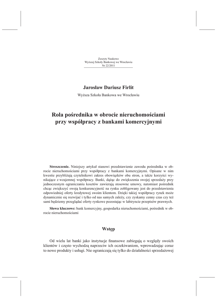 51 Zeszyty Naukowe Wyższej Szkoły Bankowej we Wrocławiu Nr 22/2011 Jarosław Dariusz Firlit Wyższa Szkoła Bankowa we Wrocławiu Rola pośrednika w obrocie nieruchomościami przy współpracy z bankami komercyjnymi Streszczenie. Niniejszy artykuł stanowi przedstawienie zawodu pośrednika w obrocie nieruchomościami przy współpracy z bankami komercyjnymi. Opisane w nim kwestie przybliżają czytelnikowi zakres obowiązków obu stron, a także korzyści wynikające z wzajemnej współpracy. Banki, dążąc do zwiększenia swojej sprzedaży przy jednoczesnym ograniczaniu kosztów zawierają stosowne umowy, natomiast pośrednik chcąc zwiększyć swoją konkurencyjność na rynku zobligowany jest do przedstawienia odpowiedniej oferty kredytowej swoim klientom. Dzięki takiej współpracy rynek może dynamicznie się rozwijać i tylko od nas samych zależy, czy zyskamy cenny czas czy też sami będziemy przeglądać oferty rynkowe pozostając w labiryncie przepisów prawnych. Słowa kluczowe: bank komercyjny, gospodarka nieruchomościami, pośrednik w obrocie nieruchomościami Wstęp Od wielu lat banki jako instytucje finansowe zabiegają o względy swoich klientów i często wychodzą naprzeciw ich oczekiwaniom, wprowadzając coraz to nowe produkty i usługi. Nie ograniczają się tylko do działalności sprzedażowej 52 Jarosław Dariusz Firlit w swoich wyspecjalizowanych placówkach, ale także coraz częściej podejmują współpracę z innymi instytucjami zajmującymi się pośrednictwem. Taki podział ról daje większą możliwość dotarcia do docelowego klienta, jednocześnie ograniczając ponoszenie dodatkowych kosztów. Celem niniejszego artykułu jest wyjaśnienie zasad współpracy pośrednika w obrocie nieruchomościami z bankami komercyjnymi na rynku nieruchomości. Ze względu na charakter artykułu główną metodą badawczą będzie analiza literatury przedmiotu oraz aktualnego porządku prawnego, mająca na celu usystematyzowanie najistotniejszych zagadnień dotyczących związków pośrednika z bankami komercyjnymi na rynku nieruchomości. 1. Pośrednik na rynku nieruchomości W naszym kraju zawód pośrednika w obrocie nieruchomości nie był sformalizowany aż do wprowadzenia ustawy o gospodarce nieruchomościami, którą sejm uchwalił dnia 21 sierpnia 1997 r.1 Zostały w niej opisane prawne podstawy licencjonowania usług pośrednictwa w obrocie nieruchomościami, które miały obowiązywać od 1 stycznia 1998 r. Długi brak przepisów wykonawczych i liczne zmiany tej ustawy sprawiły, że dopiero od 1 stycznia 2002 r. licencje dla pośredników w obrocie nieruchomościami są obligatoryjne i potwierdzone certyfikatem przez właściwe ministerstwo. Można by się zastanowić nad pytaniem, które samo na myśl przychodzi: Czy do tego czasu nie istniał zawód pośrednika? Istniał, nie był jedynie sprecyzowany odpowiednimi przepisami ustawowymi i wykonawczymi klasyfikującymi ten rodzaj czynności zawodowej. Liczne naruszenia przepisów prawa i ryzyko związane choćby z wyłudzeniami doprowadziły do prawnego sformalizowania zawodu pośrednika w trosce o bezpieczeństwo klientów, którzy nie zawsze znają się na przepisach obowiązujących w obrocie nieruchomościami na ryku zarówno pierwotnym, jak i wtórnym. Do czasu wprowadzenia wymogów licencji zawód pośrednika był normalnie wykonywany przez wiele firm, zajmujących się nie tylko nieruchomościami, ale także pośrednictwem finansowym czy ubezpieczeniowym jako połączenie oferty dla klienta. W tym czasie liczne wyłudzenia kredytów mieszkaniowych, jak i oszustwa przy sprzedaży nieruchomości były dość liczne, co wzbudziło nieufność do osób i firm wykonujących ten rodzaj działalności zawodowej. 1 Ustawa z dnia 21 sierpnia 1997 r. o gospodarce nieruchomościami, Dz.U. nr 115, poz. 741. Rola pośrednika w obrocie nieruchomościami przy współpracy z bankami komercyjnymi 53 Ustawa o gospodarce nieruchomościami definiuje czynności pośrednictwa w obrocie nieruchomościami jako działania podejmowane przez osoby posiadające licencję zawodową w obrocie nieruchomościami, które gwarantują skuteczność działania zgodnie ze zleceniem zamawiającego tę czynność, mającą na celu zawarcie właściwej umowy przeniesienia prawa własności bądź prawa do korzystania z określonej nieruchomości (umowa najmu, wynajmu). Poza powszechnie przyjętą opinią, że pośrednik tylko sprzedaje nieruchomości, w skład umowy mogą wchodzić czynności zmierzające do kupna, zamiany, przeniesienia wieczystego prawa użytkowania, a także inne czynności związane z nieruchomościami. Ustawa nie określa szczegółowego sposobu wykonywania tych czynności. Zgodnie z ustawą, pośrednicy przy wykonywaniu wszelkich czynności pośrednictwa powinni zachować szczególną staranność, ostrożność, ich czynności muszą być ubezpieczone od odpowiedzialności cywilnej, a w szczególności działać zgodnie z interesem zamawiającego. Pośrednicy w obrocie nieruchomości mają obowiązek podnoszenia cały czas swoich kwalifikacji zawodowych, mogą także przynależeć do różnego typu organizacji zawodowych, zrzeszeń, gdzie uczestniczą w różnego typu sympozjach, warsztatach mających na celu właśnie podnoszenie swoich kwalifikacji zawodowych, jak i przede wszystkim wymianę doświadczeń zawodowych. Rozwój rynku nieruchomości w kraju możemy podzielić na cztery etapy, uwarunkowane zarówno przeobrażeniami w świecie polityki, jak i powstaniem nowych ustaw, a także przystąpieniem Polski do Unii Europejskiej. Wszystkie te zmiany wywarły pozytywny wpływ na rozwój rynku nieruchomości i na wzrost gospodarczy. Wraz z przeobrażeniami politycznymi i społeczno-ekonomicznymi, jakie dokonały się w Polsce u schyłku lat osiemdziesiątych ubiegłego stulecia, odrodził się rynek nieruchomości. Pierwsze lata jego funkcjonowania utrudniał brak regulacji prawnych, brak rozwiązań instytucjona