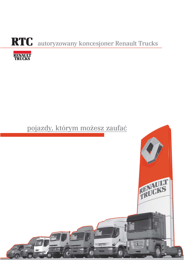 RTC autoryzowany koncesjoner Renault Trucks pojazdy, którym możesz zaufać Szanowni Państwo! Z przyjemnością zawiadamiamy, że rozpoczęliśmy sprzedaż samochodów ciężarowych Renault. Nasza misja to wspieranie działających na Mazowszu firm, które posiadają lub rozbudowują własne bazy transportowe. Naszym celem jest tworzenie trwałych więzi i budowanie długofalowej współpracy w oparciu o nasze umiejętności, doskonałą jakość oferowanych samochodów ciężarowych i wieloletnie doświadczenie RENAULT TRUCKS. Przedstawiamy Państwu naszą specjalną promocyjną ofertę zakupu samochodów z gamy Renault Trucks. Pragniemy zwrócić uwagę Państwa na ułatwienia i korzyści jakie związane są z zakupem samochodów ciężarowych w RTC. • • • • gwarancja producenta równa okresowi leasingu preferencyjny leasing ciągników siodłowych Magnum i Premium w ramach leasingu Renault Trucks Finance. możliwość przekazania w rozliczeniu dotychczas użytkowanych pojazdów. bezpłatne testowanie nowych pojazdów z gamy Renault Trucks. Pojazdy oferowane w naszej firmie • Furgony, podwozia do zabudowy DMC 2,8 - 3,5 t MASTER • Maksymalna długość zabudowy do 4,2 m • Silniki Common Rail od 80 KM do 136 KM • Furgony, podwozia do zabudowy DMC 3,5 t - 6,5 t MASCOTT • Maksymalna długość zabudowy do 6,2 m • Silniki Common Rail od 110 KM do 160 KM • Podwozia do zabudowy DMC 8,0 t - 18 t • Kabina dzienna , kabina z leżanką, kabina załogowa MIDLUM • Maksymalna długość zabudowy do 9 m • Silniki Common Rail od 150 KM do 270 KM • Ciągniki siodłowe i podwozia do zabudowy DMC 16 t - 26 t • Kabina dzienna, kabina z wysokim dachem z 2 leżankami PREMIUM • Maksymalna długość zabudowy do 10 m • Silniki Common Rail od 220 KM do 420 KM • Ciągniki siodłowe i podwozia do zabudowy DMC 16 t - 26 t • Wielofunkcyjna, superprzestrzenna kabina MAGNUM • Maksymalna długość zabudowy do 10 m • Silniki MACK od 400 KM do 480 KM • Wieloosiowe podwozia do zabudowy 4X2 , 4X4, 6X4, 6X6, 8X4, DMC do 40 t • Ciągniki siodłowo-balastowe KERAX • Silniki Common Rail od 270 KM do 420 KM • Przeznaczenie podwozi: wywrotki , betonomieszarki Ciagnik siodłowy Magnum • Silnik MACK 440 KM • Wysokość siodła 1100 mm • Przestrzenna kabina z 2 leżankami, LICZBA POJAZDÓW W PROMOCJI JEST OGRANICZONA klimatyzacją i niezależnym ogrzewaniem • Blokada mechanizmu różnicowego • Radio z CD gwarancja producenta równa okresowi leasingu • Kabina w kolorze czerwonym Leasing* Magnum 440.19, ciągnik 1100 Opłaty wstępne 0,00 Euro 6 rat 1.736,13 Euro 54 raty 1.159,73 Euro Wartość końcowa 3.740,79 Euro * dostępne warianty leasingowe 36/48/60 miesięcy. Ciągnik siodłowy Premium GV950 • Silnik Common Rail 420 KM • Wysokość siodła 950 mm LICZBA POJAZDÓW W PROMOCJI JEST OGRANICZONA • ogumienie 295/60 R 22,5 Michelin • Wysoka kabina z 2 leżankami, klimatyzacją i niezależnym ogrzewaniem • Blokada mechanizmu różnicowego • Spojler dolny z dodatkowymi reflektorami • Kabina w kolorze białym Leasing* Premium 420.18, ciągnik GV950 Opłaty wstępne 0,00 Euro 6 rat 1.644,18 Euro 54 raty 1.098,31 Euro Wartość końcowa 3.542,67 Euro Ciągnik siodłowy Premium GV1100 • Silnik Common Rail 420 KM • Wysokość siodła 1100 mm • Wysoka kabina z 2 leżankami, klimatyzacją i niezależnym ogrzewaniem • Blokada mechanizmu różnicowego • Spojler dolny z dodatkowymi reflektorami, w kolorze kabiny • Kabina w kolorze czerwonym Leasing* Premium 420.19, ciągnik 1100 Opłaty wstępne 0,00 Euro 6 rat 1.629,73 Euro 54 raty 1.088,66 Euro Wartość końcowa 3.511,54 Euro gwarancja producenta równa okresowi leasingu * dostępne warianty leasingowe 36/48/60 miesięcy. Ciągnik siodłowy z naczepą PREMIUM 420.19 1100 z naczepą Schmitz - Cargobull SPR 24/L E PREMIUM 420.18 GV950 z naczepą Schmitz - Cargobull SPR 24/L Mega MAGNUM 440.19 1100 z naczepą Schmitz - Cargobull SPR 24/L E LICZBA POJAZDÓW W PROMOCJI JEST OGRANICZONA Dostosuj leasing do swoich potrzeb Leasing* Premium 420.19 1100 z naczepą Schmitz – Cargobull SPR 24/L E Opłaty wstępne 0,00 Euro 6 rat 2.073,06 Euro 54 raty 1.531,99 Euro Wartość końcowa 4.876,15 Euro Premium 420.18 GV950 z naczepą Schmitz - Cargobull SPR 24/L Mega Opłaty wstępne 0,00 Euro 6 rat 2.149,74 Euro 54 raty 1.603,87 Euro Wartość końcowa 5.098,83 Euro Magnum 440.19 1100 z naczepą Schmitz – Cargobull SPR 24/L E Opłaty wstępne 0,00 Euro 6 rat 2.179,46 Euro 54 raty 1.603,06 Euro Wartość końcowa 5.105,40 Euro gwarancja producenta równa okresowi leasingu* Klient, ponad wszystko * dostępne warianty leasingowe 36/48/60 miesięcy. naczepy Schmitz - Cargobull obięte standardową gwarancją producenta. Niniejszy dokument nie stanowi oferty handlowej. Ofertę sporządzono na podstawie stopy procentowej EURIBOR 1M - 2,0640 RTC autoryzowany koncesjoner Renault Trucks RTC Sp z o.o. 05-551 Mroków k/ Warszawy Al. Krakowska 51 C Sprzedaż pojazdów: [email protected]; www.rtc.com.pl tel.: 0*22 737 76 76, 737 76 77; fax 0*22 737 76 70