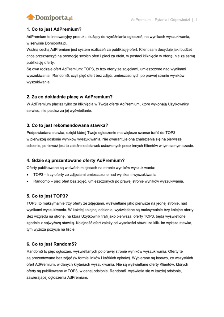 AdPremium – Pytania i Odpowiedzi | 1 1. Co to jest AdPremium? AdPremium to innowacyjny produkt, służący do wyróżniania ogłoszeń, na wynikach wyszukiwania, w serwisie Domiporta.pl. Ważną cechą AdPremium jest system rozliczeń za publikację ofert. Klient sam decyduje jaki budżet chce przeznaczyć na promocję swoich ofert i płaci za efekt, w postaci kliknięcia w ofertę, nie za samą publikację oferty. Są dwa rodzaje ofert AdPremium: TOP3, to trzy oferty ze zdjęciami, umieszczone nad wynikami wyszukiwania i Random5, czyli pięć ofert bez zdjęć, umieszczonych po prawej stronie wyników wyszukiwania. 2. Za co dokładnie płacę w AdPremium? W AdPremium płacisz tylko za kliknięcia w Twoją ofertę AdPremium, które wykonają Użytkownicy serwisu, nie płacisz za jej wyświetlanie. 3. Co to jest rekomendowana stawka? Podpowiadana stawka, dzięki której Twoje ogłoszenie ma większe szanse trafić do TOP3 w pierwszej odsłonie wyników wyszukiwania. Nie gwarantuje ona znalezienia się na pierwszej odsłonie, ponieważ jest to zależne od stawek ustawionych przez innych Klientów w tym samym czasie. 4. Gdzie są prezentowane oferty AdPremium? Oferty publikowane są w dwóch miejscach na stronie wyników wyszukiwania: TOP3 – trzy oferty ze zdjęciami umieszczone nad wynikami wyszukiwania. Random5 – pięć ofert bez zdjęć, umieszczonych po prawej stronie wyników wyszukiwania. 5. Co to jest TOP3? TOP3, to maksymalnie trzy oferty ze zdjęciami, wyświetlane jako pierwsze na jednej stronie, nad wynikami wyszukiwania. W każdej kolejnej odsłonie, wyświetlane są maksymalnie trzy kolejne oferty. Bez względu na stronę, na którą Użytkownik trafi jako pierwszą, oferty TOP3, będą wyświetlone zgodnie z najwyższą stawką. Kolejność ofert zależy od wysokości stawki za klik. Im wyższa stawka, tym wyższa pozycja na liście. 6. Co to jest Random5? Random5 to pięć ogłoszeń, wyświetlanych po prawej stronie wyników wyszukiwania. Oferty te są prezentowane bez zdjęć (w formie linków i krótkich opisów). Wybierane są losowo, ze wszystkich ofert AdPremium, w danych kryteriach wyszukiwania. Nie są wyświetlane oferty Klientów, których oferty są publikowane w TOP3, w danej odsłonie. Random5 wyświetla się w każdej odsłonie, zawierającej ogłoszenia AdPremium. AdPremium – Pytania i Odpowiedzi | 2 7. Czym różni się TOP3 od Random5? Rodzaj AdPremium TOP3 Random5 Miejsce na stronie Nad wynikami wyszukiwania. Jest to wyjątkowe miejsce – nie jest stałym elementem strony. W prawej kolumnie, obok wyników. Liczba ofert na odsłonę Maksymalnie 3. Maksymalnie 5. Wpływ Klienta na pozycję oferty na wyświetlanej liście Tak. Im wyższa stawka za klik, tym wyższa pozycja. Nie. Wyświetlane losowo. Zdjęcie Tak. Są to oferty ze zdjęciem. Nie. 8. Jeśli moja oferta wyświetla się w AdPremium, to czy pojawi się też na liście zwykłych wyników wyszukiwania? Tak. Oferta, która jest w AdPremium, wyświetla się również na zwykłej liście wyników wyszukiwania. 9. Czym różni się usługa AdPremium od Premium i SuperPremium? Oferta AdPremium Premium SuperPremium Kiedy płacę? Na koniec miesiąca. Przy wykupieniu usługi. Przy wykupieniu usługi. Gdzie są oferty? Nad wynikami wyszukiwania w danych kryteriach (nad Premium i nad Standard). Pod ofertami SuperPremium, ale nad ofertami Standard, w danych kryteriach. Na liście wyników wyszukiwania w danych kryteriach, nad ofertami Premium. Za co płacę? Za efekt, czyli za wykonane kliki i przejścia z wyników wyszukiwania TOP3 lub Random5 na szczegóły oferty. Za wyższą pozycję na wynikach wyszukiwania (stałą obecność w ofertach Premium, w danych kryteriach). Za wyższą pozycję na wynikach wyszukiwania (za stałą obecność w ofertach SuperPremium, w danych kryteriach). 10. Od czego zależy pozycja i efektywność mojej oferty AdPremium? Pozycja oferty w TOP3, zależy od tego jaką ustawisz stawkę za klik (CPC). Im wyższa stawka, tym oferta wyżej na liście. W Random5, pozycja ustalana jest losowo przy każdej odsłonie. System losowo wybiera oferty oznaczone jako AdPremium i spełniające dane kryteria wyszukiwania. Efektywność ofert zależna jest od ich widoczności (im wyżej na liście tym większa widoczność) oraz kompletności. AdPremium – Pytania i Odpowiedzi | 3 Kompletność oferty – Im więcej wypełnisz pól, im rzetelniej opiszesz ofertę, tym wyższa jej jakość i kompletność. Im wyższa kompletność, tym większe szanse na wzrost zainteresowania Twoją ofertą, wśród osób szukających nieruchomości w danych kryteriach. 11. Jakie są wyznaczniki kompletności oferty? Dobrze opisana oferta musi zawierać następujące elementy: Lokalizacja – Najlepiej wskazać nazwę ulicy (przy działkach powiat lub gminę), idealnie byłoby podać numer. Dodając ofertę koniecznie podaj województwo i miejscowość. Dobrze wskazana lokalizacja pomoże nam dokładnie zaznaczyć nieruchomości na mapie, a Użytkownicy lubią korzystać z tego udogodnienia. Lokalizacja powinna zostać zaznaczona na polach lokalizacyjnych w programie eksportu ofert lub w Panelu Klienta. Powierzchnia – Jedna z najważniejszych informacji, bez niej, oferta jest bezwartościowa dla Użytkownika. Cena – Kluczowa informacja, bez niej, oferta jest bezwartościowa dla Użytkownika. Zdjęcia – Im więcej tym lepiej, ale zdjęcia zawsze powinny być dobrej jakości i przedstawiać jak najdokładniej oferowaną nieruchomość. Pamiętaj też, że dla Użytkownika, zdjęcie w postaci reklamy agencji nieruchomości, czy dewelopera nie jest wartościowym zdjęciem, tym samym oferta z takimi fotografiami traci na jakości i wiarygodności. Dobrze jest za to pokazać plan nieruchomości. Liczba pokoi – Informacja ważna dla Użytkownika. Opis – Powinien zawierać jak najwięcej szczegółowych informacji. Im więcej, szczegółowo opisanych pól, tym oferta bardziej kompletna i wartościowa. 