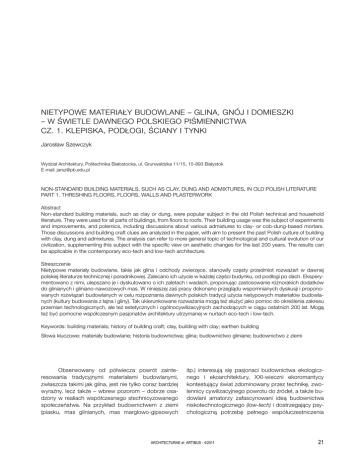 Nietypowe materiały budowlane – glina, gnój i domieszki – w świetle dawnego polskiego piśmiennictwa Cz. 1. Klepiska, podłogi, ściany i tynki Jarosław Szewczyk Wydział Architektury, Politechnika Białostocka, ul. Grunwaldzka 11/15, 15-893 Białystok E-mail: [email protected] NON-STANDARD BUILDING MATERIALS, SUCH AS CLAY, DUNG AND ADMIXTURES, IN OLD POLISH LITERATURE PART 1. THRESHING FLOORS, FLOORS, WALLS AND PLASTERWORK Abstract Non-standard building materials, such as clay or dung, were popular subject in the old Polish technical and household literature. They were used for all parts of buildings, from floors to roofs. Their building usage was the subject of experiments and improvements, and polemics, including discussions about various admixtures to clay- or cob-dung-based mortars. Those discussions and building craft clues are analyzed in the paper, with aim to present the past Polish culture of building with clay, dung and admixtures. The analysis can refer to more general topic of technological and cultural evolution of our civilization, supplementing this subject with the specific view on aesthetic changes for the last 200 years. The results can be applicable in the contemporary eco-tech and low-tech architecture. Streszczenie Nietypowe materiały budowlane, takie jak glina i odchody zwierzęce, stanowiły częsty przedmiot rozważań w dawnej polskiej literaturze technicznej i poradnikowej. Zalecano ich użycie w każdej części budynku, od podłogi po dach. Eksperymentowano z nimi, ulepszano je i dyskutowano o ich zaletach i wadach, proponując zastosowanie różnorakich dodatków do glinianych i gliniano-nawozowych mas. W niniejszej zaś pracy dokonano przeglądu wspomnianych dyskusji i proponowanych rozwiązań budowlanych w celu rozpoznania dawnych polskich tradycji użycia nietypowych materiałów budowlanych (kultury budowania z łajna i gliny). Tak ukierunkowane rozważania mogą też służyć jako pomoc do określenia zakresu przemian technologicznych, ale też estetycznych i ogólnocywilizacyjnych zachodzących w ciągu ostatnich 200 lat. Mogą też być pomocne współczesnym pasjonatów architektury utrzymanej w nurtach eco-tech i low-tech. Keywords: building materials; history of building craft; clay, building with clay; earthen building Słowa kluczowe: materiały budowlane; historia budownictwa; glina; budownictwo gliniane; budownictwo z ziemi Obserwowany od półwiecza powrót zainteresowania tradycyjnymi materiałami budowlanymi, zwłaszcza takimi jak glina, jest nie tylko coraz bardziej wyraźny, lecz także – wbrew pozorom – dobrze osadzony w realiach współczesnego stechnicyzowanego społeczeństwa. Na przykład budownictwem z ziemi (piasku, mas glinianych, mas marglowo-gipsowych itp.) interesują się pasjonaci budownictwa ekologicznego i ekoarchitektury, XXI-wieczni ekoromantycy kontestujący świat zdominowany przez technikę, zwolennicy cywilizacyjnego powrotu do źródeł, a także budowlani amatorzy zafascynowani ideą budownictwa niskotechnologicznego (low-tech) i dostrzegający psychologiczną potrzebę pełnego współuczestniczenia ARCHITECTURAE et ARTIBUS - 4/2011 21 J. SZEWCZYK w kształtowaniu własnego habitatu – bo w pewnych kręgach coraz popularniejsza staje się moda na wznoszenie własnego domu własnymi rękami 1. Budownictwo z użyciem gliny od kilku dekad fascynuje także grono profesjonalistów reprezentujących różne dziedziny wiedzy. Są wśród nich przedstawiciele środowisk konserwatorskich – zrzeszeni w jednym z komitetów naukowych w ramach organizacji ICOMOS2, czy też zaangażowani w programy ochrony dziedzictwa architektury z ziemi realizowane pod patronatem UNESCO3. Byli tym budownictwem zainteresowani przedstawiciele różnych profesji, na przykład etnografowie (Knyba, 1987), lecz także geografowie (Sochaniewiczówna, 1928) oraz architekci znani na świecie właśnie z przywiązania do estetycznych i historycznych wartości generowanych przez rodzaj użytego budulca, w tym przypadku glinę: Hassan Fathy (19001989), Nader Khalili (1936-2008), Malcolm Wells (19262009), współcześnie Peter Vetsch, Gernot Minke i inni. Gliną jako budulcem interesowano się również dawniej, lecz to dawne użycie wypływało z innych potrzeb niż obecnie, albowiem stosowano glinę dla jej powszechności i niskiego kosztu. Lecz nawet tylko te dwa powody wystarczały, aby już od XVIII wieku zaistniało także u nas obfite piśmiennictwo poświęcone glinianemu budownictwu (Szewczyk, 2009a), czasami nazywanemu ziemnym. Było ono tak różnorodne, tak obszerne i interesujące, że aż trudno uwierzyć w faktyczny brak współczesnych polskich prac poddających to piśmiennictwo gruntownej analizie, bo ani piękna monografia Teresy Kelm (1996), ani kilka prac autora4, ani inne współczesne artykuły naukowe, zwykle dość krótkie, w żaden sposób nie wyczerpują tematu. Tymczasem nasze (a podobnie też zagraniczne: niemieckie, francuskie i rosyjskie) dawne opracowania stanowią także dziś nieocenione źródło wiedzy technicznej o przysposobieniu gliny do budowy, o jej zaletach i wadach, o ryzyku i sposobach jego uniknięcia. Analiza dawnego piśmiennictwa poświęconego budowaniu z użyciem gliny, i to nawet tylko polskiego, wypełniłaby niejeden opasły tom, lecz to zadanie na razie czeka na badacza gotowego podjąć ten trud. W niniejszym zaś opracowaniu autor, mając na uwadze pilną potrzebę przywrócenia dawnej wiedzy o technologicznych niuansach przygotowania glinianych mas budowlanych i zainteresowanie tym tematem wyrażane na konferencjach i kursach budownictwa „gliniane- go”, „ziemnego”, „ekologicznego” itp., podjął się takiego, można by rzec, cząstkowego zadania – to znaczy zamierzył przeanalizować i skomentować utrwalone w dawnym piśmiennictwie informacje o tradycyjnych sposobach przysposobienia gliny do budowy: o jej rozdrabnianiu, mieszaniu (i stosowanych domieszkach), uplastycz