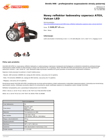 Strefa 998 - profesjonalne wyposażenie straży pożarnej Wietszyce 41 67-221 Białołęka tel: 723 895 900 Nowy reflektor ładowalny szperacz ATEX, Vulcan LED link do produktu: http://strefa998.pl/szperacze/1266-nwoy-reflektor-ladowalny-szperacz-atex-vulcan-led.html Cena: 1 646,97 zł brutto Stan: Nowy Informacje: Lekki akumulator 2 komorowy Li-Ion / 1 x C4 LED |Wysoki: 3,5 h, niski 7,5 h, migający 5,5 h Pełny opis produktu VULCAN LED ATEX to nowoczesny reflektor ładowalny w wykorzystujący najnowsze rozwiązania technologiczne w dziedzinie oświetlenia profesjonalnego. Zastosowane źródło światła C4 LED pozwala na długi czas świecenia do 7,5 godziny. Nowy VULCAN LED ATEX przystosowany jest do stref zagrożonych wybuchem (strefa 2 - gaz, strefa 22 - pył). Niewielka waga wynosząca zaledwie 875 gram pozwala na komfortowe użytkowanie reflektora. Szperacz może pracować na jednym z trzech trybów pracy: - Wysoki, 180 lumenów (100000 cd), zasięg do 632 metrów, czas pracy do 3,5 godziny - Niski, 70 lumenów (400000 cd), zasięg do 400 metrów, czas pracy do 7,5 godziny - Migający, czas pracy do 5,5 godziny Konstrukcja latarki VULCAN LED ATEX charakteryzuje się dużą wytrzymałością, dzięki zastosowaniu materiałów najwyższej jakości. Antystatyczna konstrukcja, ogumowana rączka, nietłukąca soczewka odporna na zarysowania, pasek szybkiego wypięcia to niewątpliwe zalety nowego VULCANA. Reflektor kompatybilny jest z pozostałymi ładowarkami serii VULCAN. ATEX: II 3G Ex ic nA IIC T5 Gc II 3D Ex tc IIIC T54°C Dc FTZU 08 ATEX 0139X IECEx: Ex ic nA IIC T5 Gc Ex tc IIIC T54°C Dc IECEx FTZU 15.0038X Dane szczegółowe Czas ładowania: 5h Czas pracy: Wysoki: 3,5h Niski: 7,5h Migający: 5,5h Materiał: Termoplastyczne ABS Moc światła: Tryb niski: 70 lm Tryb wysoki: 180 lm / 100 000cd Waga z akumulatorem: 875 g Wodoszczelność: IP66 Wymiary: 097 x 127 x 165 mm Zasilanie: lekki akumulator 2 komorowy Li-Ion Źródło światła: 1 x C4 LED 2-03-2017 1/2 Pasek na ramię: 2-03-2017 2/2