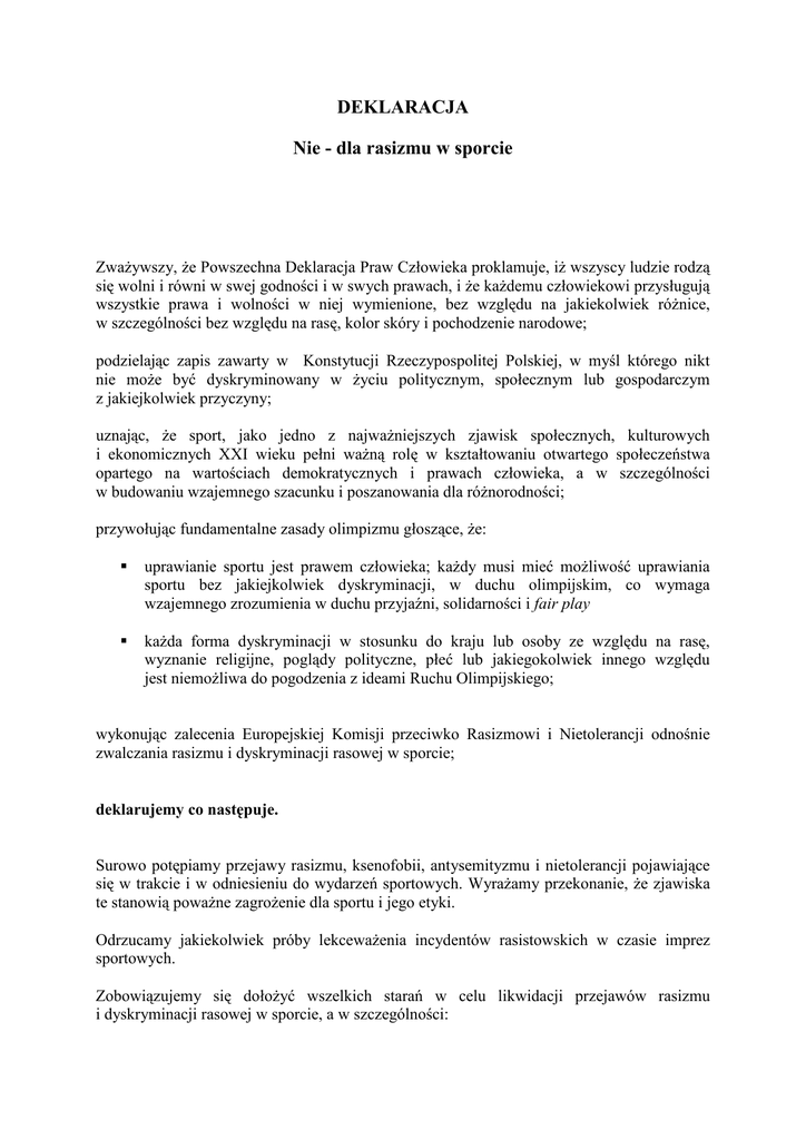DEKLARACJA Nie - dla rasizmu w sporcie ZwaŜywszy, Ŝe Powszechna Deklaracja Praw Człowieka proklamuje, iŜ wszyscy ludzie rodzą się wolni i równi w swej godności i w swych prawach, i Ŝe kaŜdemu człowiekowi przysługują wszystkie prawa i wolności w niej wymienione, bez względu na jakiekolwiek róŜnice, w szczególności bez względu na rasę, kolor skóry i pochodzenie narodowe; podzielając zapis zawarty w Konstytucji Rzeczypospolitej Polskiej, w myśl którego nikt nie moŜe być dyskryminowany w Ŝyciu politycznym, społecznym lub gospodarczym z jakiejkolwiek przyczyny; uznając, Ŝe sport, jako jedno z najwaŜniejszych zjawisk społecznych, kulturowych i ekonomicznych XXI wieku pełni waŜną rolę w kształtowaniu otwartego społeczeństwa opartego na wartościach demokratycznych i prawach człowieka, a w szczególności w budowaniu wzajemnego szacunku i poszanowania dla róŜnorodności; przywołując fundamentalne zasady olimpizmu głoszące, Ŝe: uprawianie sportu jest prawem człowieka; kaŜdy musi mieć moŜliwość uprawiania sportu bez jakiejkolwiek dyskryminacji, w duchu olimpijskim, co wymaga wzajemnego zrozumienia w duchu przyjaźni, solidarności i fair play kaŜda forma dyskryminacji w stosunku do kraju lub osoby ze względu na rasę, wyznanie religijne, poglądy polityczne, płeć lub jakiegokolwiek innego względu jest niemoŜliwa do pogodzenia z ideami Ruchu Olimpijskiego; wykonując zalecenia Europejskiej Komisji przeciwko Rasizmowi i Nietolerancji odnośnie zwalczania rasizmu i dyskryminacji rasowej w sporcie; deklarujemy co następuje. Surowo potępiamy przejawy rasizmu, ksenofobii, antysemityzmu i nietolerancji pojawiające się w trakcie i w odniesieniu do wydarzeń sportowych. WyraŜamy przekonanie, Ŝe zjawiska te stanowią powaŜne zagroŜenie dla sportu i jego etyki. Odrzucamy jakiekolwiek próby lekcewaŜenia incydentów rasistowskich w czasie imprez sportowych. Zobowiązujemy się dołoŜyć wszelkich starań w celu likwidacji przejawów rasizmu i dyskryminacji rasowej w sporcie, a w szczególności: uznać rasizm za waŜny problem sportu na wszystkich poziomach i publicznie demonstrować zaangaŜowanie w zwalczanie tego zjawiska; stworzyć i wdraŜać wewnętrzne mechanizmy, w tym przepisy wewnętrzne, słuŜące przeciwdziałaniu i zwalczaniu rasizmu i związanej z nim dyskryminacji; szkolić słuŜby odpowiedzialne za utrzymanie porządku w czasie imprez sportowych w zapobieganiu i adekwatnym reagowaniu na incydenty o charakterze rasistowskim na obiektach sportowych; odmawiać dostępu do obiektów sportowych osobom posiadającym i rozpowszechniającym rasistowskie, antysemickie i ksenofobiczne symbole, banery i ulotki; wspierać inicjatywy promujące tolerancję i rywalizację sportową w duchu fair play oraz wymianę dobrych praktyk w tym zakresie; budować koalicję przeciwko rasizmowi w sporcie poprzez promowanie współpracy wszystkich zaangaŜowanych środowisk, a w szczególności sportowców, związków sportowych, kibiców i ich stowarzyszeń, klubów sportowych i sponsorów, z udziałem mediów i administracji publicznej. 1. Aeroklub Polski 2. Polski Związek Akrobatyki Sportowej 3. Polski Związek Alpinizmu 4. Polski Związek Badmintona 5. Polski Związek Baseballa i Softballa 6. Polski Związek Biathlonu 7. Polski Związek Bilardowy 8. Polski Związek Bokserski 9. Polski Związek BrydŜa Sportowego 10. Polski Związek Curlingu 11. Polski Związek Gimnastyczny 12. Polski Związek Golfa 13. Polski Związek Hokeja na Lodzie 14. Polski Związek Hokeja na Trawie 15. Polski Związek Jeździecki 16. Polski Związek Judo 17. Polski Związek Ju-Jitsu 18. Polski Związek Kajakowy 19. Polski Związek Karate 20. Polski Związek Karate Fudokan 21. Polski Związek Karate Tradycyjnego 22. Polski Związek Kendo 23. Polski Związek Kick-Boxingu 24. Polski Związek Kolarski 25. Polski Związek Koszykówki 26. Polski Związek Kręglarski 27. Polski Związek Kulturystyki, Fitness I Trójboju Siłowego 28. Polski Związek Lekkiej Atletyki 29. Polski Związek Łuczniczy 30. Polski Związek ŁyŜwiarstwa Figurowego 31. Polski Związek ŁyŜwiarstwa Szybkiego 32. Polski Związek Motorowodny i Narciarstwa Wodnego 33. Polski Związek Motorowy 34. Polski Związek Narciarski 35. Polski Związek Orientacji Sportowej 36. Polski Związek Pięcioboju Nowoczesnego 37. Polski Związek Piłki NoŜnej 38. Związek Piłki Ręcznej w Polsce 39. Polski Związek Piłki Siatkowej 40. Polski Związek Płetwonurkowania 41. Polski Związek Pływacki 42. Polski Związek Podnoszenia CięŜarów 43. Polski Związek Radioorientacji Sportowej 44. Polski Związek Rugby 45. Polski Związek Skibobowy 46. Polski Związek Snookera i Bilarda Angielskiego 47. Polski Związek Snowboardu 48. Polski Związek Sportów Saneczkowych 49. Polski Związek Sportów Wrotkarskich 50. Polski Związek Sportu Psich Zaprzęgów 51. Polski Związek Strzelectwa Sportowego 52. Polski Związek Sumo 53. Polski Związek Szachowy 54. Polski Związek Szermierczy 55. Polski Związek Taekwondo ITF 56. Polski Związek Taekwondo Olimpijskie 57. Polski Związek Tańca Sportowego 58. Polski Związek Tenisa Stołowego 59. Polski Związek Tenisowy 60. Polski Związek Towarzystw Wioślarskich 61. Polski Związek Triathlonu 62. Polski Związek Unihokeja 63. Polski Związek Warcabowy 64. Polski Związek Wędkarski 65. Polski Związek Wu-Shu 66. Polski Związek Zapaśniczy 67. Polski Związek śeglarski 68. Liga Obrony Kraju