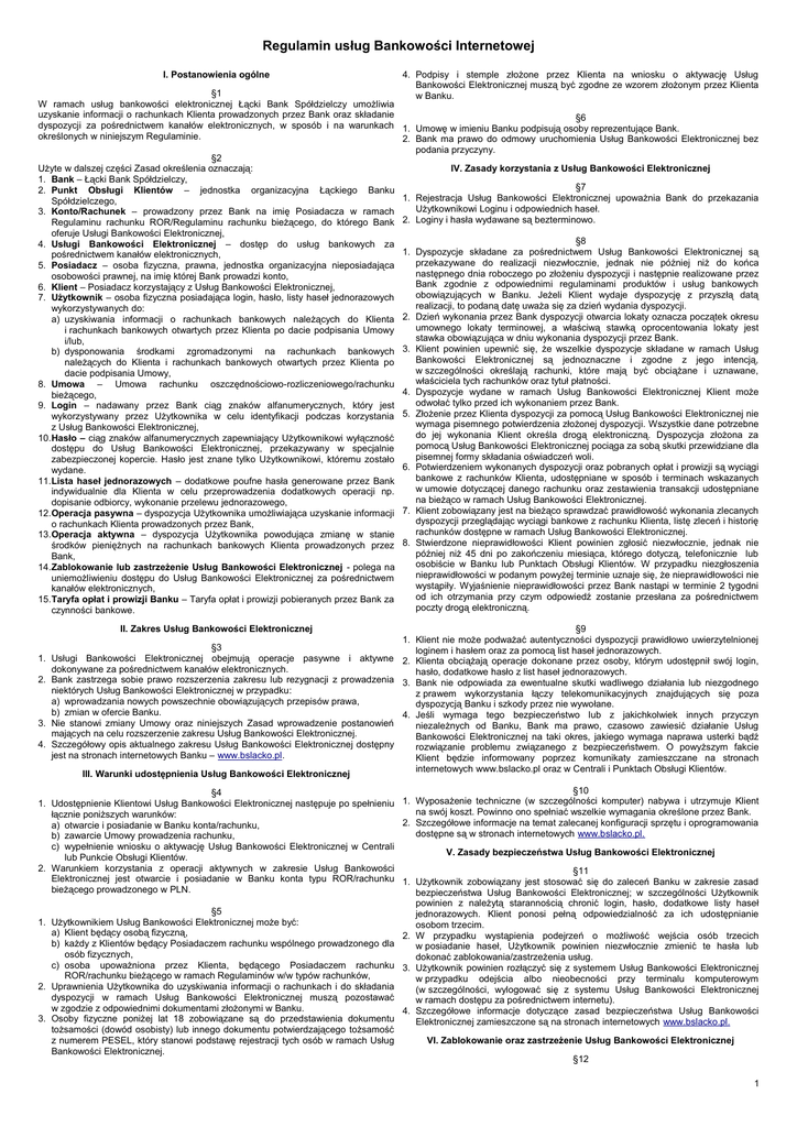 Regulamin usług Bankowości Internetowej I. Postanowienia ogólne 4. Podpisy i stemple złożone przez Klienta na wniosku o aktywację Usług Bankowości Elektronicznej muszą być zgodne ze wzorem złożonym przez Klienta w Banku. §1 W ramach usług bankowości elektronicznej Łącki Bank Spółdzielczy umożliwia uzyskanie informacji o rachunkach Klienta prowadzonych przez Bank oraz składanie §6 dyspozycji za pośrednictwem kanałów elektronicznych, w sposób i na warunkach 1. Umowę w imieniu Banku podpisują osoby reprezentujące Bank. określonych w niniejszym Regulaminie. 2. Bank ma prawo do odmowy uruchomienia Usług Bankowości Elektronicznej bez podania przyczyny. §2 Użyte w dalszej części Zasad określenia oznaczają: IV. Zasady korzystania z Usług Bankowości Elektronicznej 1. Bank – Łącki Bank Spółdzielczy, §7 2. Punkt Obsługi Klientów – jednostka organizacyjna Łąckiego Banku 1. Rejestracja Usług Bankowości Elektronicznej upoważnia Bank do przekazania Spółdzielczego, Użytkownikowi Loginu i odpowiednich haseł. 3. Konto/Rachunek – prowadzony przez Bank na imię Posiadacza w ramach Regulaminu rachunku ROR/Regulaminu rachunku bieżącego, do którego Bank 2. Loginy i hasła wydawane są bezterminowo. oferuje Usługi Bankowości Elektronicznej, §8 4. Usługi Bankowości Elektronicznej – dostęp do usług bankowych za 1. Dyspozycje składane za pośrednictwem Usług Bankowości Elektronicznej są pośrednictwem kanałów elektronicznych, przekazywane do realizacji niezwłocznie, jednak nie później niż do końca 5. Posiadacz – osoba fizyczna, prawna, jednostka organizacyjna nieposiadająca następnego dnia roboczego po złożeniu dyspozycji i następnie realizowane przez osobowości prawnej, na imię której Bank prowadzi konto, Bank zgodnie z odpowiednimi regulaminami produktów i usług bankowych 6. Klient – Posiadacz korzystający z Usług Bankowości Elektronicznej, obowiązujących w Banku. Jeżeli Klient wydaje dyspozycję z przyszłą datą 7. Użytkownik – osoba fizyczna posiadająca login, hasło, listy haseł jednorazowych realizacji, to podaną datę uważa się za dzień wydania dyspozycji. wykorzystywanych do: a) uzyskiwania informacji o rachunkach bankowych należących do Klienta 2. Dzień wykonania przez Bank dyspozycji otwarcia lokaty oznacza początek okresu umownego lokaty terminowej, a właściwą stawką oprocentowania lokaty jest i rachunkach bankowych otwartych przez Klienta po dacie podpisania Umowy stawka obowiązująca w dniu wykonania dyspozycji przez Bank. i/lub, b) dysponowania środkami zgromadzonymi na rachunkach bankowych 3. Klient powinien upewnić się, że wszelkie dyspozycje składane w ramach Usług Bankowości Elektronicznej są jednoznaczne i zgodne z jego intencją, należących do Klienta i rachunkach bankowych otwartych przez Klienta po w szczególności określają rachunki, które mają być obciążane i uznawane, dacie podpisania Umowy, właściciela tych rachunków oraz tytuł płatności. 8. Umowa – Umowa rachunku oszczędnościowo-rozliczeniowego/rachunku 4. Dyspozycje wydane w ramach Usług Bankowości Elektronicznej Klient może bieżącego, odwołać tylko przed ich wykonaniem przez Bank. 9. Login – nadawany przez Bank ciąg znaków alfanumerycznych, który jest wykorzystywany przez Użytkownika w celu identyfikacji podczas korzystania 5. Złożenie przez Klienta dyspozycji za pomocą Usług Bankowości Elektronicznej nie wymaga pisemnego potwierdzenia złożonej dyspozycji. Wszystkie dane potrzebne z Usług Bankowości Elektronicznej, do jej wykonania Klient określa drogą elektroniczną. Dyspozycja złożona za 10.Hasło – ciąg znaków alfanumerycznych zapewniający Użytkownikowi wyłączność pomocą Usług Bankowości Elektronicznej pociąga za sobą skutki przewidziane dla dostępu do Usług Bankowości Elektronicznej, przekazywany w specjalnie pisemnej formy składania oświadczeń woli. zabezpieczonej kopercie. Hasło jest znane tylko Użytkownikowi, któremu zostało 6. Potwierdzeniem wykonanych dyspozycji oraz pobranych opłat i prowizji są wyciągi wydane. bankowe z rachunków Klienta, udostępniane w sposób i terminach wskazanych 11.Lista haseł jednorazowych – dodatkowe poufne hasła generowane przez Bank w umowie dotyczącej danego rachunku oraz zestawienia transakcji udostępniane indywidualnie dla Klienta w celu przeprowadzenia dodatkowych operacji np. na bieżąco w ramach Usług Bankowości Elektronicznej. dopisanie odbiorcy, wykonanie przelewu jednorazowego, 12.Operacja pasywna – dyspozycja Użytkownika umożliwiająca uzyskanie informacji 7. Klient zobowiązany jest na bieżąco sprawdzać prawidłowość wykonania zlecanych dyspozycji przeglądając wyciągi bankowe z rachunku Klienta, listę zleceń i historię o rachunkach Klienta prowadzonych przez Bank, rachunków dostępne w ramach Usług Bankowości Elektronicznej. 13.Operacja aktywna – dyspozycja Użytkownika powodująca zmianę w stanie środków pieniężnych na rachunkach bankowych Klienta prowadzonych przez 8. Stwierdzone nieprawidłowości Klient powinien zgłosić niezwłocznie, jednak nie później niż 45 dni po zakończeniu miesiąca, którego dotyczą, telefonicznie lub Bank, osobiście w Banku lub Punktach Obsługi Klientów. W przypadku niezgłoszenia 14.Zablokowanie lub zastrzeżenie Usług Bankowości Elektronicznej - polega na nieprawidłowości w podanym powyżej terminie uznaje się, że nieprawidłowości nie uniemożliwieniu dostępu do Usług Bankowości Elektronicznej za pośrednictwem wystąpiły. Wyjaśnienie nieprawidłowości przez Bank nastąpi w terminie 2 tygodni kanałów elektronicznych, od ich otrzymania przy czym odpowiedź zostanie przesłana za pośrednictwem 15.Taryfa opłat i prowizji Banku – Taryfa opłat i prowizji pobieranych przez Bank za poczty drogą elektroniczną. czynności bankowe. II. Zakres Usług Bankowości Elektronicznej 1. 2. 3. 4. §9 1. Kl