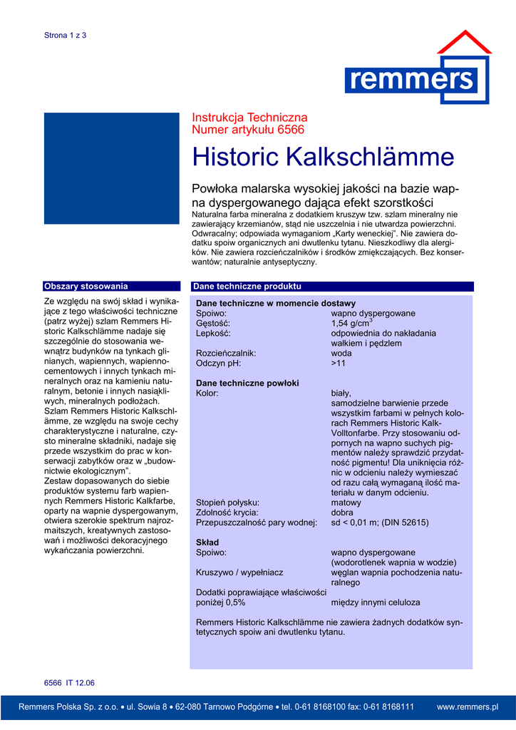 Strona 1 z 3 Instrukcja Techniczna Numer artykułu 6566 Historic Kalkschlämme Powłoka malarska wysokiej jakości na bazie wapna dyspergowanego dająca efekt szorstkości Naturalna farba mineralna z dodatkiem kruszyw tzw. szlam mineralny nie zawierający krzemianów, stąd nie uszczelnia i nie utwardza powierzchni. Odwracalny; odpowiada wymaganiom „Karty weneckiej”. Nie zawiera dodatku spoiw organicznych ani dwutlenku tytanu. Nieszkodliwy dla alergików. Nie zawiera rozcieńczalników i środków zmiękczających. Bez konserwantów; naturalnie antyseptyczny. Obszary stosowania Ze względu na swój skład i wynikające z tego właściwości techniczne (patrz wyżej) szlam Remmers Historic Kalkschlämme nadaje się szczególnie do stosowania wewnątrz budynków na tynkach glinianych, wapiennych, wapiennocementowych i innych tynkach mineralnych oraz na kamieniu naturalnym, betonie i innych nasiąkliwych, mineralnych podłożach. Szlam Remmers Historic Kalkschlämme, ze względu na swoje cechy charakterystyczne i naturalne, czysto mineralne składniki, nadaje się przede wszystkim do prac w konserwacji zabytków oraz w „budownictwie ekologicznym”. Zestaw dopasowanych do siebie produktów systemu farb wapiennych Remmers Historic Kalkfarbe, oparty na wapnie dyspergowanym, otwiera szerokie spektrum najrozmaitszych, kreatywnych zastosowań i możliwości dekoracyjnego wykańczania powierzchni. Dane techniczne produktu Dane techniczne w momencie dostawy Spoiwo: wapno dyspergowane 3 Gęstość: 1,54 g/cm Lepkość: odpowiednia do nakładania wałkiem i pędzlem Rozcieńczalnik: woda Odczyn pH: >11 Dane techniczne powłoki Kolor: Stopień połysku: Zdolność krycia: Przepuszczalność pary wodnej: Skład Spoiwo: Kruszywo / wypełniacz biały, samodzielne barwienie przede wszystkim farbami w pełnych kolorach Remmers Historic KalkVolltonfarbe. Przy stosowaniu odpornych na wapno suchych pigmentów należy sprawdzić przydatność pigmentu! Dla uniknięcia różnic w odcieniu należy wymieszać od razu całą wymaganą ilość materiału w danym odcieniu. matowy dobra sd < 0,01 m; (DIN 52615) wapno dyspergowane (wodorotlenek wapnia w wodzie) węglan wapnia pochodzenia naturalnego Dodatki poprawiające właściwości poniżej 0,5% między innymi celuloza Remmers Historic Kalkschlämme nie zawiera żadnych dodatków syntetycznych spoiw ani dwutlenku tytanu. 6566 IT 12.06 Remmers Polska Sp.Sp. z o.o. • ul.• Sowia 8 • 862-080 Tarnowo Podgórne • tel. 0-61 8168100 fax:fax: 0-61 8168111 Remmers Polska z o.o. ul. Sowia • 62-080 Tarnowo Podgórne • tel. 0-61 8168100 0-61 8168111 www.remmers.pl www.remmers.pl Strona 2 z 3 Właściwości produktu Podłoże Podstawowymi składnikami szlamu wapiennego Remmers Historic Kalkschlämme są wapno dyspergowane jako spoiwo oraz wypełniacze węglanowe. Remmers Historic Kalkschlämme nie zawiera dyspersji tworzyw sztucznych. Jako naturalny szlam mineralny, Remmers Historic Kalkschlämme nie zawiera krzemianów i nie wytwarza krzemionki podczas wiązania z podłożem. Dlatego nie działa na powierzchnię podłoża uszczelniająco ani utwardzająco i przez to jest całkowicie odwracalny. Szlam Remmers Historic Kalkschlämme wykazuje aktywność kapilarną, tzn. jest przepuszczalny nie tylko dla pary wodnej, ale także dla wody w stanie ciekłym. Podłoże musi być suche, czyste, nośne, pozbawione luźnych cząstek, pyłu, środków do szalunków, pozostałości oleistych i tłustych. Słabo przylegające powłoki oraz stare, zniszczone farby dyspersyjne należy starannie usunąć. Przypowierzchniowe warstwy nasycone spoiwem („spiek”) na podłożach przeznaczonych do pokrycia powłoką należy najpierw usunąć. Stare powłoki klejowe i wapienne należy całkowicie zmyć. Wybrane surowce wysokiej jakości oraz opatentowana technologia przygotowania spoiwa zapewniają dobre krycie, bardzo łatwe nakładanie i inne pozytywne właściwości techniczne szlamu Remmers Historic Kalkschlämme: Podczas wykonywania powłoki należy przestrzegać wytycznych wykonawczych VOB, część C rozdział 3.1.3. Dla uniknięcia śladów łączenia, większe połączone ze sobą powierzchnie należy pokrywać w jednym ciągu, bez przerw. wysoką dyfuzyjność aktywność kapilarną matowość brak naprężeń wysoką przyczepność na podłożach mineralnych odporność na czynniki atmosferyczne wysoką odporność na zmiany zamrażanie-rozmrażanie brak szkodliwości dla środowiska Szpachlowanie Nierówne, nośne powierzchnie i ubytki oraz powierzchnie o różnej chłonności należy wyrównać wcześniej szpachlówką Remmers Historic Kalkspachtel (nr art. 6562). Dzięki wysokiej zasadowości spoiwa „wapno dyspergowane” szlam Remmers Historic Kalkschlämme posiada naturalną ochronę przed grzybami pleśniowymi. Remmers Historic Kalkschlämme nie zawiera dodatków biobójczych lub grzybobójczych. Cel stosowania: Remmers Historic Kalkschlämme jest łatwą do nakładania powłoką szlamową. Materiał ten stosowany jest jako wypełniająca powłoka do wyrównania zróżnicowanych szorstkości tynku oraz do przeszlamowania rys skurczowych o rozwartości do 0,2 mm. Mocno chłonące podłoża, przed naniesieniem powłoki Remmers Historic Kalkschlämme, należy zmoczyć. Chłonność podłoża należy sprawdzić na wystarczająco dużej powierzchni próbnej. Sposób stosowania Przed zastosowaniem szlam Remmers Historic Kalkschlämme należy dokładnie wymieszać! Struktura powłoki Po odpowiednim przygotowaniu podłoża nanosi się szlam Remmers Historic Kalkschlämme w dwóch cyklach. W zależności od celu stosowania można rozcieńczyć szlam dodając maks. 10% wody. Technologia nakładania Szlam nakłada się pędzlem lub wałkiem. Nie nakładać przy temperaturach poniżej +8°C (temperatura podłoża i powietrza). Czas schnięcia Przy temperaturze +20°C i wilgotności względnej powietrza 65% można dotykać po 4 do 6 godzinach, po 24 godzinach można nakł