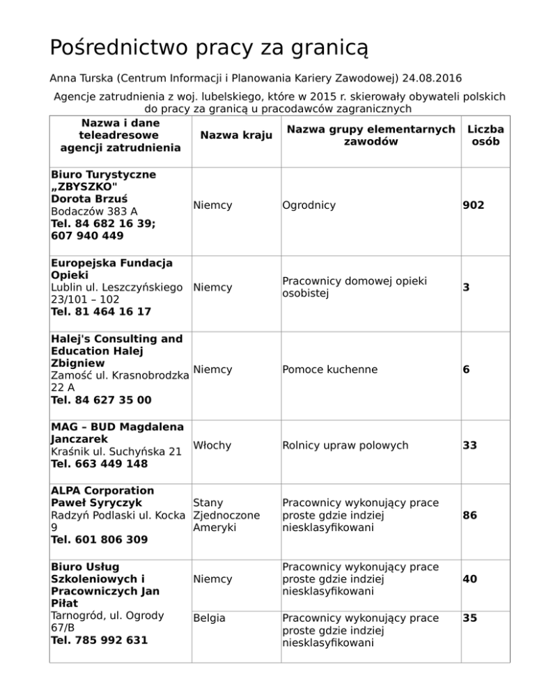 Agencje zatrudnienia z woj. lubelskiego, które w 2015 r. skierowały obywateli polskich