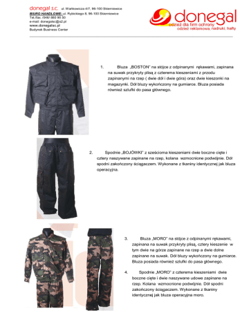 donegal s.c. ul. Wańkowicza 4/7, 96-100 Skierniewice BIURO HANDLOWE: ul. Rybickiego 8, 96-100 Skierniewice Tel./fax. /046/ 880 90 50 e-mail: [email protected] www.donegalsc.pl Budynek Business Center _________________________________________________________________________________ 1. Bluza „BOSTON” na stójce z odpinanymi rękawami, zapinana na suwak przykryty plisą z czterema kieszeniami z przodu zapinanymi na rzep ( dwie dół i dwie góra) oraz dwie kieszonki na magazynki. Dół bluzy wykończony na gumiarce. Bluza posiada również szlufki do pasa głównego. 2. Spodnie „BOJÓWKI” z sześcioma kieszeniami dwie boczne cięte i cztery naszywane zapinane na rzep, kolana wzmocnione podwójnie. Dół spodni zakończony ściągaczem. Wykonane z tkaniny identycznej jak bluza operacyjna. 3. 4. Bluza „MORO” na stójce z odpinanymi rękawami, zapinana na suwak przykryty plisą, cztery kieszenie w tym dwie na górze zapinane na rzep a dwie dolne zapinane na suwak. Dół bluzy wykończony na gumiarce. Bluza posiada również szlufki do pasa głównego. Spodnie „MORO” z czterema kieszeniami dwie boczne cięte i dwie naszywane udowe zapinane na rzep. Kolana wzmocnione podwójnie. Dół spodni zakończony ściągaczem. Wykonane z tkaniny identycznej jak bluza operacyjna moro. donegal s.c. ul. Wańkowicza 4/7, 96-100 Skierniewice BIURO HANDLOWE: ul. Rybickiego 8, 96-100 Skierniewice Tel./fax. /046/ 880 90 50 e-mail: [email protected] www.donegalsc.pl Budynek Business Center _________________________________________________________________________________ 5. 7. 8. Bluza polar wykonana z dzianiny. Wzmocnione tkaniną barki i łokcie, kieszeń na piersi, pagony. Może być zapinana na krótki lub długi suwak. Dół bluzy wykończony na gumiarce. Dwie kieszenie boczne cięte. Koszulka typu t-shirt do ochrony z 100% bawełny o gramaturze 195 g/m² w różnej gamie kolorystycznej. Napis z przodu i z tyłu. Koszule służbowe z długim lub krótkim rękawem, dwoma kieszeniami z patkami oraz pagonami. Kolory różne. Możliwość wyboru koloru patek i pagonów . Tkanina o składzie 65% bawełna, 35% poliester. donegal s.c. ul. Wańkowicza 4/7, 96-100 Skierniewice BIURO HANDLOWE: ul. Rybickiego 8, 96-100 Skierniewice Tel./fax. /046/ 880 90 50 e-mail: [email protected] www.donegalsc.pl Budynek Business Center _________________________________________________________________________________ 9. Kurtka krótka zimowa typu „KONWÓJ” – na ocieplaczu ( pikówka ) z dwoma kieszeniami na piersiach i z dwoma kieszeniami dolnymi. Na dole kurtki ściągacz. Kurtka posiada również szlufki do pasa głównego. Zamek błyskawiczny kryty listwą zapinaną na rzep. Stójka obszyta polarem, kaptur odpinany i ocieplany. Kurtka wykonana z materiału wodoodpornego i oddychającego. 10. Kurtka ¾ zimowa typu „OBIEKTÓWKA” na ocieplaczu ( pikówka) z dwoma kieszeniami na piersiach i z dwoma kieszeniami dolnymi. Na dole kurtki ściągacz typu sznurek. Kurtka zapinana na zamek błyskawiczny kryty listwą zapinaną na rzep. Stójka obszyta polarem, kaptur odpinany i ocieplany. Kurtka wykonana z materiału wodoodpornego i oddychającego.