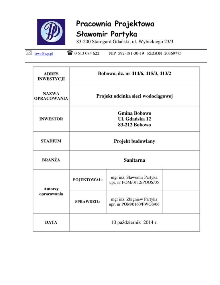 Pracownia Projektowa Sławomir Partyka 83-200 Starogard Gdański, ul. Wybickiego 23/3 [email protected] 0 513 084 622 ADRES INWESTYCJI NIP 592-181-30-19 REGON 20369775 Bobowo, dz. nr 414/6, 415/3, 413/2 NAZWA OPRACOWANIA Projekt odcinka sieci wodociągowej INWESTOR Gmina Bobowo Ul. Gdańska 12 83-212 Bobowo STADIUM Projekt budowlany BRANŻA Sanitarna POJEKTOWAŁ: mgr inż. Sławomir Partyka upr. nr POM/0112/POOS/05 SPRAWDZIŁ: mgr inż. Zbigniew Partyka upr. nr POM/0160/PWOS/06 Autorzy opracowania DATA 10 październik 2014 r. 2 OPIS TECHNICZNY do projektu zaopatrzenia w wodę działki budowlanej w m. Bobowo 1. PODSTAWA OPRACOWANIA Podstawą opracowania projektu jest zlecenie inwestora 2. MATERIAŁY WYJŚCIOWE - Wizja lokalna, wywiad i pomiary w terenie Uzgodnienie zakresu opracowania ze zleceniodawcą Obowiązujące normy i przepisy Warunki celu publicznego Mapa do celów projektowych skala 1:1000 3. CEL I ZAKRES OPRACOWANIA Celem niniejszego opracowania jest uzbrojenie terenu w wodę działek budowlanych zabudowy mieszkaniowej jednorodzinnej w Sucuminie zapewniając potrzeby bytowe w budynkach i do podlewania zieleni Zagadnienie obejmuje sieć wodociągową z rur PVC Dz 90mm PN-10 o łącznej długości 283,0 m 4. CHARAKTERYSTYKA TECHNICZNA SIECI WODOCIĄGOWEJ Wzdłuż drogi przebiega istniejąca sieć wodociągowa z rur PCV o średnicy Dz 90mm, która posiada wystarczającą rezerwę wydajności co umożliwia zasilanie projektowanego odcinka sieci wodociągowej. Zaprojektowany odcinek sieci wodociągowej włączony będzie do istniejącego przewodu poprzez wcinkę i wstawienie trójnika. Na odgałęzieniu od istniejącej sieci należy zamontować zasuwę dn 80 z uszczelnieniem miękkim. Przewody projektowanej sieci wykonać z rur PVC PN-10 o średnicy Dz 90mm ułożyć zgodnie z projektem zagospodarowania. Głębokość posadowienia 1,7 m. Minimalne przykrycie przewodów gruntem wynosi 1,5 m. MATERIAŁ Do wykonania wodociągu przewiduje się zastosowanie rur PVC PN 10 wg. normy PN-74/C89200 (Rury z nieplastyfikowanego polichlorku winylu-wymiary) PN-74/C-89204 ( Wymagania i badania ) PN-74/C-89202 ( Kształtki z PVC do rur ciśnieniowych ) Większość obecnie produkowanych w kraju odpowiada warunkom stawianym przez wyżej wymienione normy . Zgodnie z ustaleniami z dostawcą wody w projekcie przyjęto zastosowanie rur producenta Wavin Metaplast Buk i na indeksy materiałowe tego producenta będę powoływał się w dalszej części opisu. Na etapie wykonawstwa można zastosować rury innego producenta o ile odpowiadają one normom i posiadają konieczne aprobaty techniczne i opinie higieniczne. Do wykonania wodociągu przyjęto rury ciśnieniowe kielichowe z uszczelką wargową na ciśnienie 10 barów. 3 Armatura W projekcie przyjęto zastosowanie armatury produkcji Akwa Gniezno posiadającej aktualne aprobaty techniczne oraz świadectwa badań. - zasuwy klinowe płaskie fig 011 miękko doszczelniane - DN 80 - hydrant ppoż. poddziemny DN 80 z automatycznym odwodnieniem kolumny hydrantu. − trójnik kołnierzowy 150/80/150 - kolano stopowe, dwu kołnierzowe DN 80 - opaski nawiertnicze dn90/40 - teleskopowe obudowy do zasuw, skrzynki żeliwne do zasuw, i hydrantów Przy doborze producenta rur oraz armatury kierowano się jakością wykonania materiałowego, posiadanymi aprobatami i opiniami technicznymi, ceną oraz ujednoliceniem całego systemu ciśnieniowego. Nie zaleca się wykonania sieci z materiałów różnych producentów. Szczegółowy opis wraz z podaniem typu kształtek w rozrysowaniu węzłów montażowych. OZNAKOWANIE TRASY Trasę wodociągu, zasuw, hydrantów oznakować trwale w terenie tabliczkami wykonanymi zgodnie z normą PN-86/B-09700-2. Montaż tabliczek na słupkach stalowych o średnicy min ∅ 32 mm. POMIARY Projektowana trasa przewodu wodociągowego powinna być trwale i widocznie oznaczona i zabezpieczona. Oznaczenie trasy powinno być dokonane przez wbicie kołków i świadków, a wzdłuż trasy powinny znajdować się stałe lub prowizoryczne repery, dla których rzędne powinny być sprawdzone i podane poprzez upoważnione władze geodezyjne. Do obowiązków kierownictwa budowy należą pomiary niwelacyjne, tyczenie trasy, rozbicie trasy przez wyznaczenie punktów uzbrojenia sieci i odgałęzień, rozkładanie wykopów. Pomiary niwelacyjne polegają na ustawieniu na określonym poziomie łat celowniczych nad wykopem oraz sprawdzeniu poziomu posadowienia w wykopie przewodu i uzbrojenia. Tyczenie trasy stanowi nawiązanie charakterystycznych punktów trasy do punktów stałych w terenie oraz wyznaczenie za pomocą zabitych kołków i świadków przebiegu osi przewodu osi przewodu. Wszystkie załamania trasy muszą być określone przez punkt przecięcia osi dwóch kierunków oraz podanie kątów załamania trasy. ROBOTY ZIEMNE - WYKOPY I ZASYPKA Wykopy pod przewody wodociągowe z rur PVC powinny być prowadzone zgodnie z przepisami zawartymi w normie branżowej, ustanowionej przez Instytut Kształtowania Środowiska : BN-83/8836-02 „Przewody podziemne. Roboty ziemne. Wymagania i badania przy odbiorze”, obowiązującej od dnia 01.07.84 w powiązaniu z PN-86/B-02480 „Grunty budowlane. Podział, nazwy, symbole i określenia”. - Norma PN-83/8836-02 zawiera w zakresie wymagań przepisy dotyczące: wykopów otwartych obudowanych z uwzględnieniem szczególnych bezpieczeństwa pracy, warunków 4 - zabezpieczenia wykopów przed zalaniem wodą z opadów atmosferycznych, - wykopów otwartych o ścianach pionowych bez obudowy, - minimalnej szerokości wykopów, - zasypywania przewodu Na trasie projektowanego wodociągu występuje grunt kat. III-IV RODZAJE WYKOPÓW Dla potrzeb budowy przewodów wodociągowych z rur PVC stosowane są wykopy ciągłe, wąsko przestrzenne o ścianach pionowych odeskowanych i rozpartych lub ścianach skarpowych bez obudowy. Generalną zasadą w nawiązaniu do badań bhp jest, aby przy głębokościach większych niż 1 m, niezależnie 