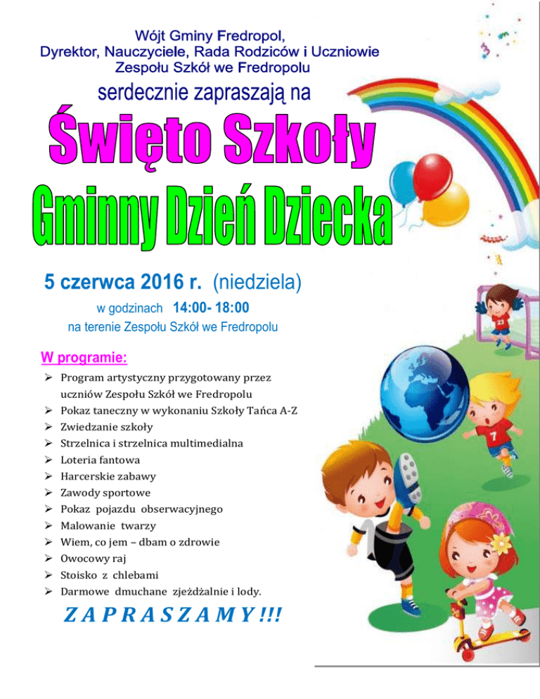 5 czerwca 2016 r. (niedziela) w godzinach 14:00- 18:00 na terenie Zespołu Szkół we Fredropolu W programie: Program artystyczny przygotowany przez uczniów Zespołu Szkół we Fredropolu Pokaz taneczny w wykonaniu Szkoły Tańca A-Z Zwiedzanie szkoły Strzelnica i strzelnica multimedialna Loteria fantowa Harcerskie zabawy Zawody sportowe Pokaz pojazdu obserwacyjnego Malowanie twarzy Wiem, co jem – dbam o zdrowie Owocowy raj Stoisko z chlebami Darmowe dmuchane zjeżdżalnie i lody. Z A P R A S Z A M Y !!!